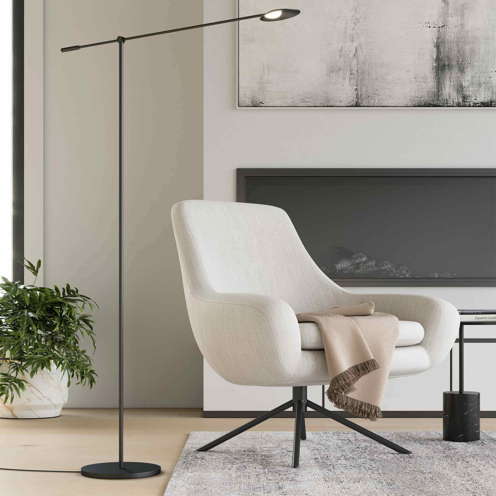 Definition and minimalism intersect in the sleek Rotaire LED Floor Lamp from Kuzco Lighting, bringing a sense of contemporary calm to a living room, home office, or bedroom. Stylize a modern space with this geometric-inspired floor lamp offering energy-efficient lighting from a black finish frame and directional up or down lighting.