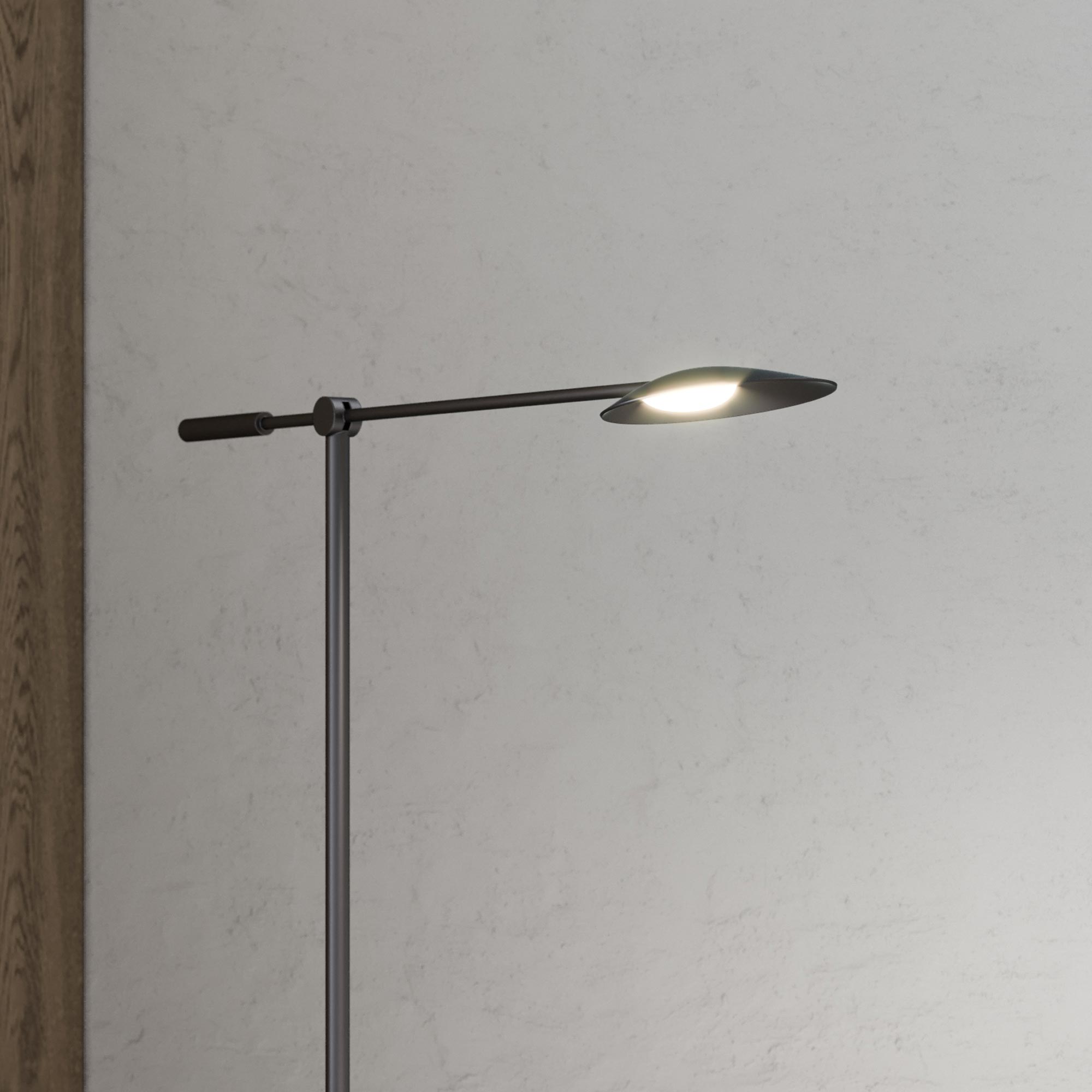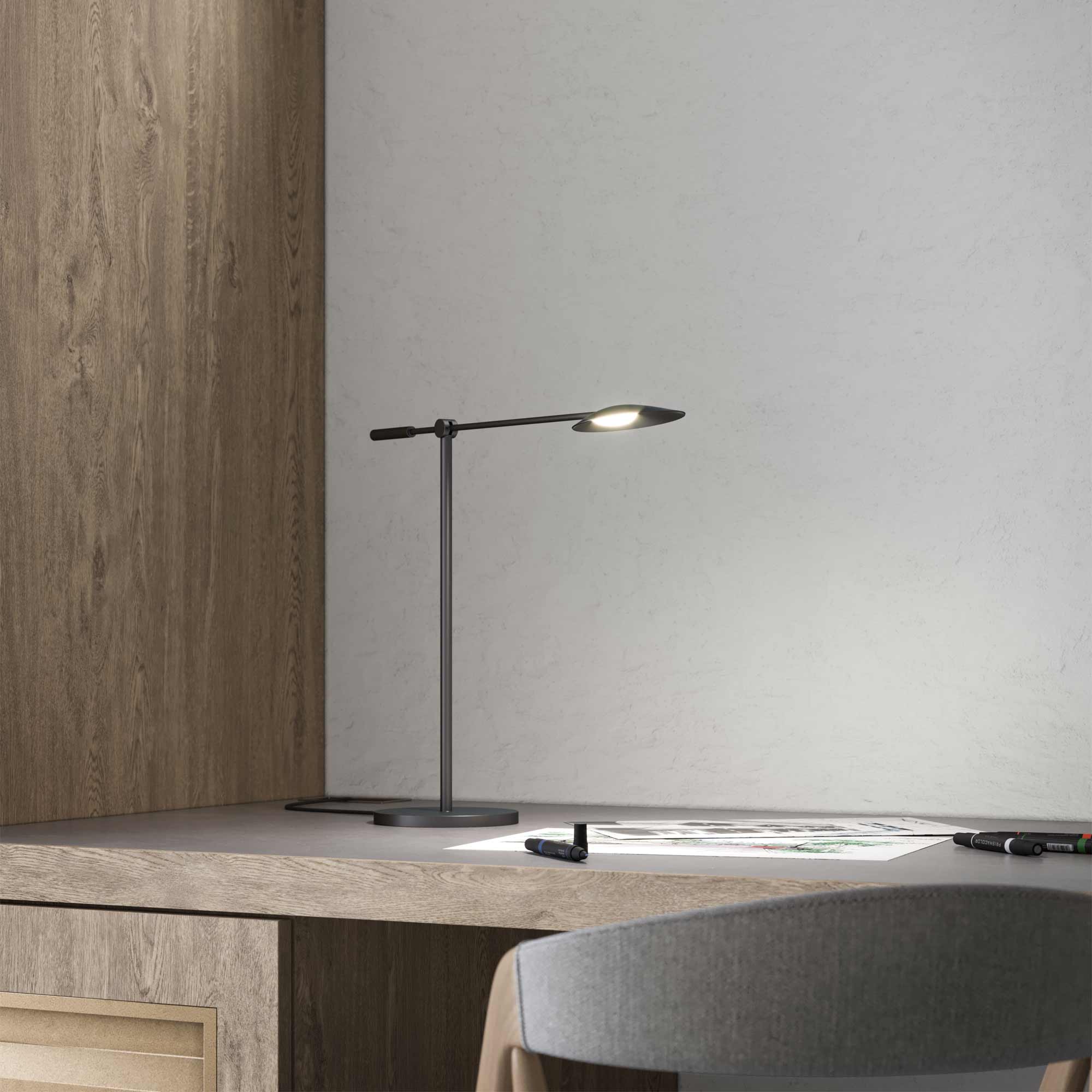 Crafted of basic black finish metal, the Rotaire LED Table Lamp from Kuzco Lighting is a perfect complement to home office or living spaces in search of minimalist style. Energy-efficient illumination ups the ante on this modernistic table lamp with an asymmetrical shape and chic disk shade delivering adjustable lighting angles, with a cordless charger and USB charging port added for good measure.