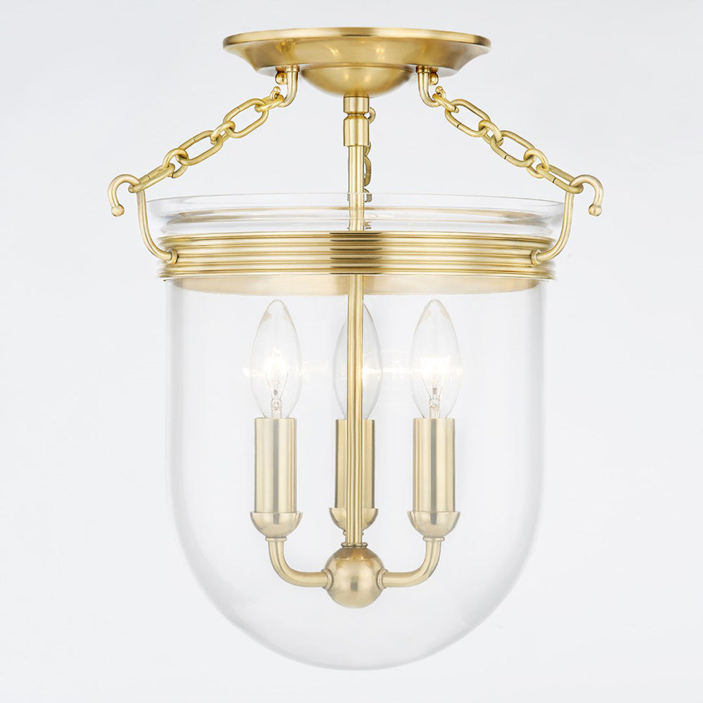 Decadence and fragility go hand in hand to add a glam look to custom spaces in need of accent and ambient lighting. The Rousham Semi-Flush Mount Ceiling Light from Hudson Valley Lighting offers a sparkling clear glass inverted bell shade, dressed up with lush aged brass finish metal framing and accents. A candelabra-style lamping unit showers romantic artistry on a light fixture with promise.