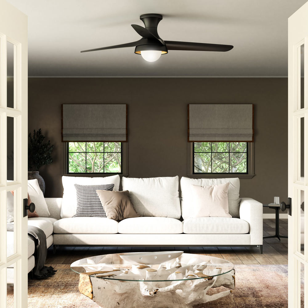 Vintage personality infuses the Rubio LED Flush Mount Ceiling Fan from Alora Mood to create a compelling design that complements perfectly in a modern living space. Three blades create welcome air circulation, while an LED light delivers ambient illumination. The half-shade design pairs with a matte opal glass globe and contrasting golden interior to create the perfect warm, inviting ambiance in a living area, den, or bedroom.