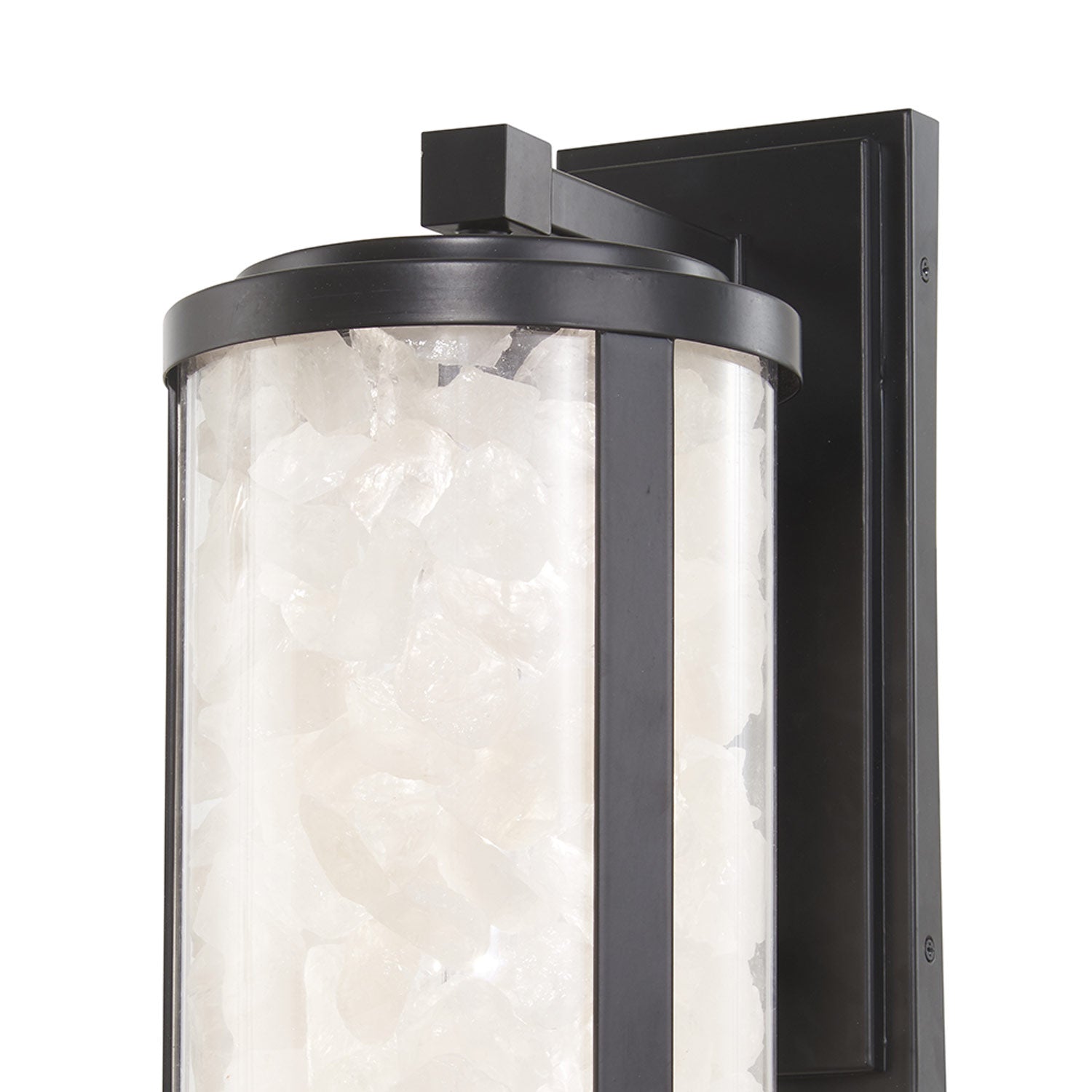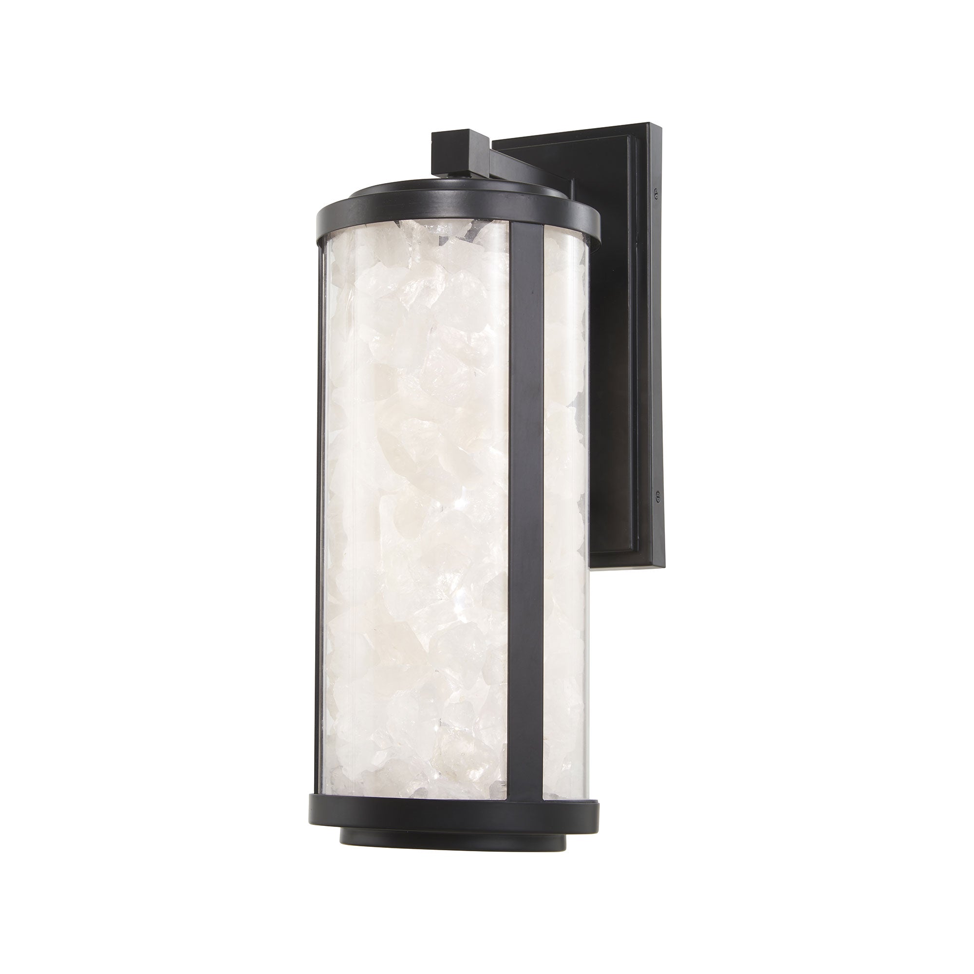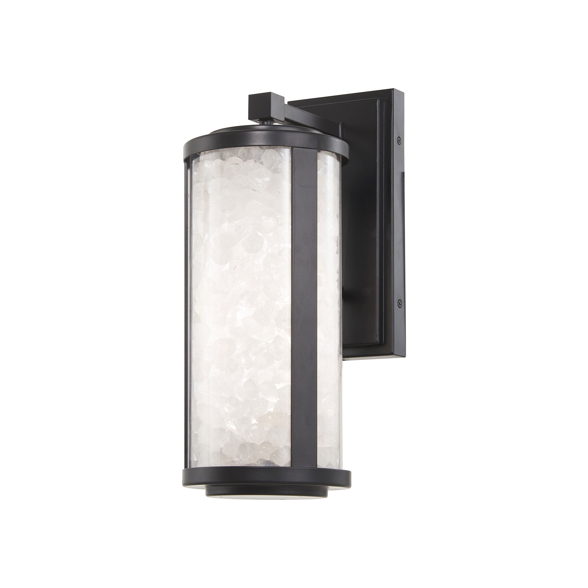A delightful use of materials embellishes classic lantern-inspired design elements, delivering a textural motif to a chic exterior fixture. The Salt Creek Outdoor LED Wall Light from The Great Outdoors blends classic metal framing with a cylinder glass shade, and rock-chip like pieces collecting to reflect illumination with an extraordinary impact.