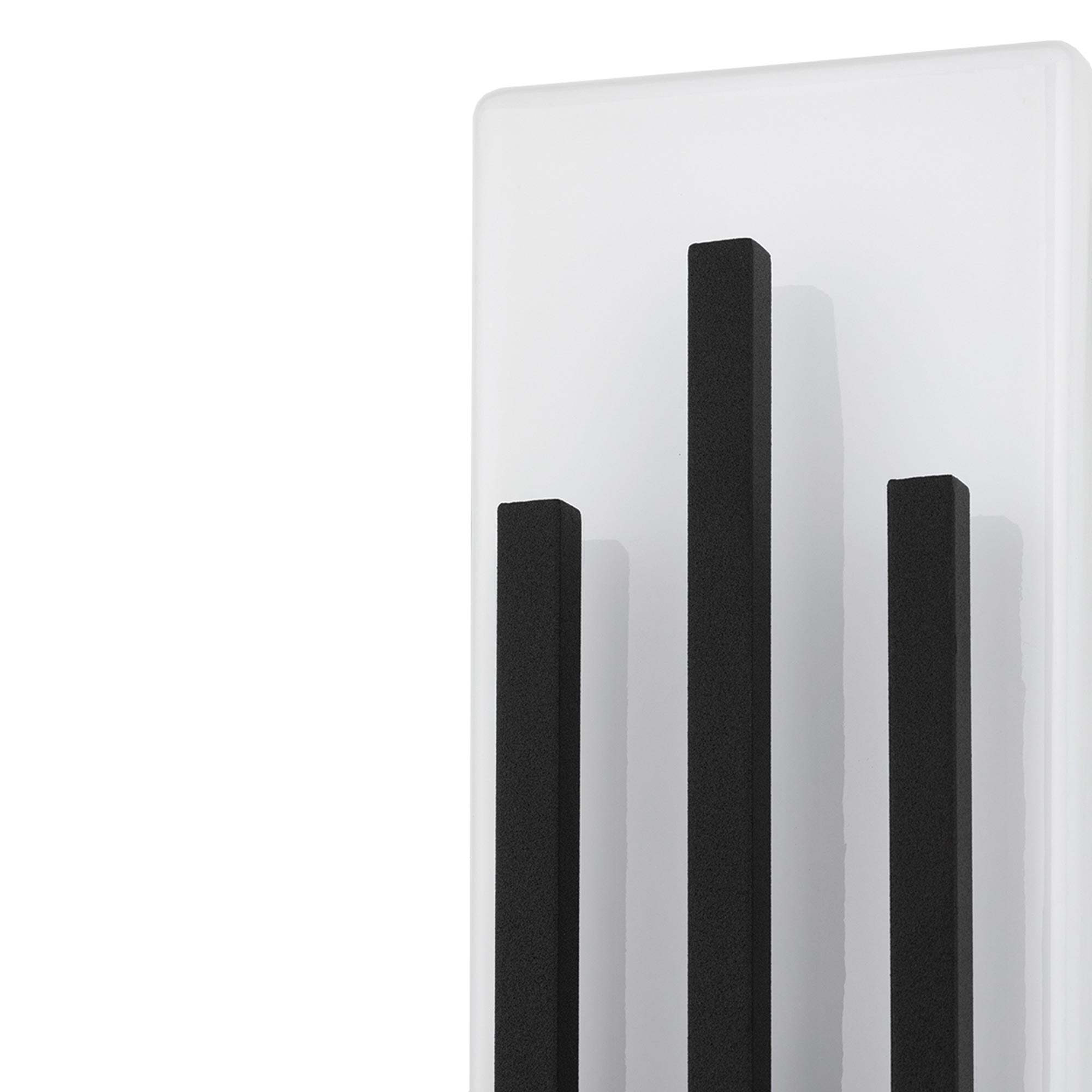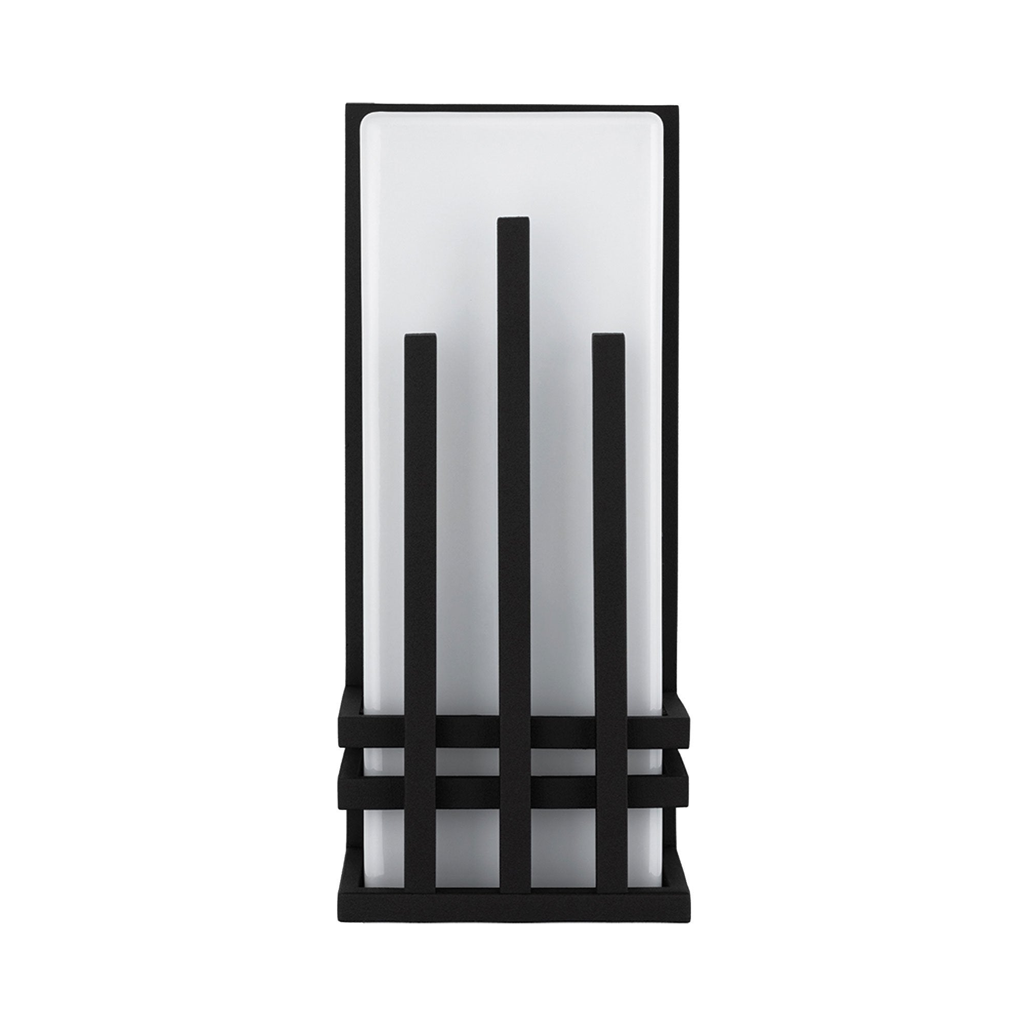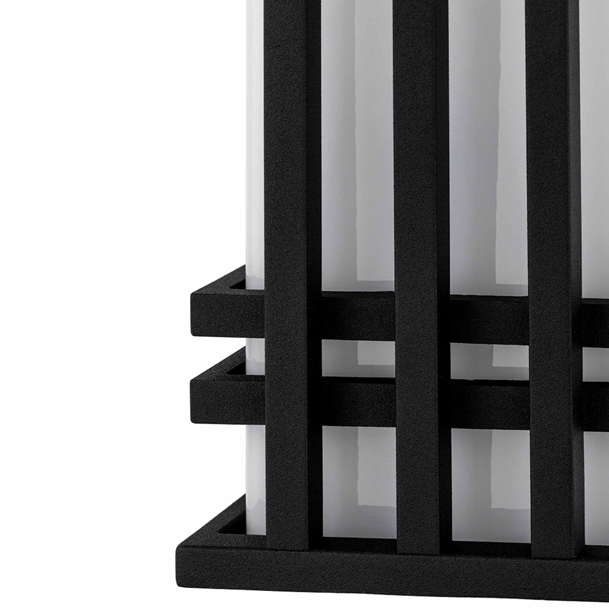 A trio of uneven, textured-black bars stand guard over a rectangular shade, drawing the eye and making a bold statement. The shiny opal glass shade is closed at the top, encasing the light and sending back a warm glow. This indoor/outdoor design is available as a pendant, post light and sconce in two different sizes.