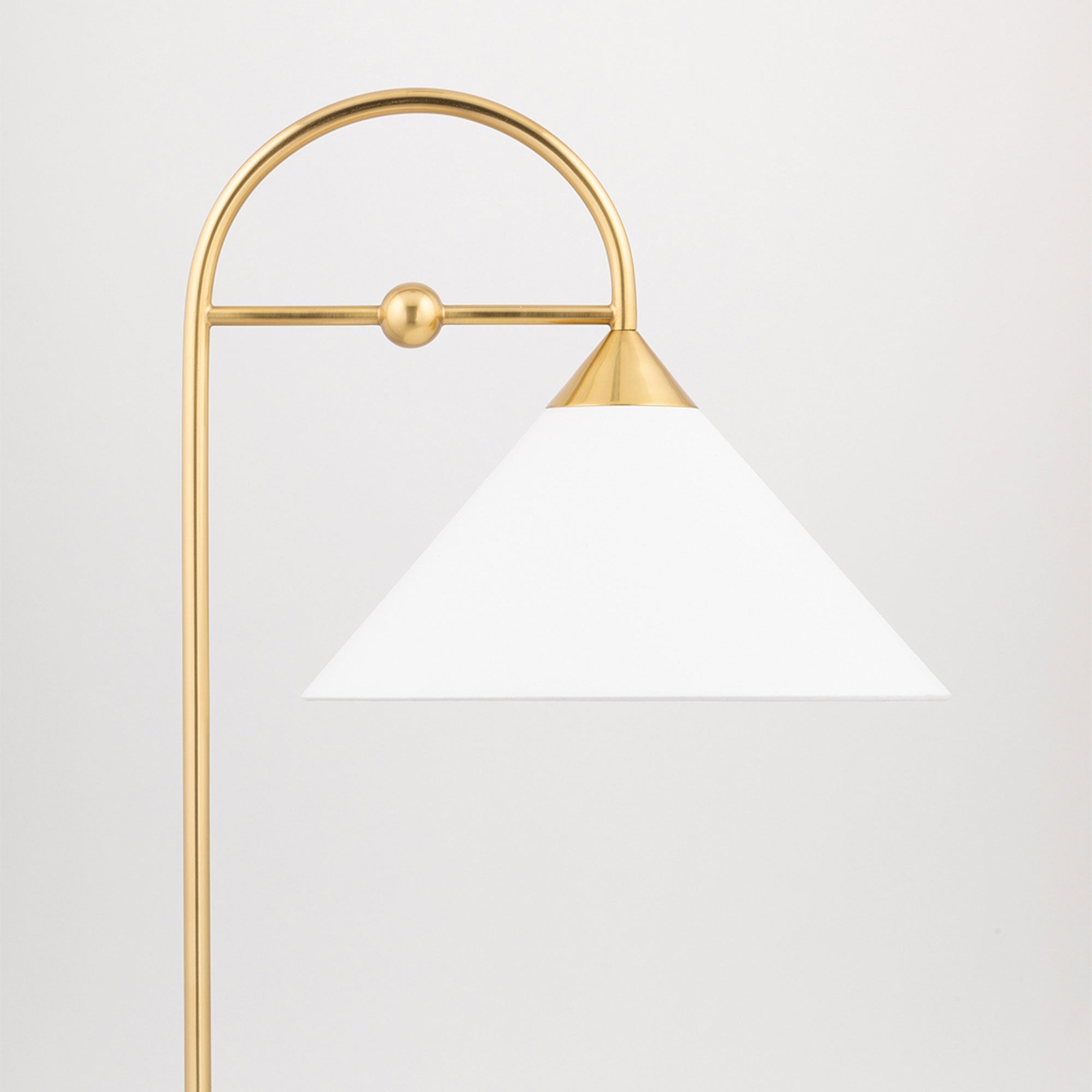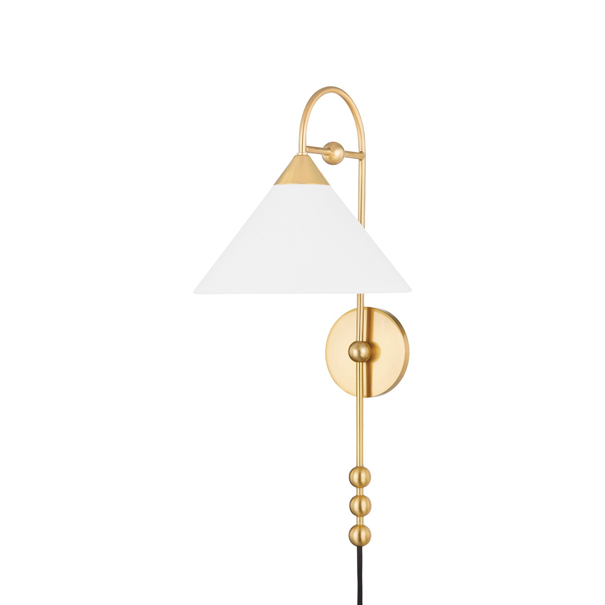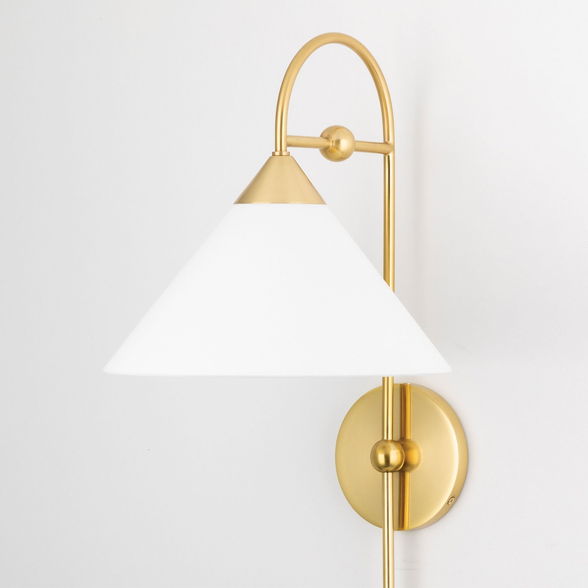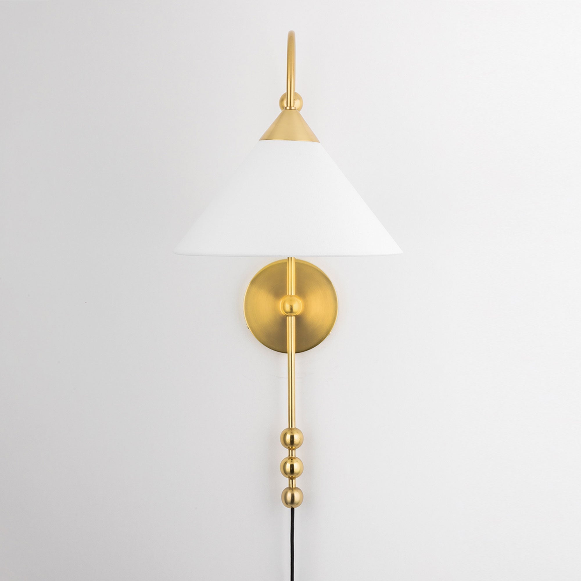 Taking its inspirations from elegant jewelry design, the Sang Plug-In Wall Light from Mitzi is an unmistakably sophisticated addition to your bedside or sitting area. Versatile with its plug-in design, Sang shows off graceful curvature paired with spherical embellishments and a rich aged brass finish. A conical shade in white linen ensures diffused, true illumination for both ambiance and tasks.