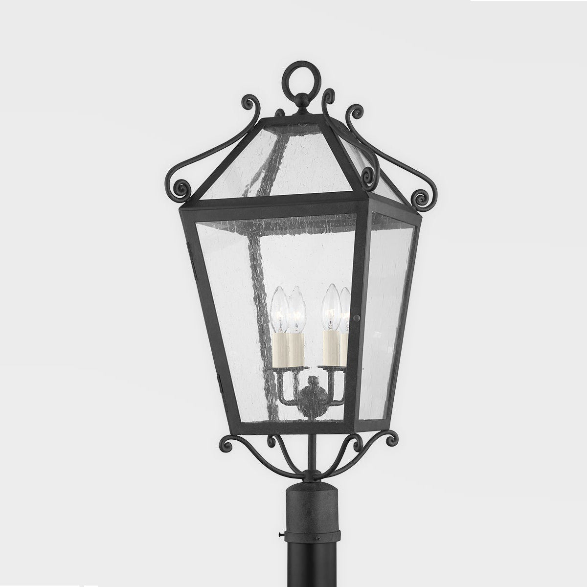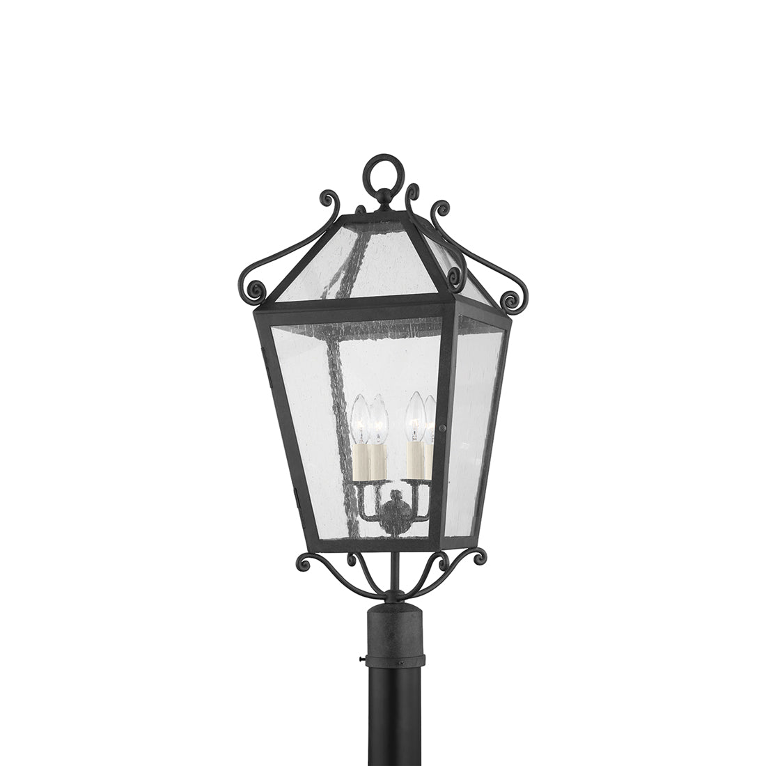Sweeping curled accents offer a significant artisan upgrade to an outdoor fixture, bringing a level of Euro flavor to an exterior setting. Metal construction with a rich French iron finish creates the Santa Barbara County Outdoor Post Light from Troy Lighting and its lantern-like shade with sleek glass panels. Tempting candelabra-style lights infuse a village motif, traditional and romantic, with an elegance that embellishes a custom yard space.