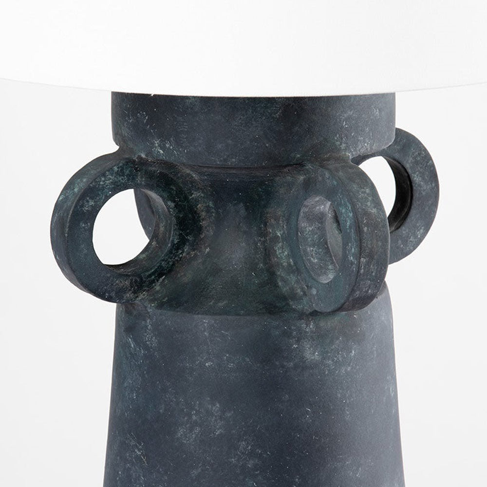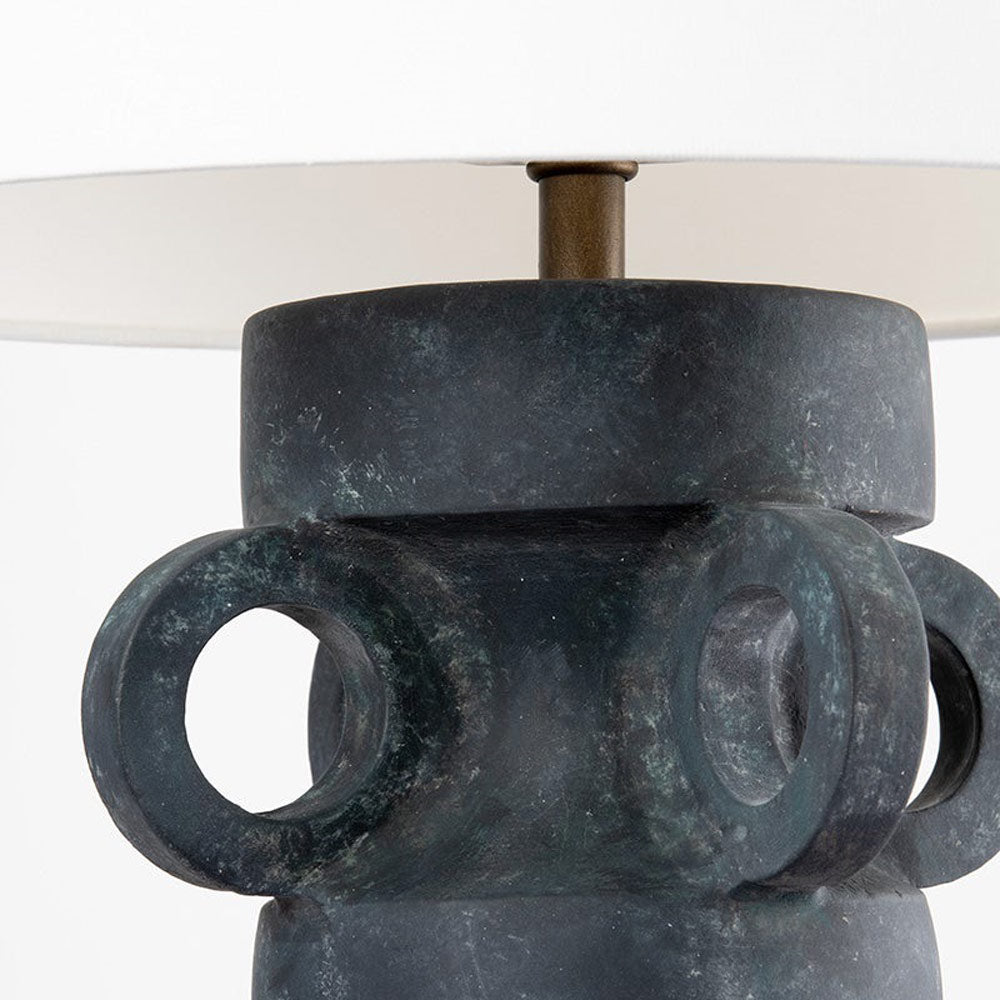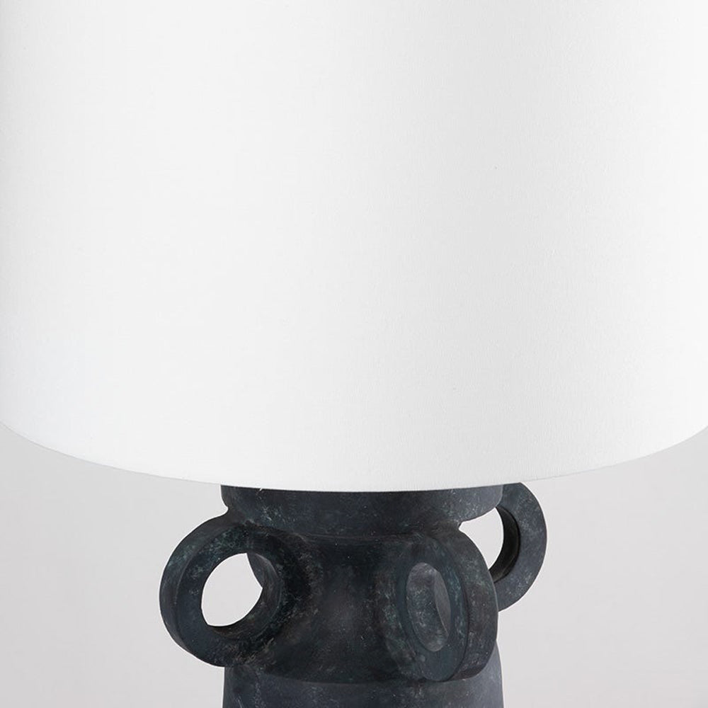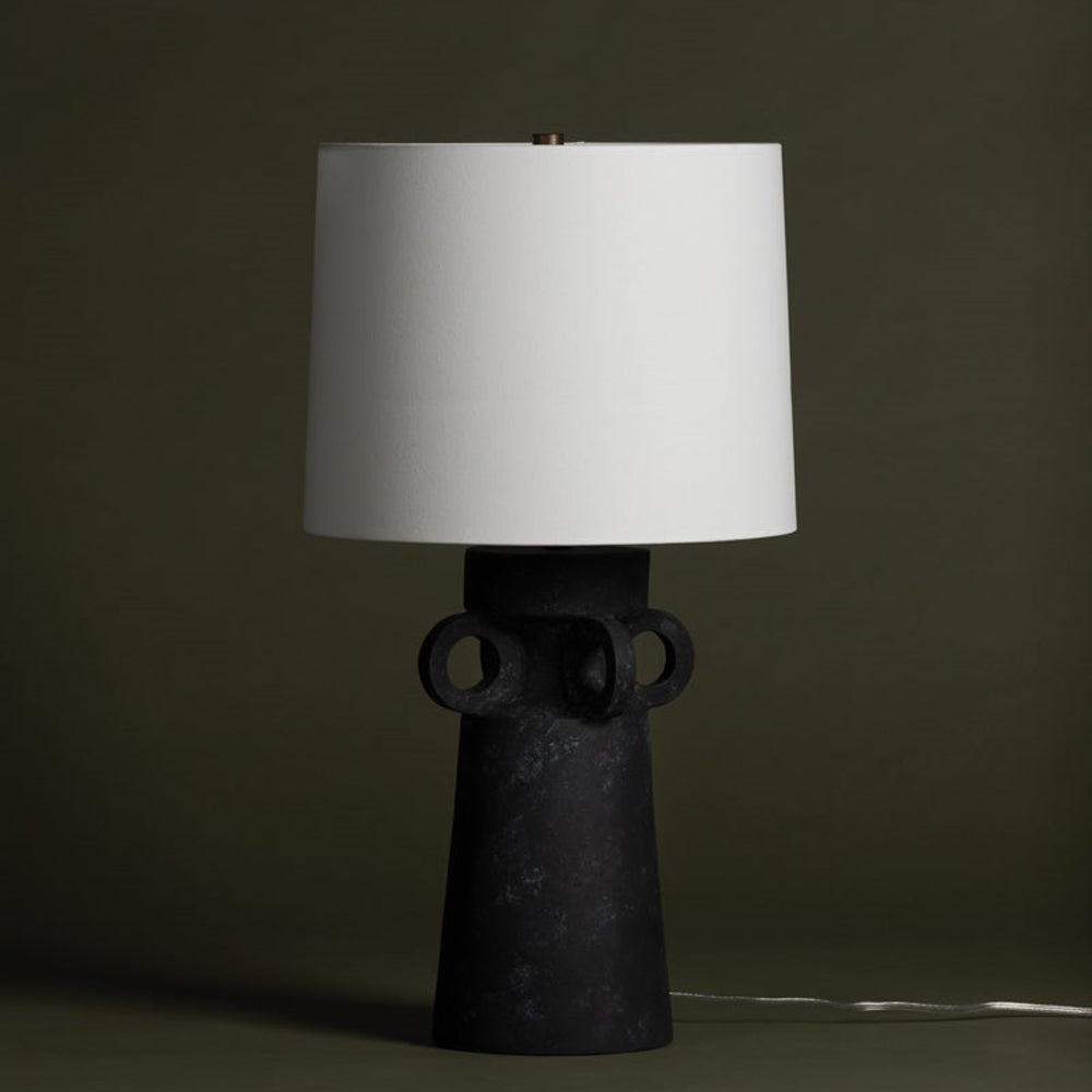 A bold black finish and creative silhouette speak to an edgy look as the Santa Cruz Table Lamp from Troy Lighting produces striking contrast. Weathered with an artifact black ceramic base, its ring embellishments create an unexpected twist. Make a statement with this energized lamp and its crisp white shade.