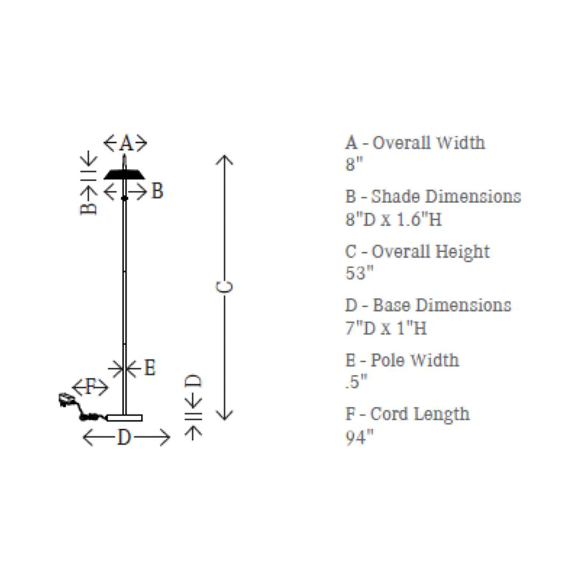 - Dimensions: 8"D X 53"H; 94" Cord Length