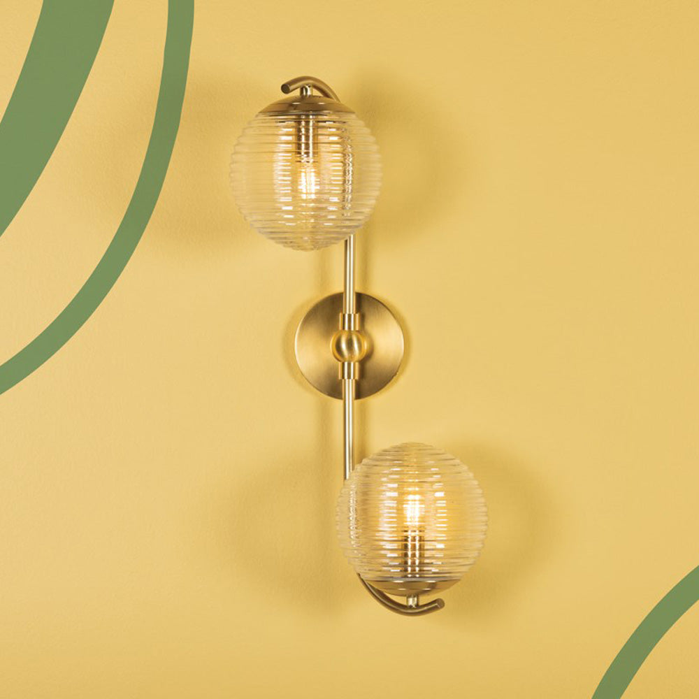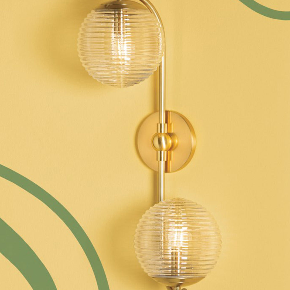 Festive and charming design creds become a focal point as the Sara Wall Light from Mitzi presents a mix of sophistication and playful aesthetics. Dainty ribbed glass globe shades inspired by vintage Holophane style fixtures are positioned vertically on each side of a rich aged brass finish metal stem and round backplate. Double the illumination level with a gorgeous light fixture suited to living rooms, dining spaces, and entryways.