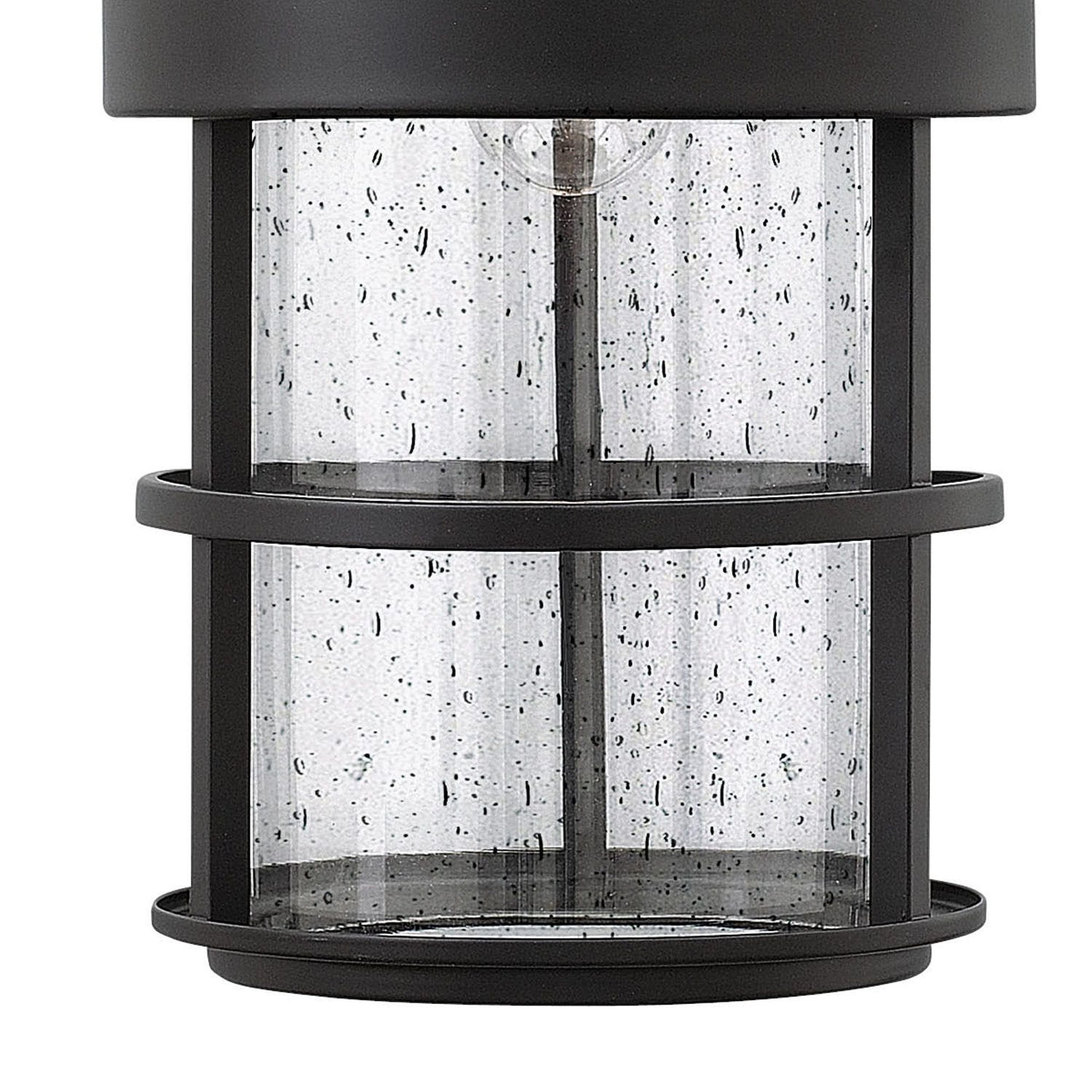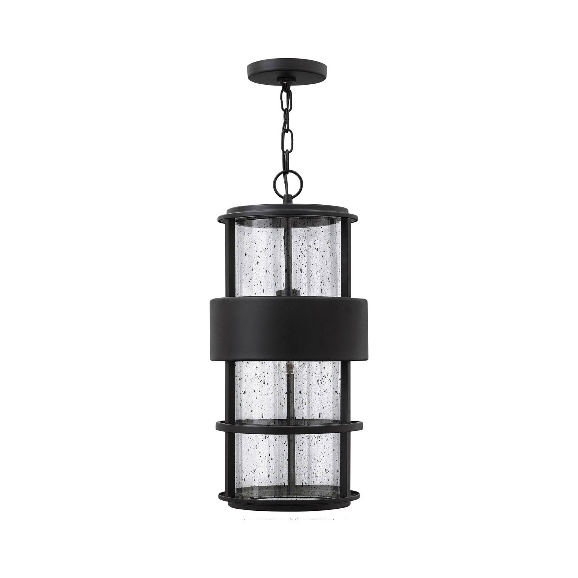 Saturn Outdoor Pendant Light is a stunning; modern design offering robust construction and intersecting lines that create a striking contrast against the etched opal or clear seedy glass.