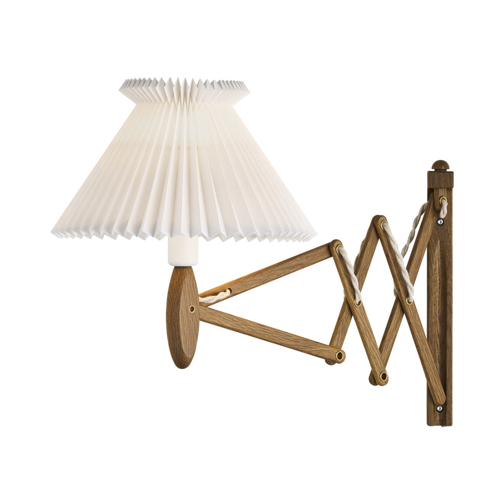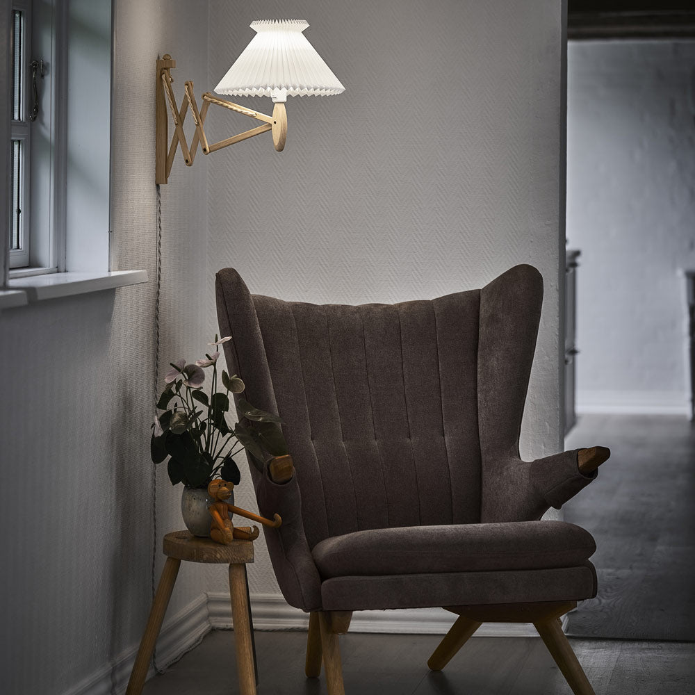 A novel design incorporates mechanical savvy with conventional style in a wall fixture that turns heads. With a crowned accordion-style shade adding texture, the Sax 224 Wall Light from Le Klint creates a delightful organic look of origami inspiration. A wood scissor-like mechanism supports and extends the shade to deliver lighting in tailored settings.