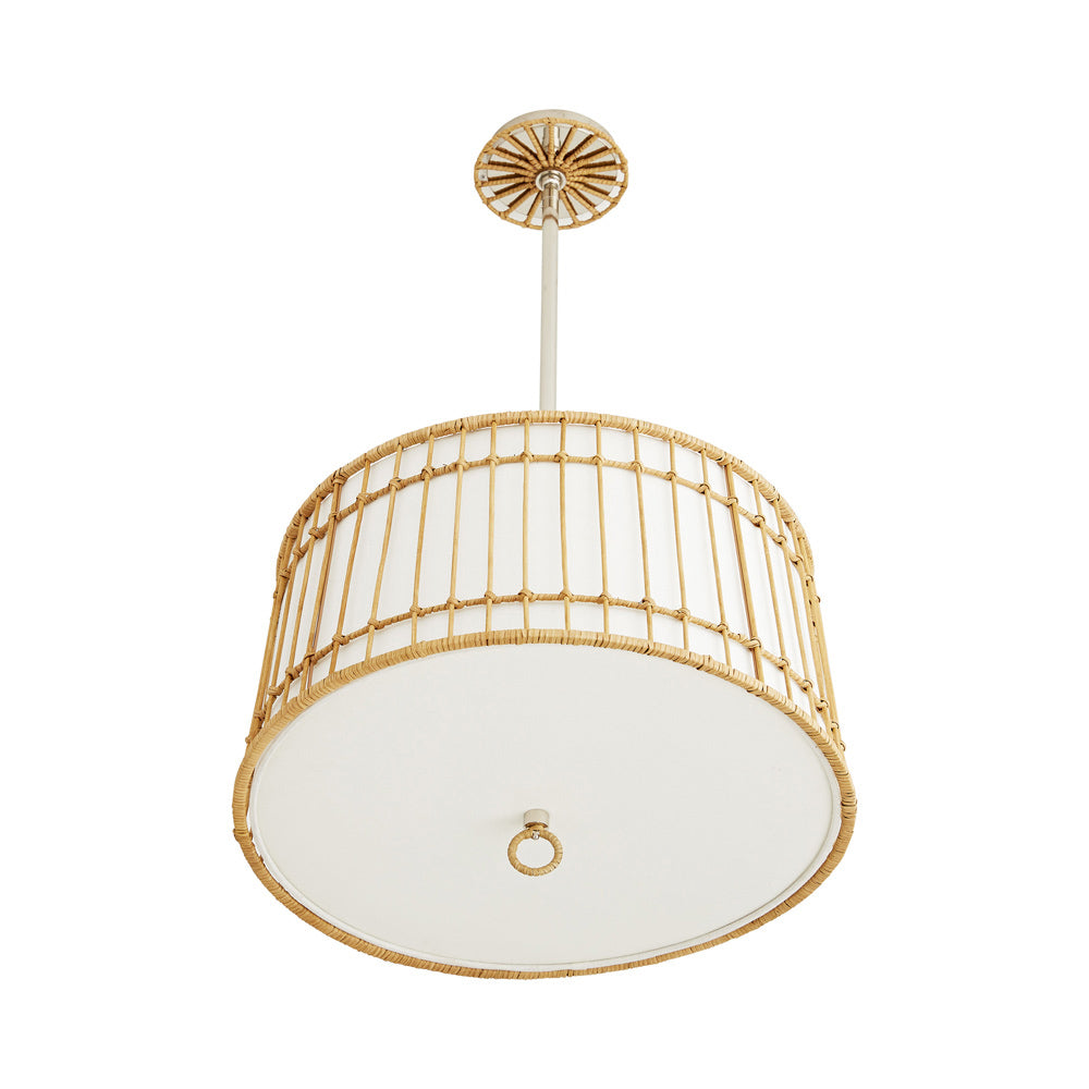 Make a coastal-inspired space come to life with the Sea Island Pendant Light from Arteriors and watch the ambiance in a living room or kitchen come to life. Organic tropical vibes emanate from this fixture featuring a natural rattan frame over an ivory linen shade, as wrapped rattan crawls partway up a metal down rod to test the waters of both sophistication and whimsy.