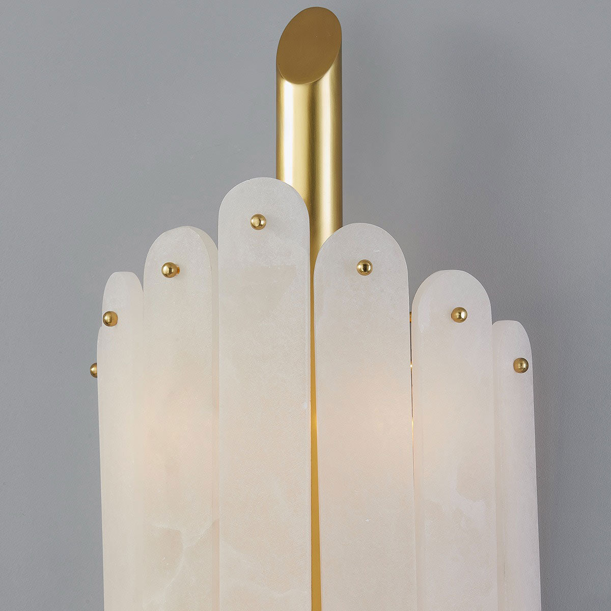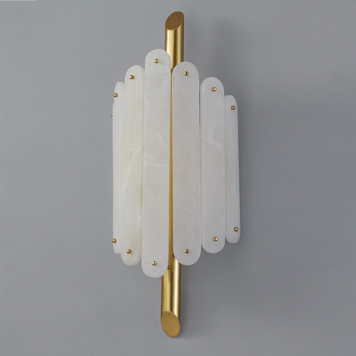 Cherish the artistry that harnesses organic elegance, making a difference in any space with the Selene Wall Light from Corbett Lighting. Gradient lengths of chic white alabaster strips partially obscure a gleaming vintage polished brass metal wall mount, adding a sense of fine artistry perfect for sophisticated living rooms, bedrooms, and hallways.