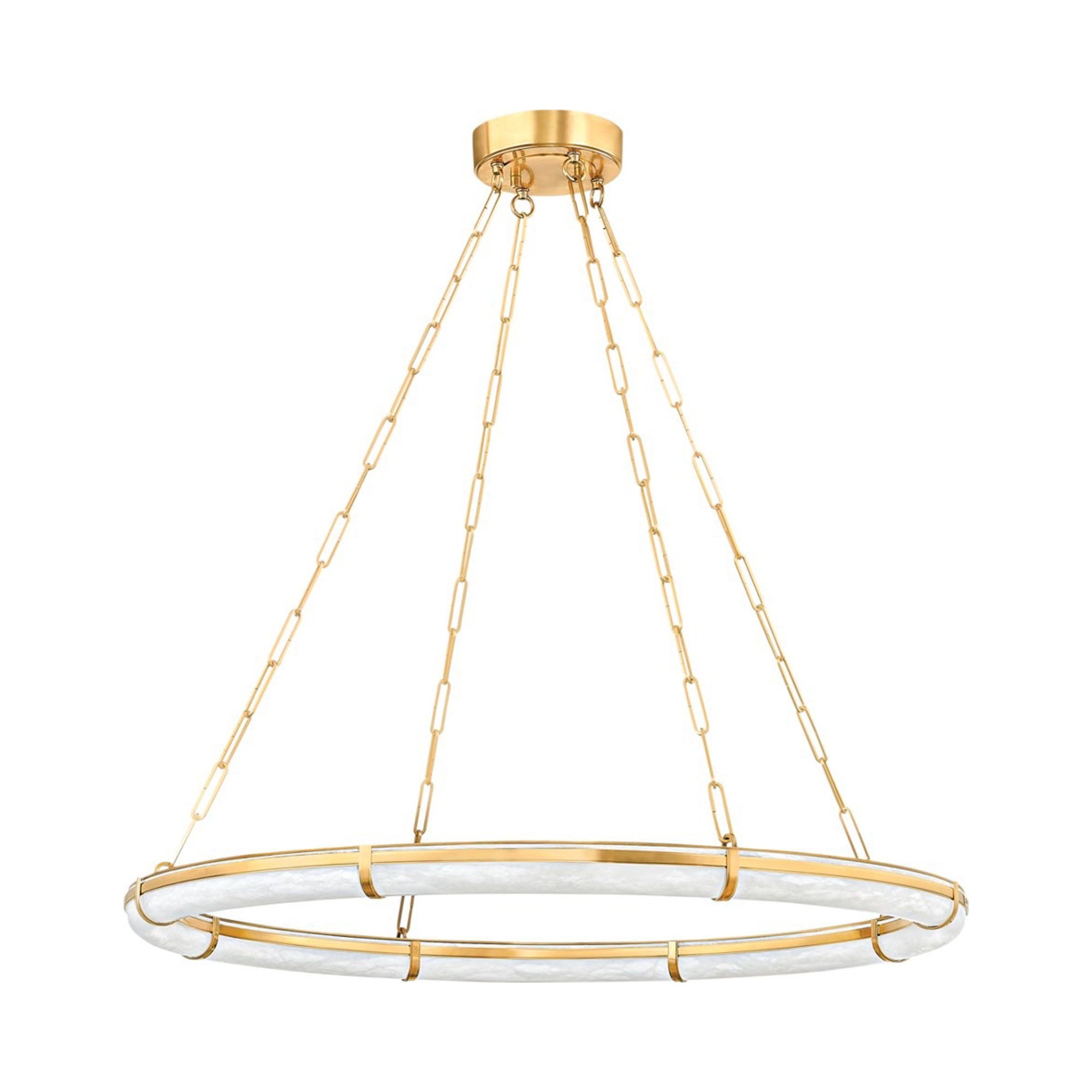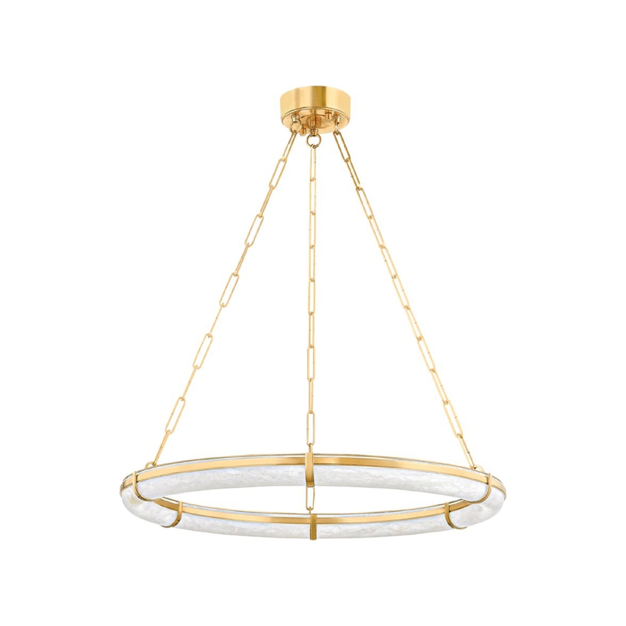 Slender shaping offers diminutive yet powerful style conceptualization with an Art Deco feel as the Sennett LED Chandelier from Hudson Valley Lighting perfects the art of lighting. Its ring-like open shade fashioned of alabaster receives evenly spaced aged brass metal accenting in banding and a circular top, adding a radiant quality to energy-efficient lighting over a dining ensemble or in a foyer. Count on authentic markings and veining from its natural stone shade, and embrace the balanced silhouette of a tri-part chain link suspension.