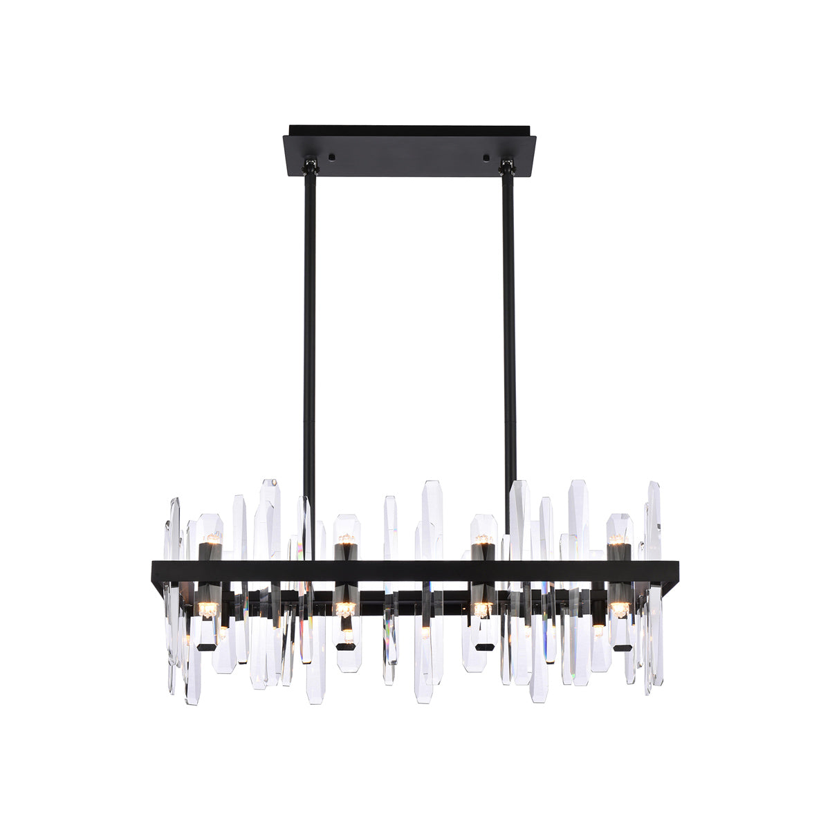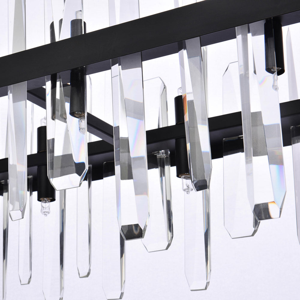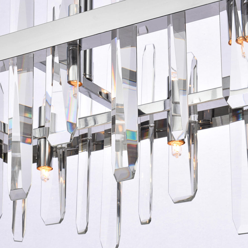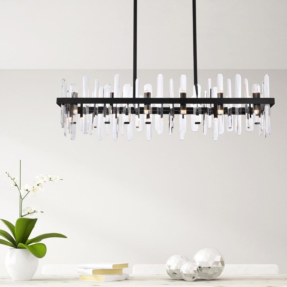 Invite organic energy to a kitchen or dining room without sacrificing a bit of glamour with this Serena Chandelier from Elegant Lighting. A thick rectangular metal frame defines the structure of the fixture, while the installation of crystal shards creates a glittering, curtained effect for light emanating from within. Varied crystals play up a natural, earthy ambiance that adds a sense of balance and elegance to your space.