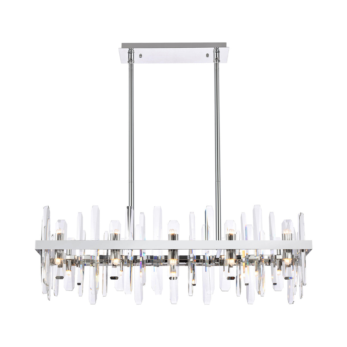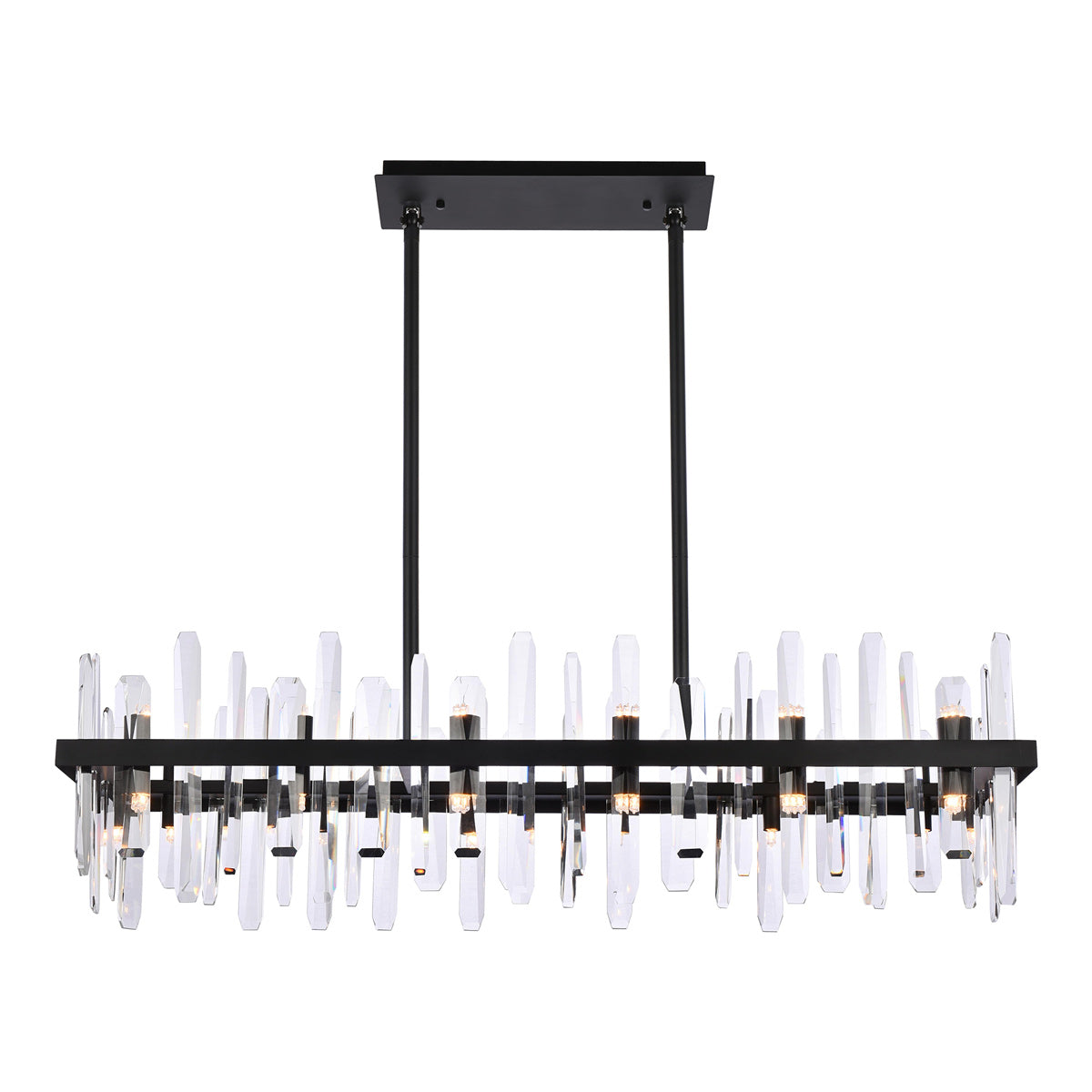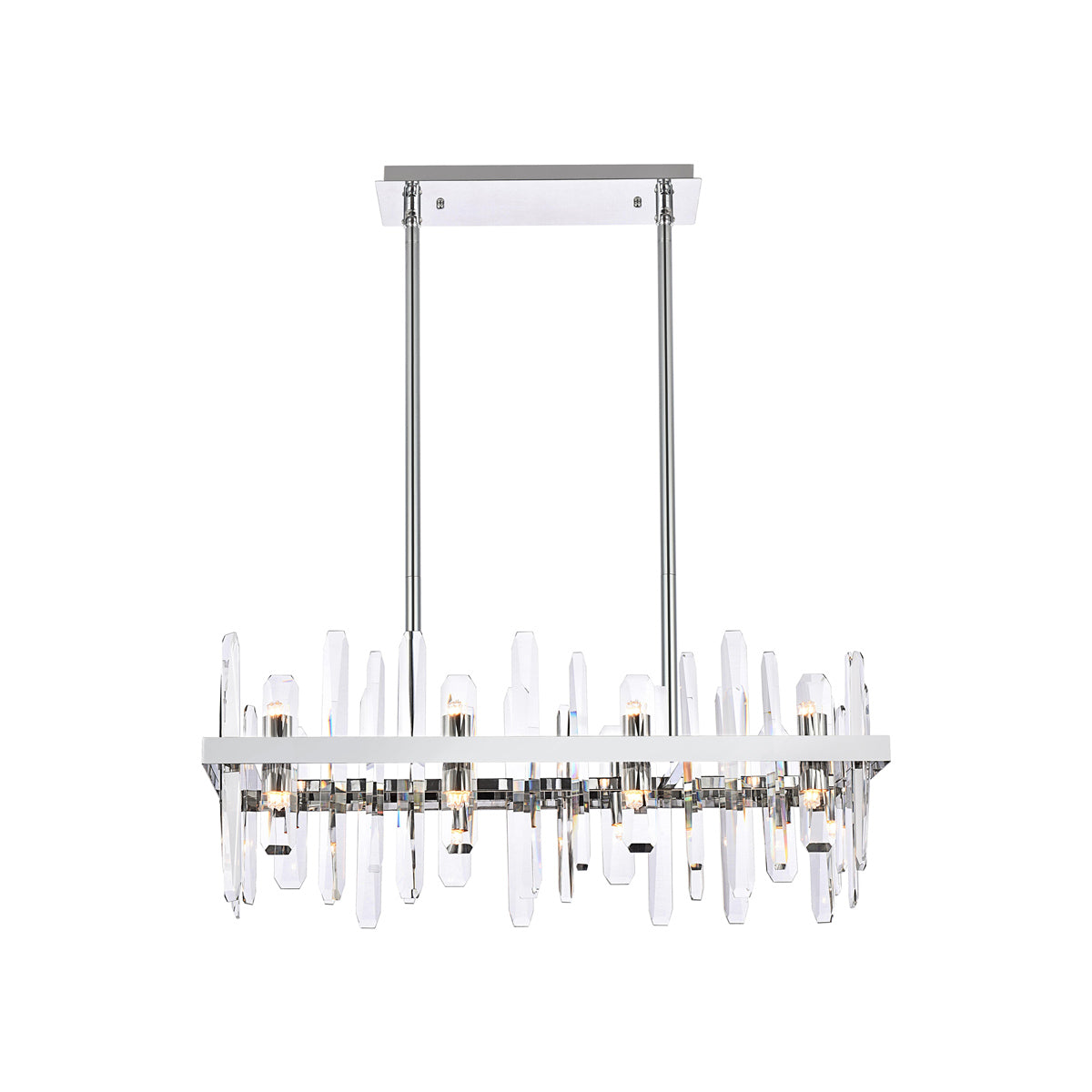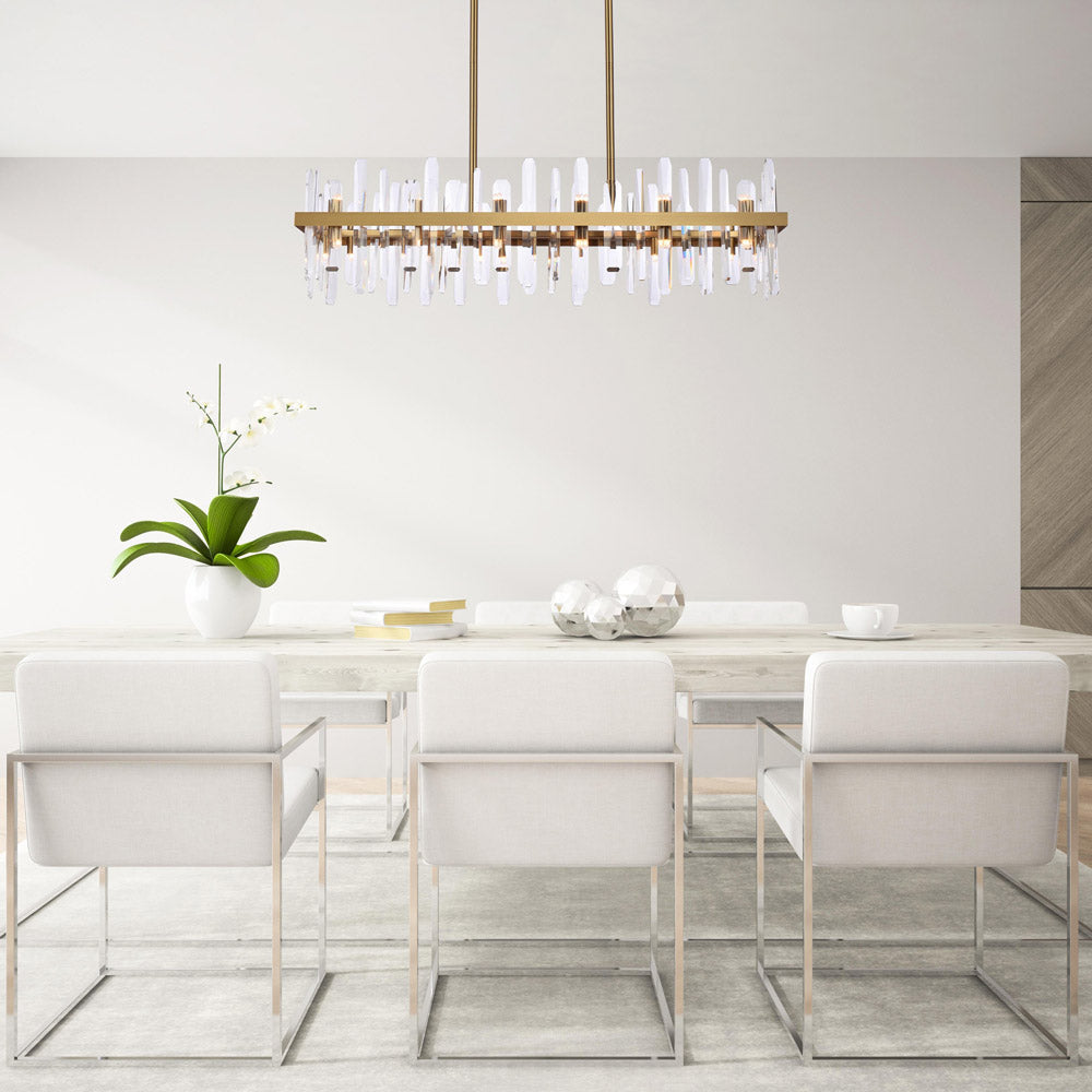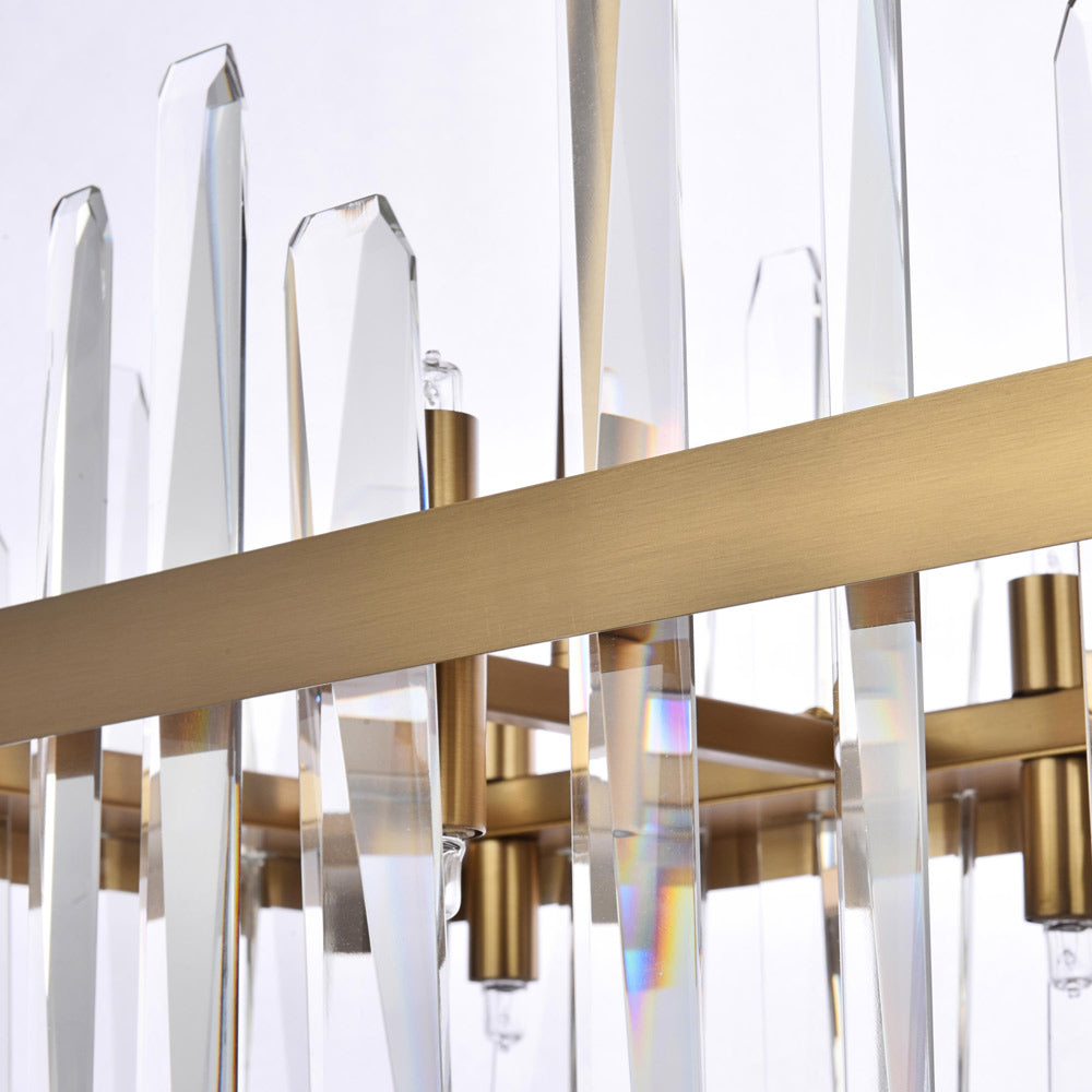 Invite organic energy to a kitchen or dining room without sacrificing a bit of glamour with this Serena Chandelier from Elegant Lighting. A thick rectangular metal frame defines the structure of the fixture, while the installation of crystal shards creates a glittering, curtained effect for light emanating from within. Varied crystals play up a natural, earthy ambiance that adds a sense of balance and elegance to your space.