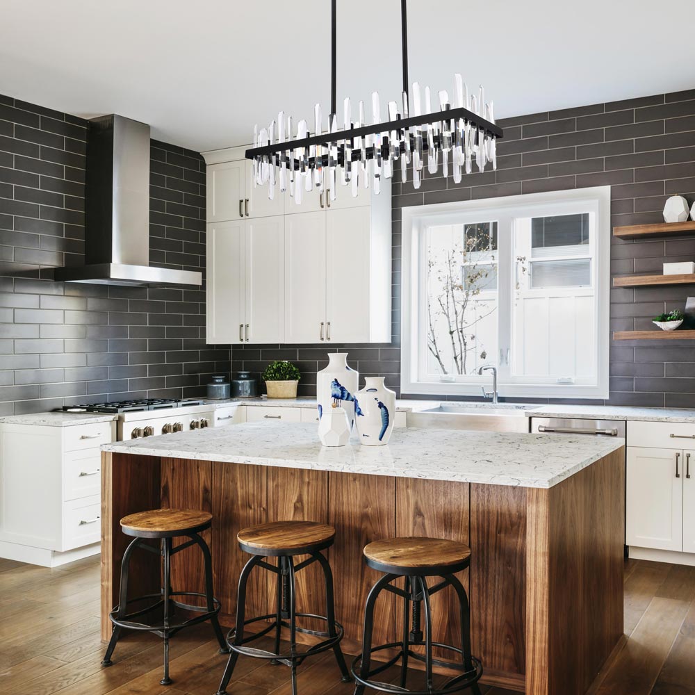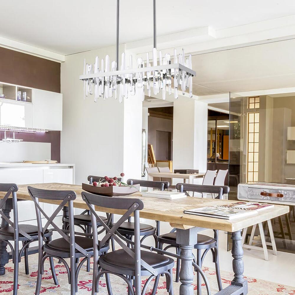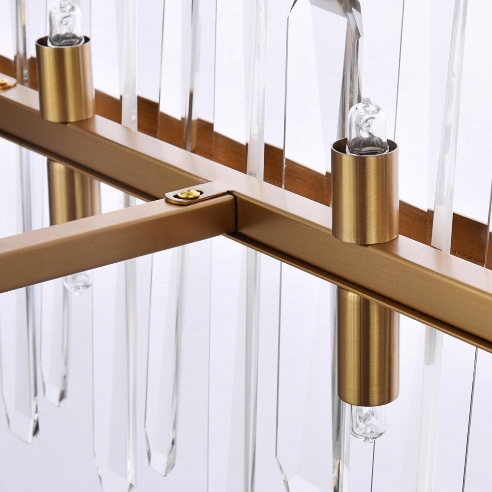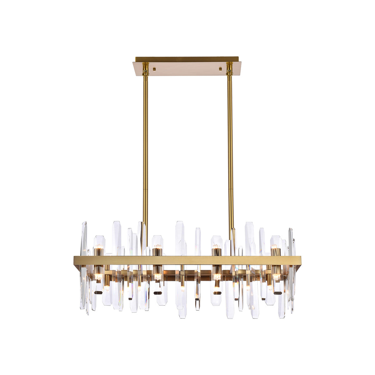 Invite organic energy to a kitchen or dining room without sacrificing a bit of glamour with this Serena Chandelier from Elegant Lighting. A thick rectangular metal frame defines the structure of the fixture, while the installation of crystal shards creates a glittering, curtained effect for light emanating from within. Varied crystals play up a natural, earthy ambiance that adds a sense of balance and elegance to your space.