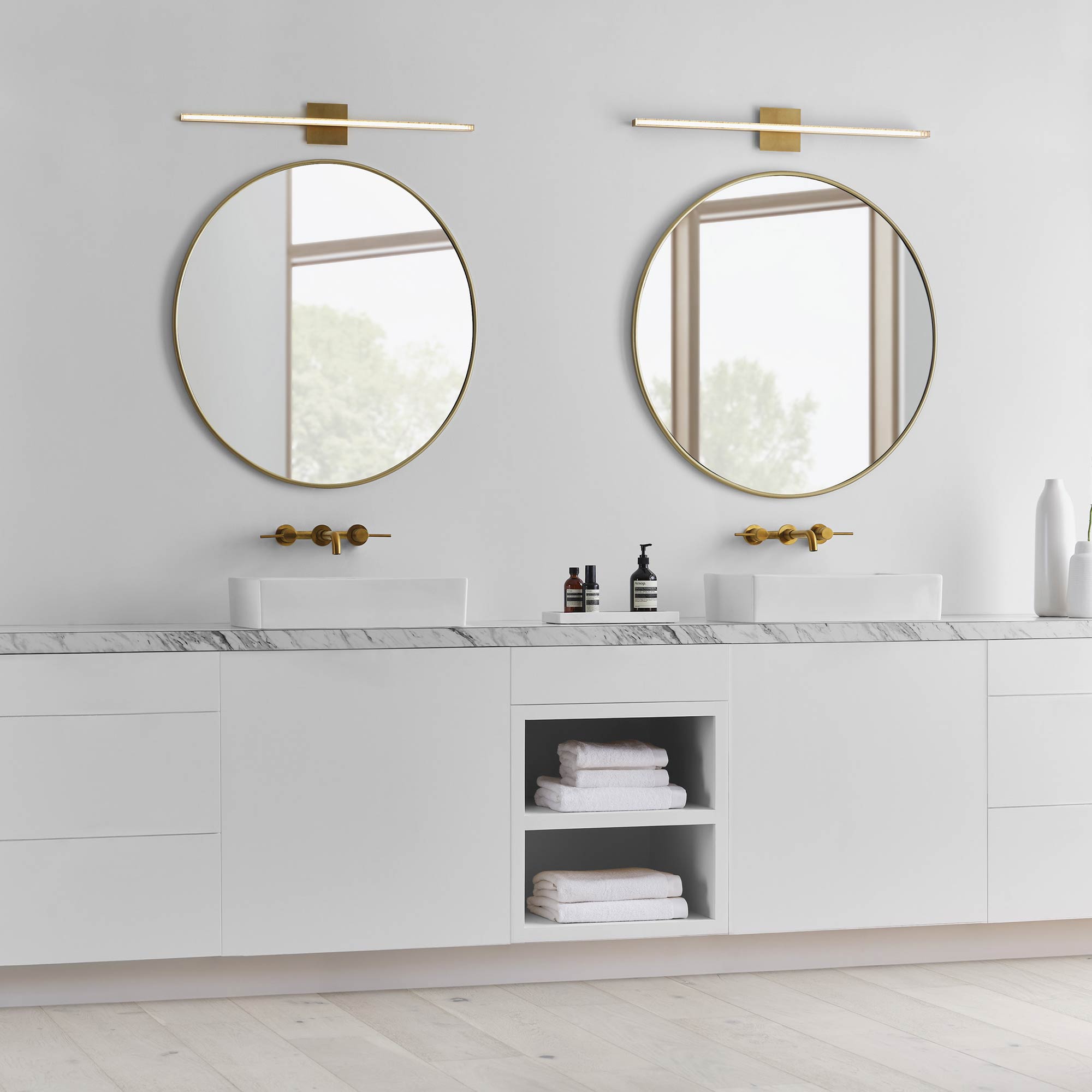The Serre LED Bath Vanity Light from Visual Comfort Modern emphasizes a less-is-more design concept, creating a delicate look perfect for updated contemporary bath spaces. Highlight a custom vanity with this chic fixture featuring metal construction with a linear rod-like shade and a rectangular wall plate, both of which form an inspired look of glam suited to ensuite or guest bathrooms.