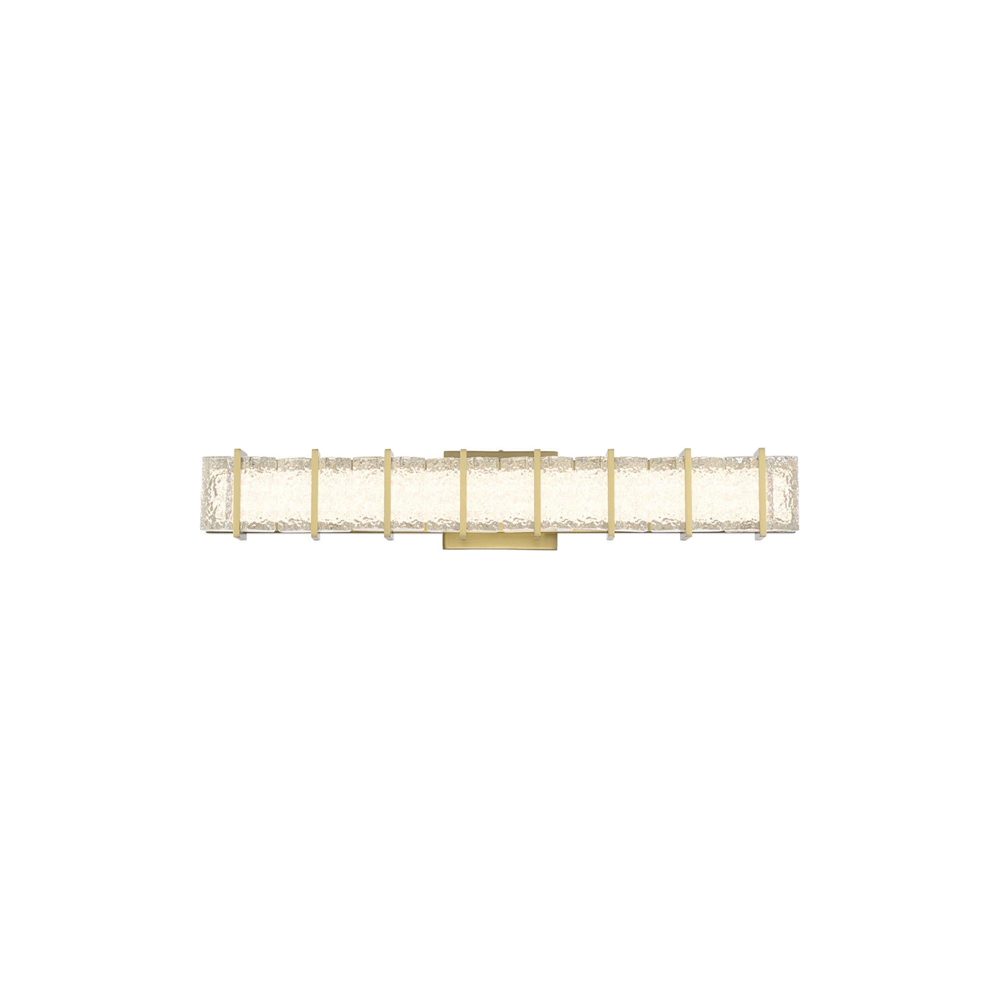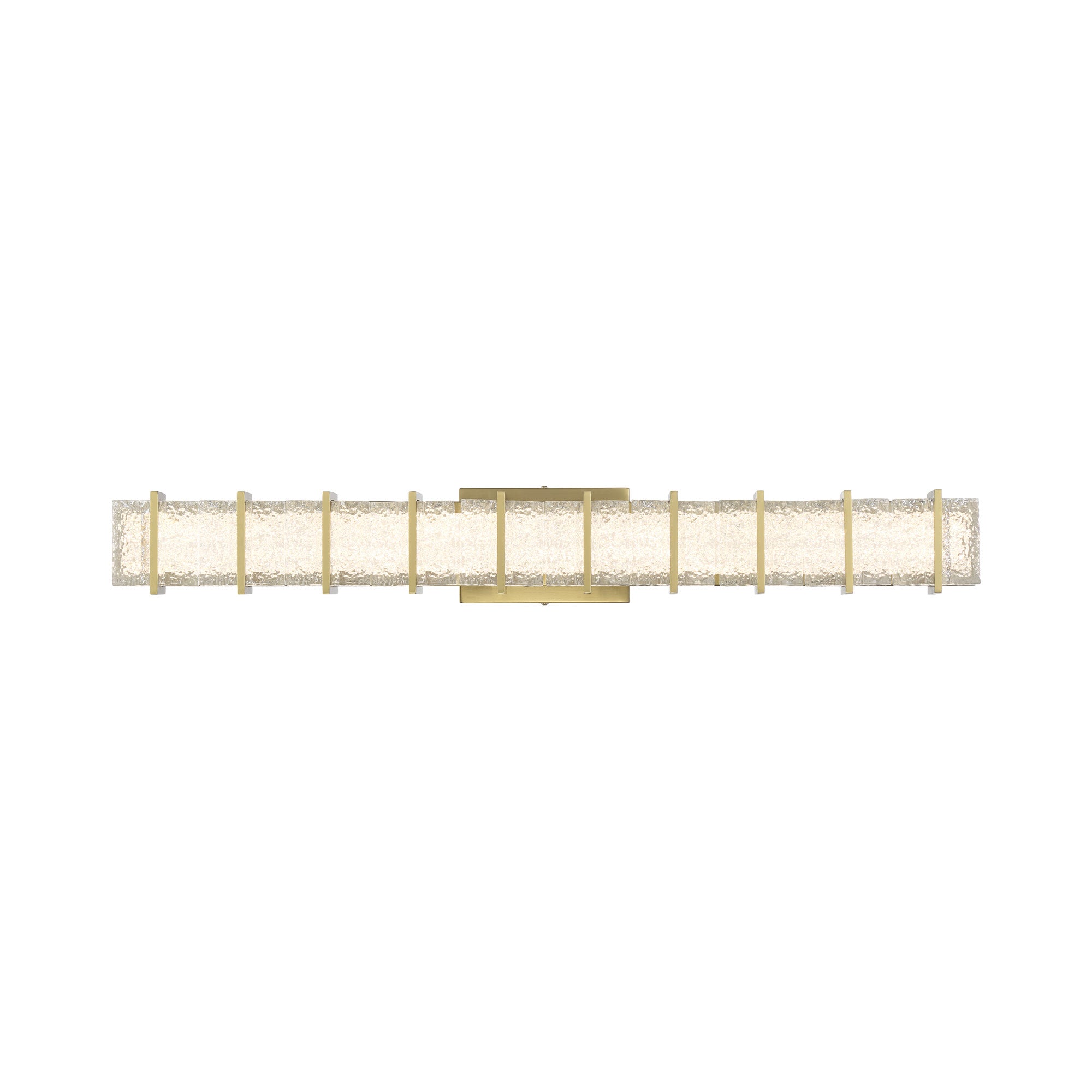 Look for an inviting blend of artisanal style and organic calm with a light fixture styled to make an impact. The Sevryn LED Bath Vanity Light from Minka Lavery captures an earthy flavor with linear metal framing and textured crystal glass coexisting in a decadent manner.