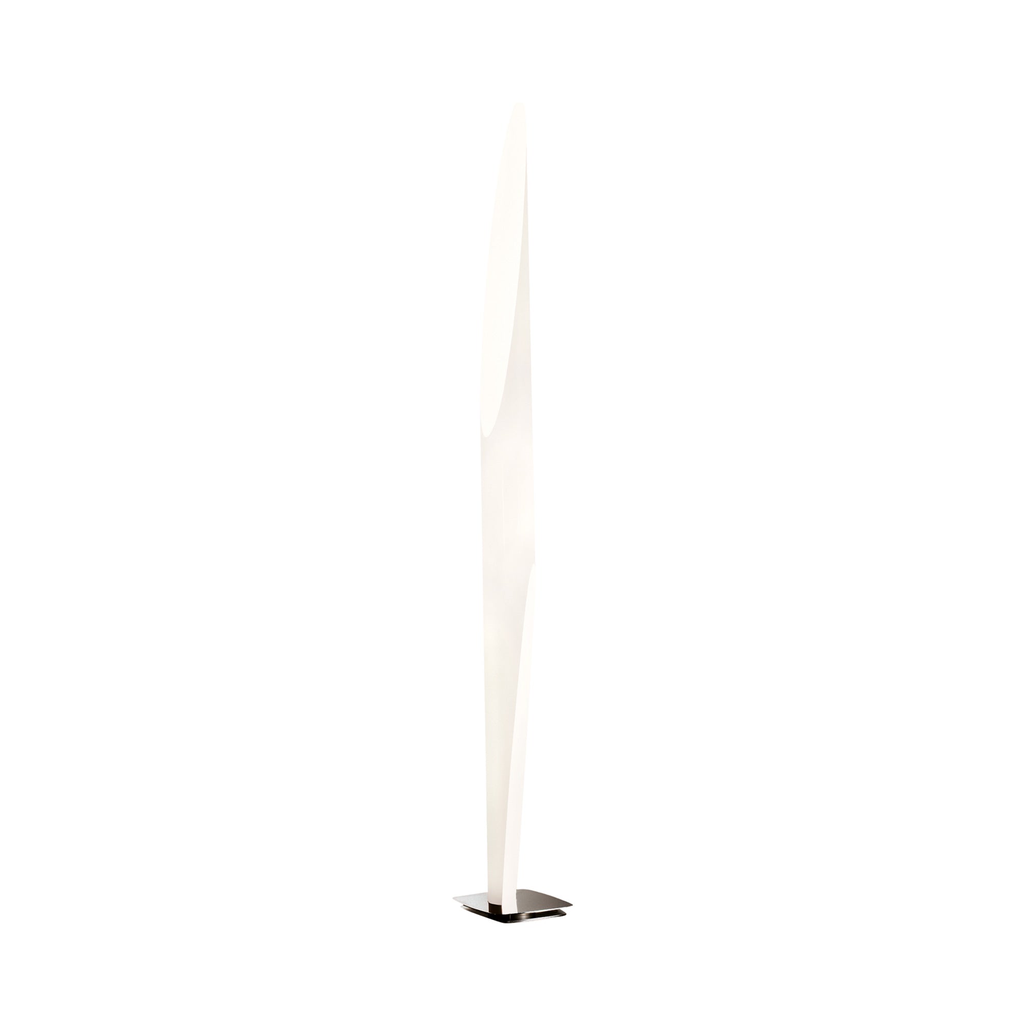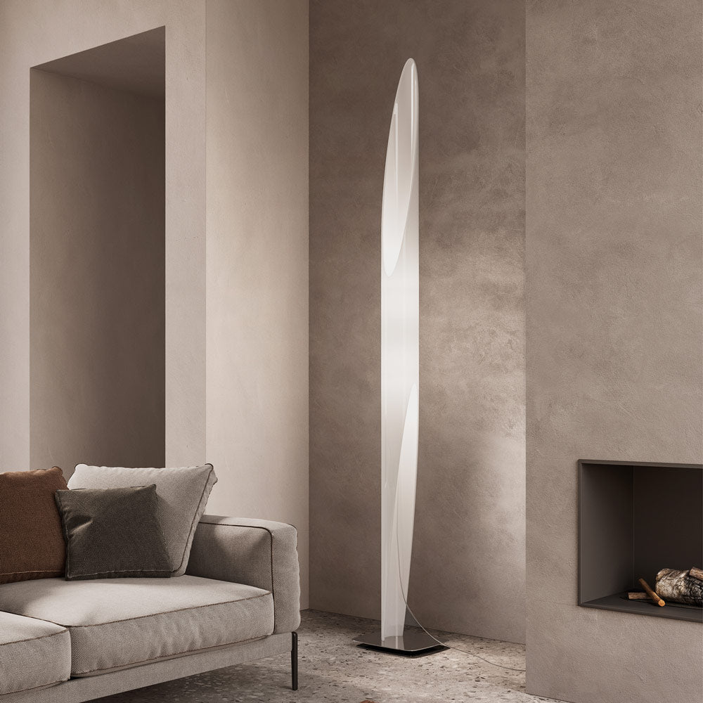 The Shakti Floor Lamp from KDLN delivers fine artistry and a romantic silhouette, bringing delicacy to the industrial motif it reflects. Diagonal shaping at both ends carves out a high-fashion attitude in a tubular diffuser, embellishing both experimental and organic attitude. Dimming functions allow for custom light levels glowing through a laser-cut, extruded Plexiglas tube affixed to a minimalist steel base.
