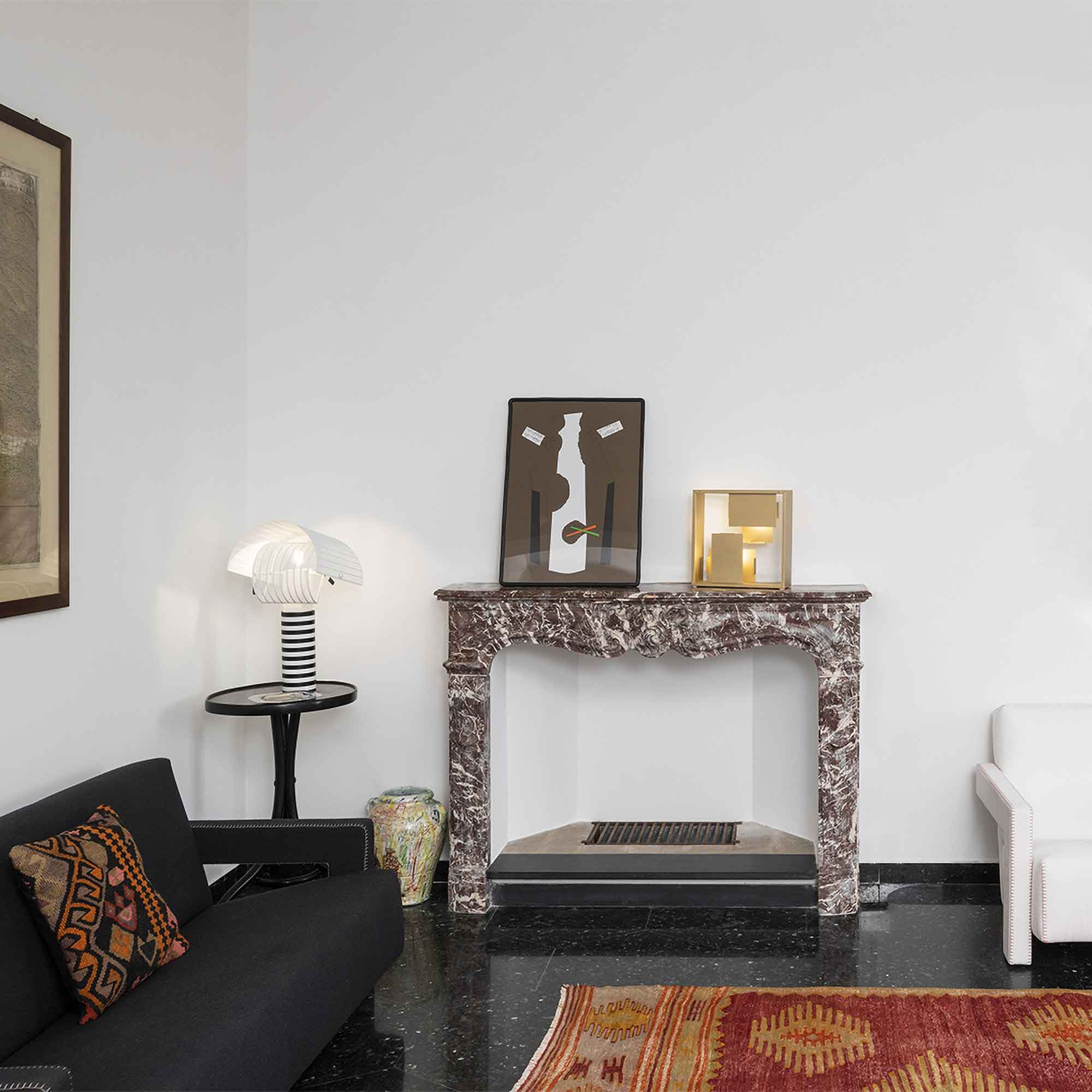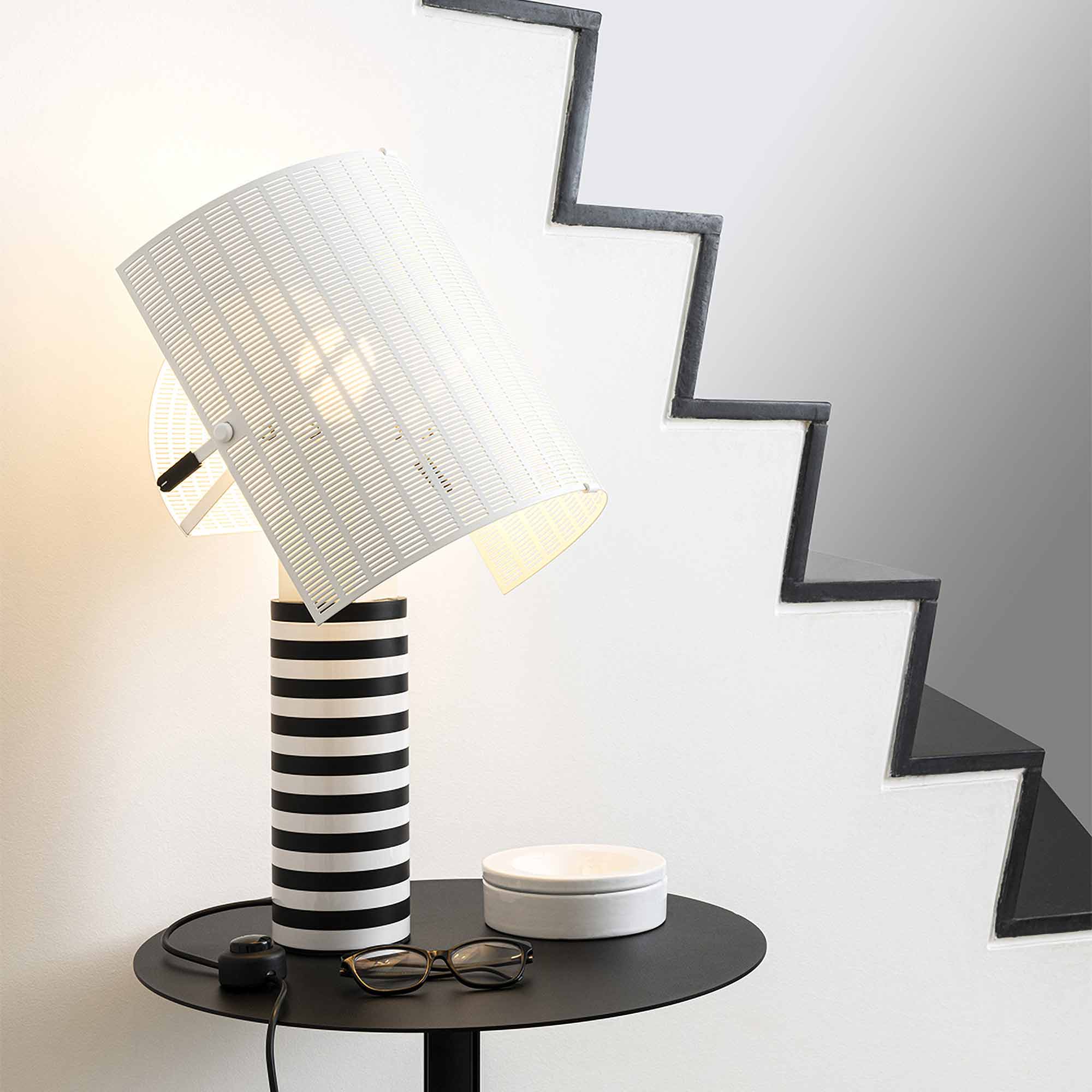 Perforated steel and black & white stripping define the iconic modern artistry of the Shogun Table Lamp from Artemide.