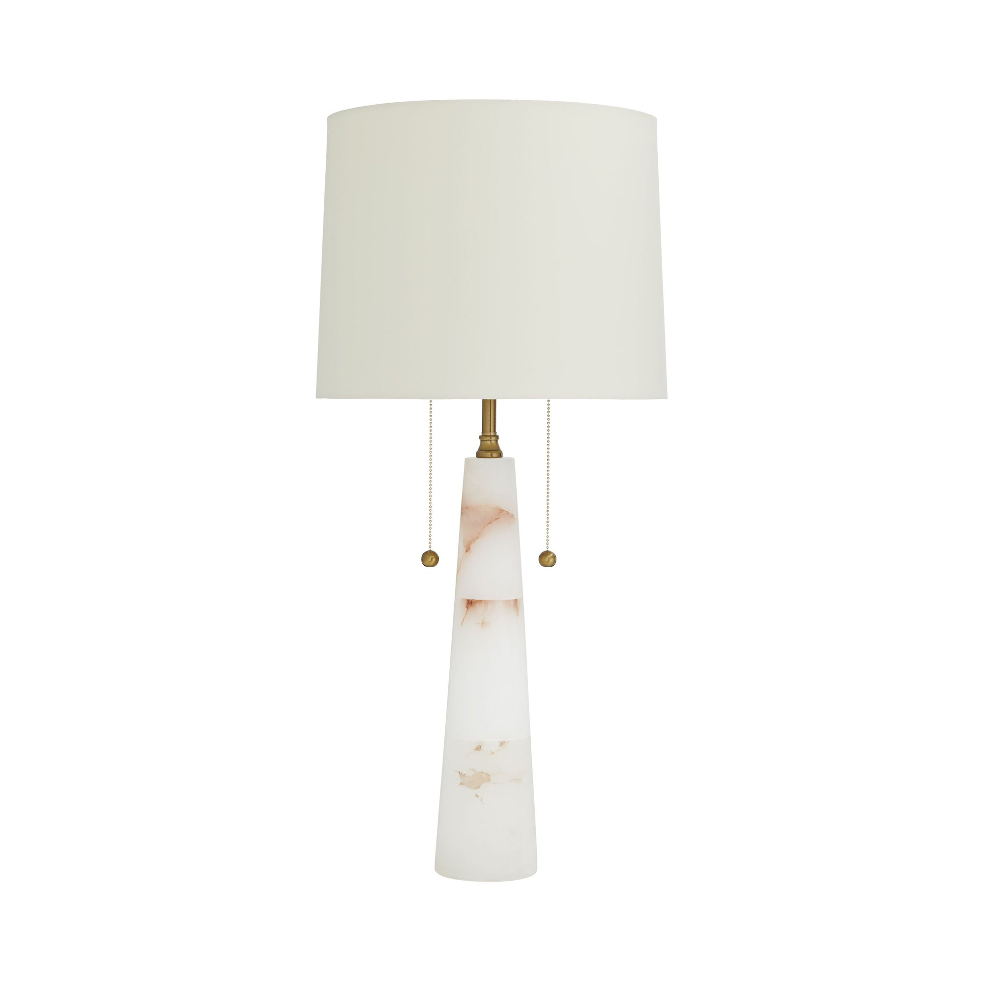Double socket snow marble and brass table lamp features a pair of decorative brass pull chains and matching finial. Topped with a putty colored fabric shade with cream cotton lining and rolled edges.
