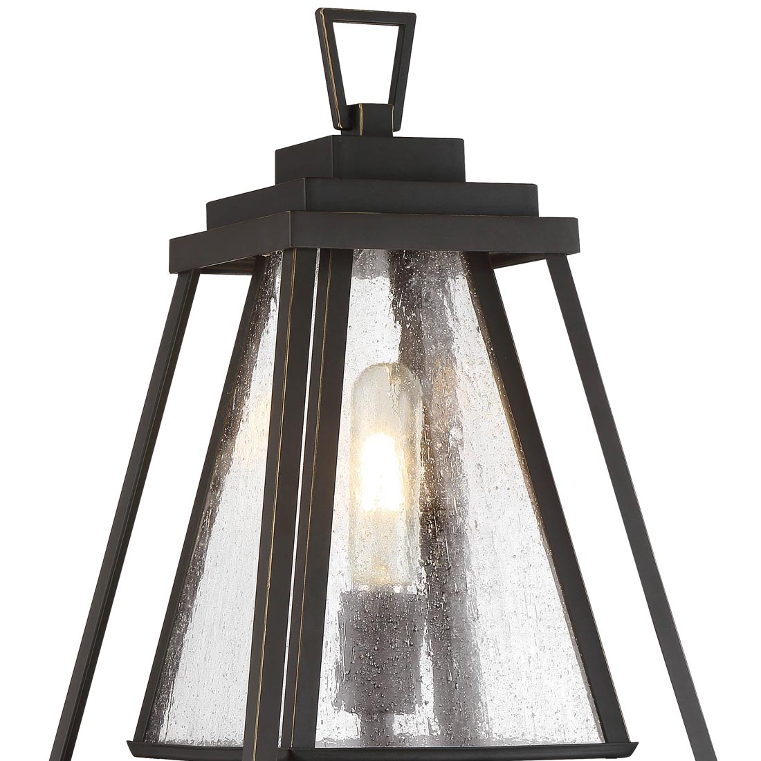 Highlight the custom landscaping of a contemporary exterior space with a fixture styled to deliver modern elegance. The Sleepy Hollow Outdoor Post Light from The Great Outdoors offers a touch of updated village style with a layered open metal frame and ornate structured accenting. Clear seeded glass panels offer alluring mood effects to embellish a sophisticated look.