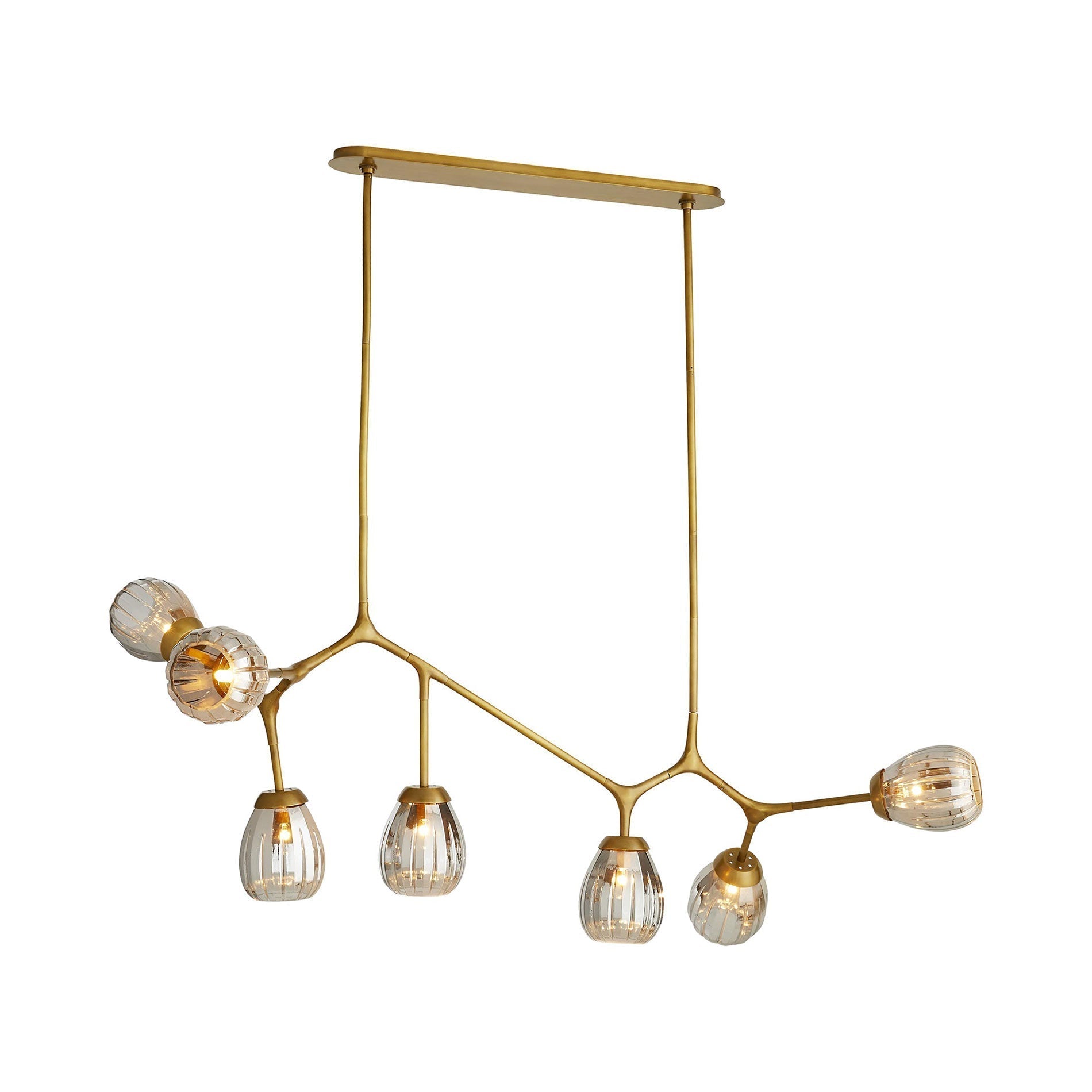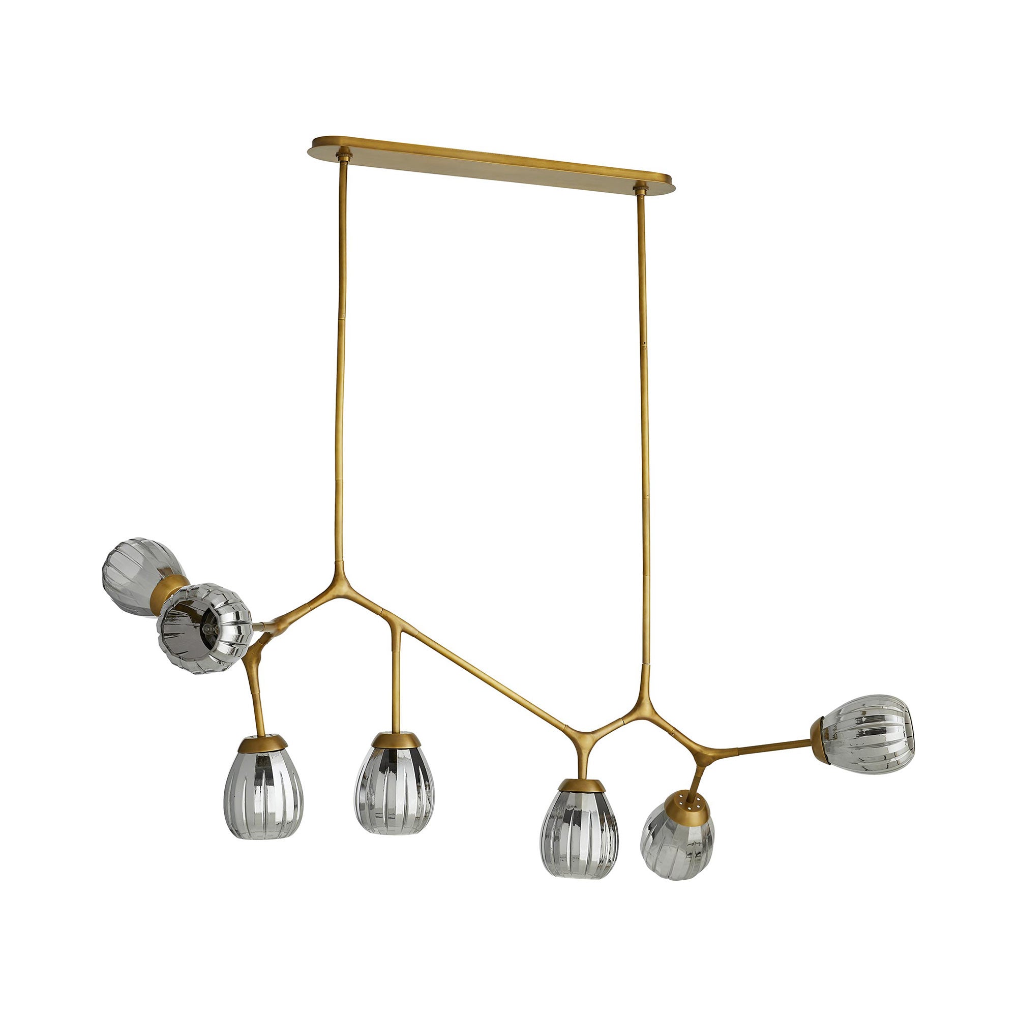 Relive the explorative academic discipline of chemistry to fully appreciate the stylish twist brought by the Smyth Chandelier from Arteriors. A chaotic and asymmetrical silhouette features near-linear and random offshoots of a steel frame. Smoky luster glass shades show off a fluted design as they pivot to arrange the customized lighting effect you choose.