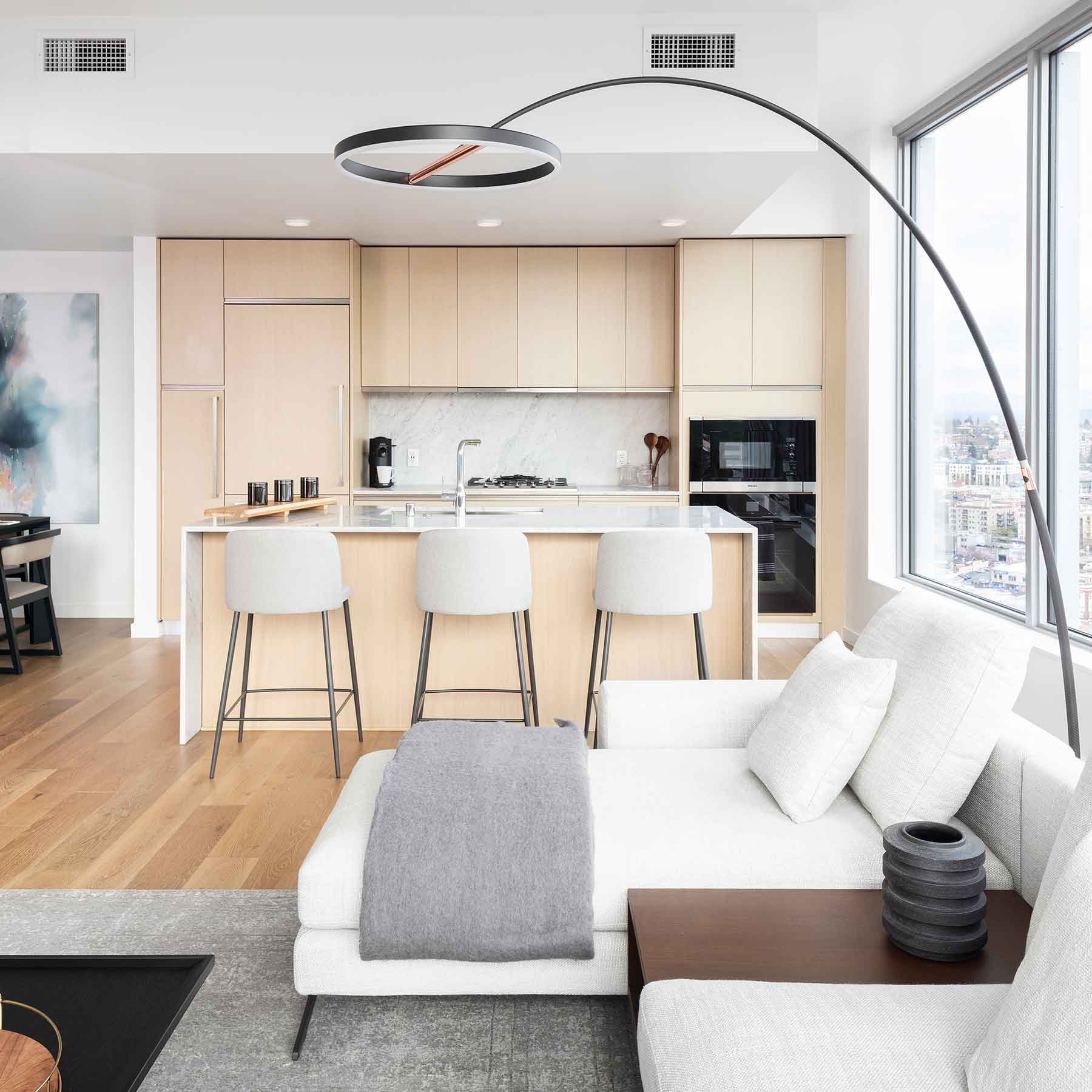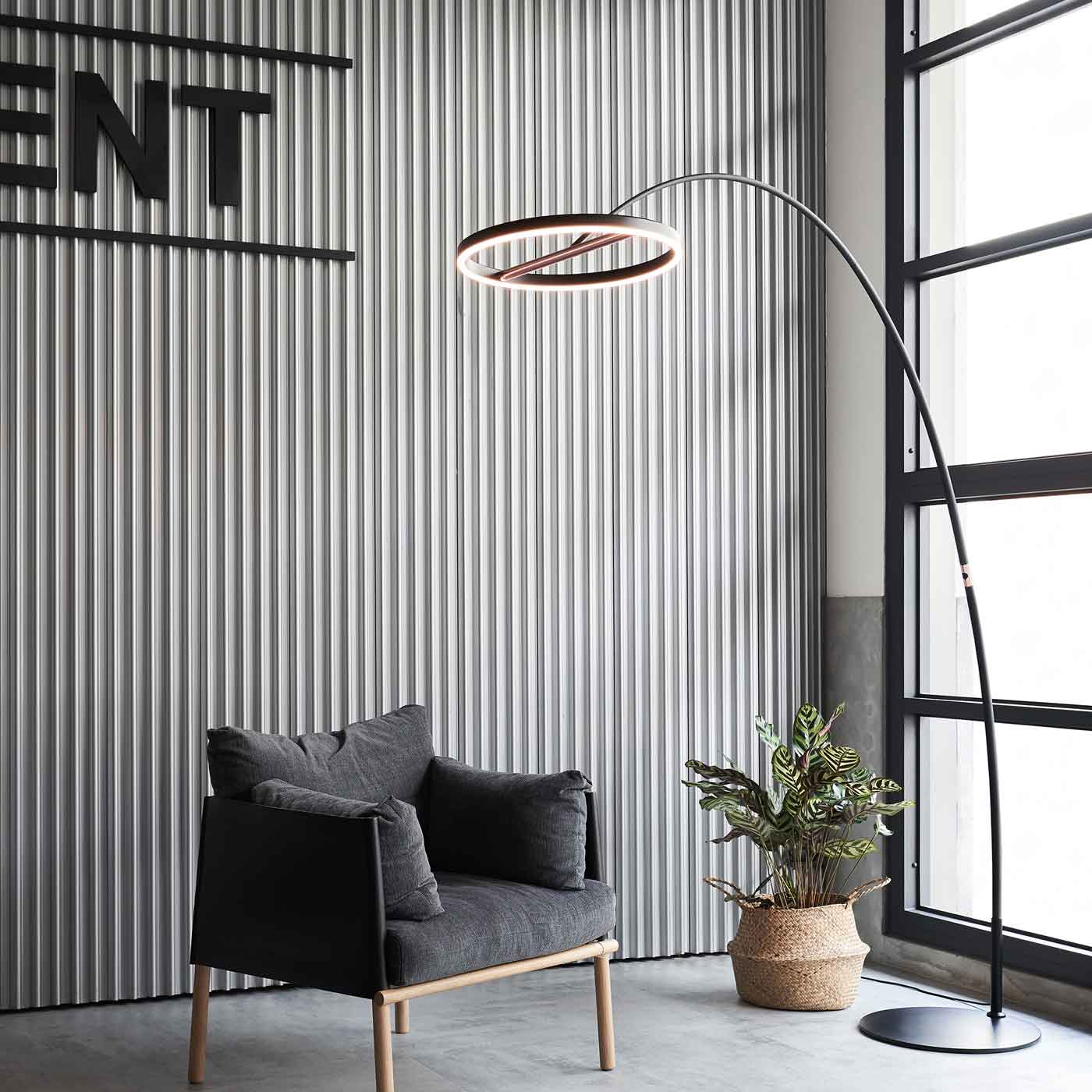 A fashionably slender silhouette becomes a marquee feature of the energy-efficient SOL LED Mega Floor Lamp from Seed Design, creating a low-impact profile with maximum effect. An arc shape enhances an adjustable tube-structured metal frame packed with options to deliver ambient or accent illumination.