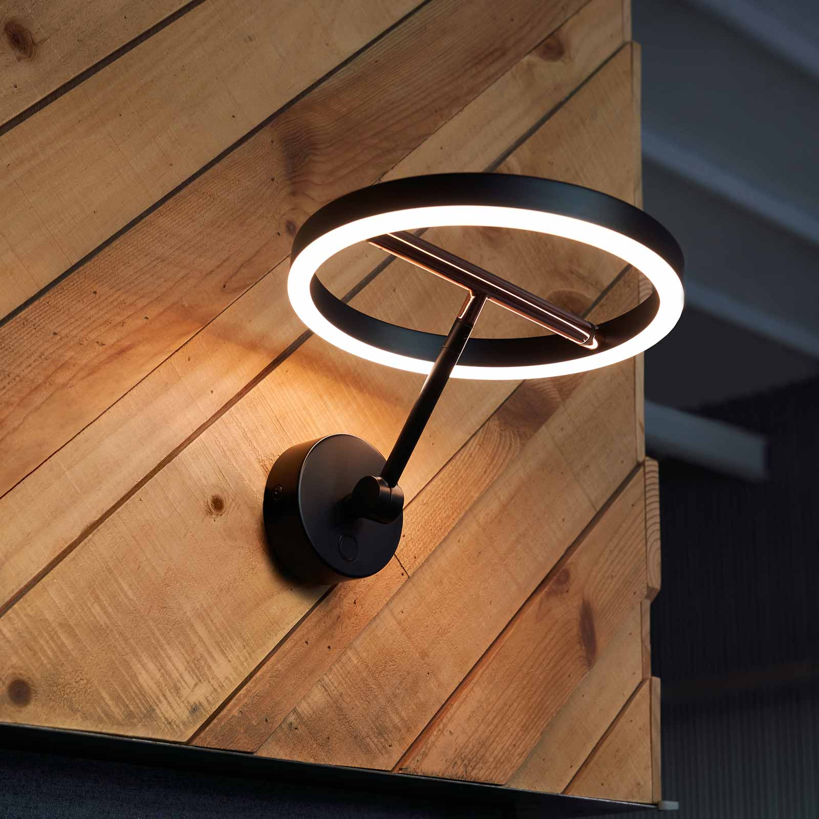A nouveau spin on conventional sconce designs, the SOL LED Wall Light from Seed Design twists the affect in a contemporary living room or hallway. Embrace a ring-style shade offering energy-efficient illumination and a metallic balance bar creating adjustable positioning that adds function to its fashion.