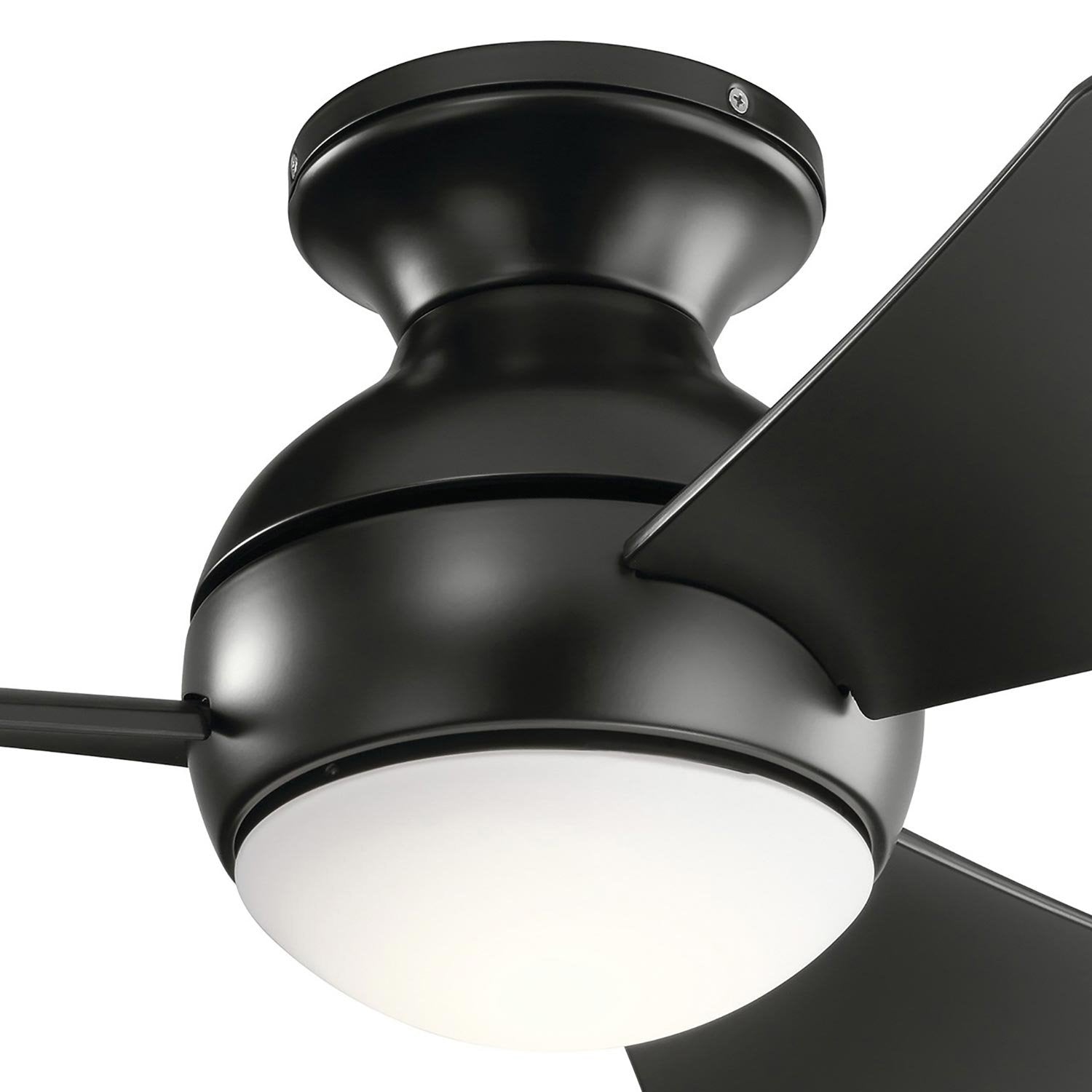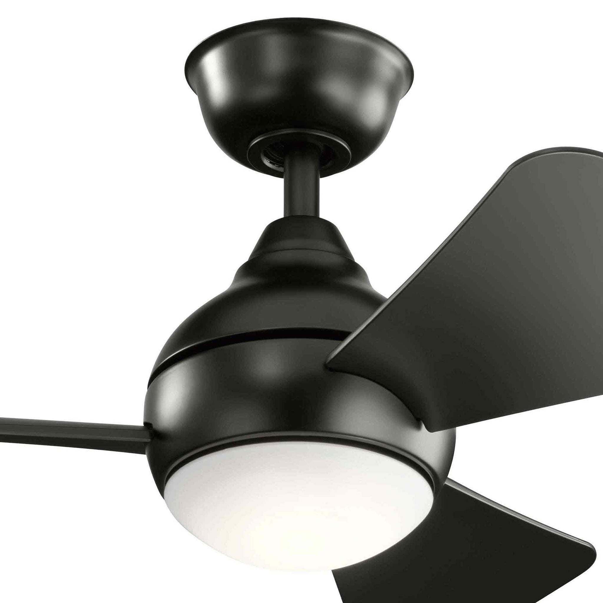 This Satin Black 34 inch ceiling fan from the Sola collection which can be used in wet locations, features integrated LED lighting and flush mount installation. The globe inspired motor housing shape brings delightful style to any space. A metal fixture cap is included for non light use installations.