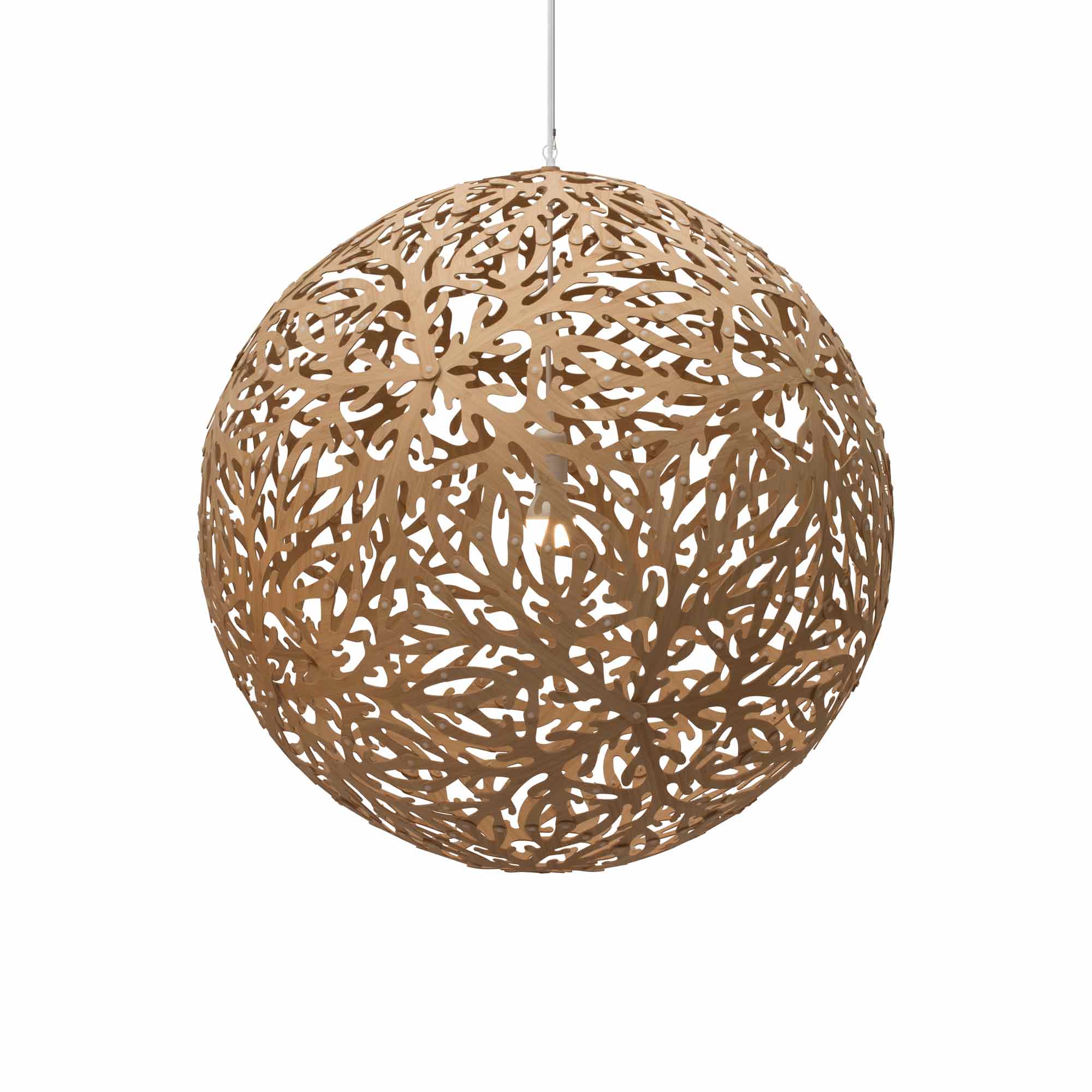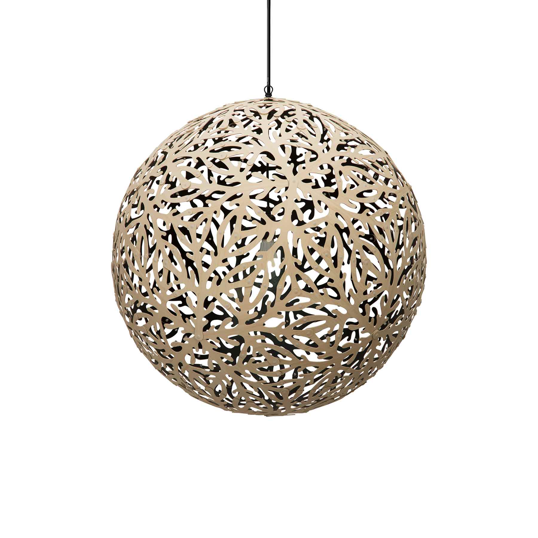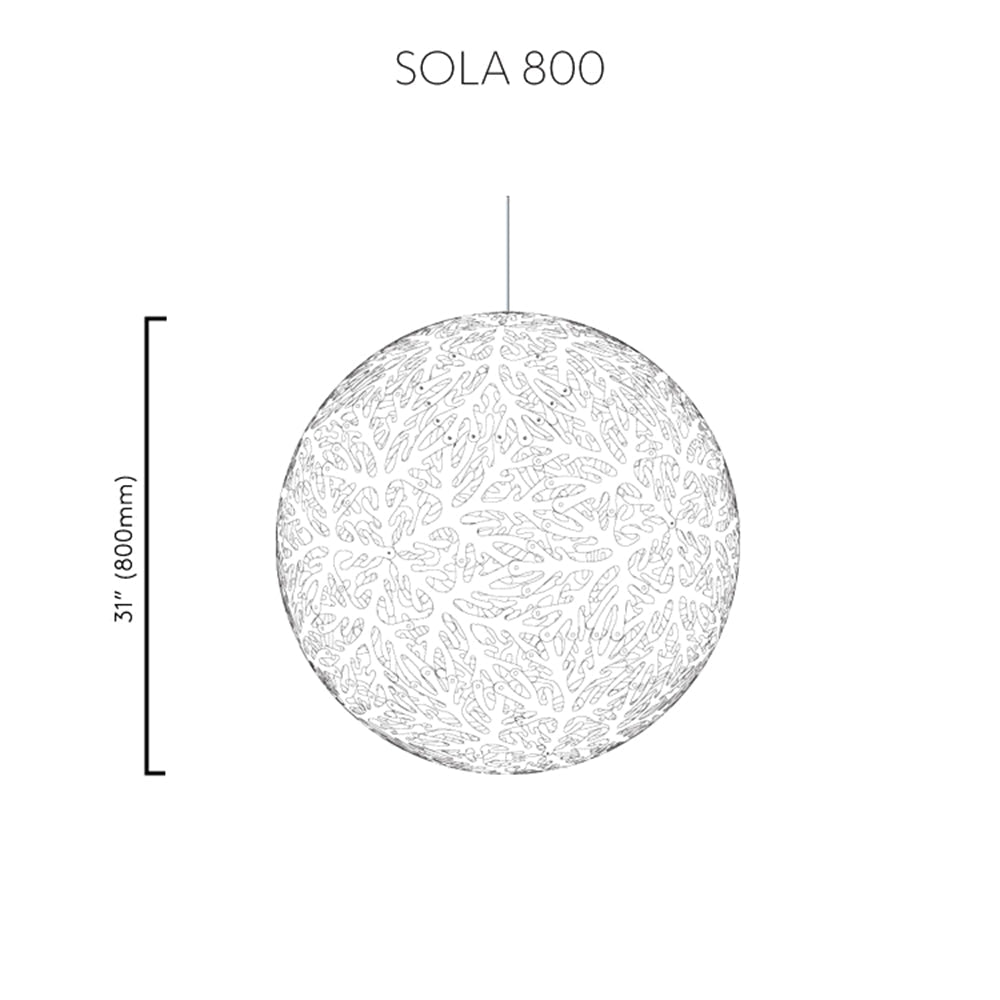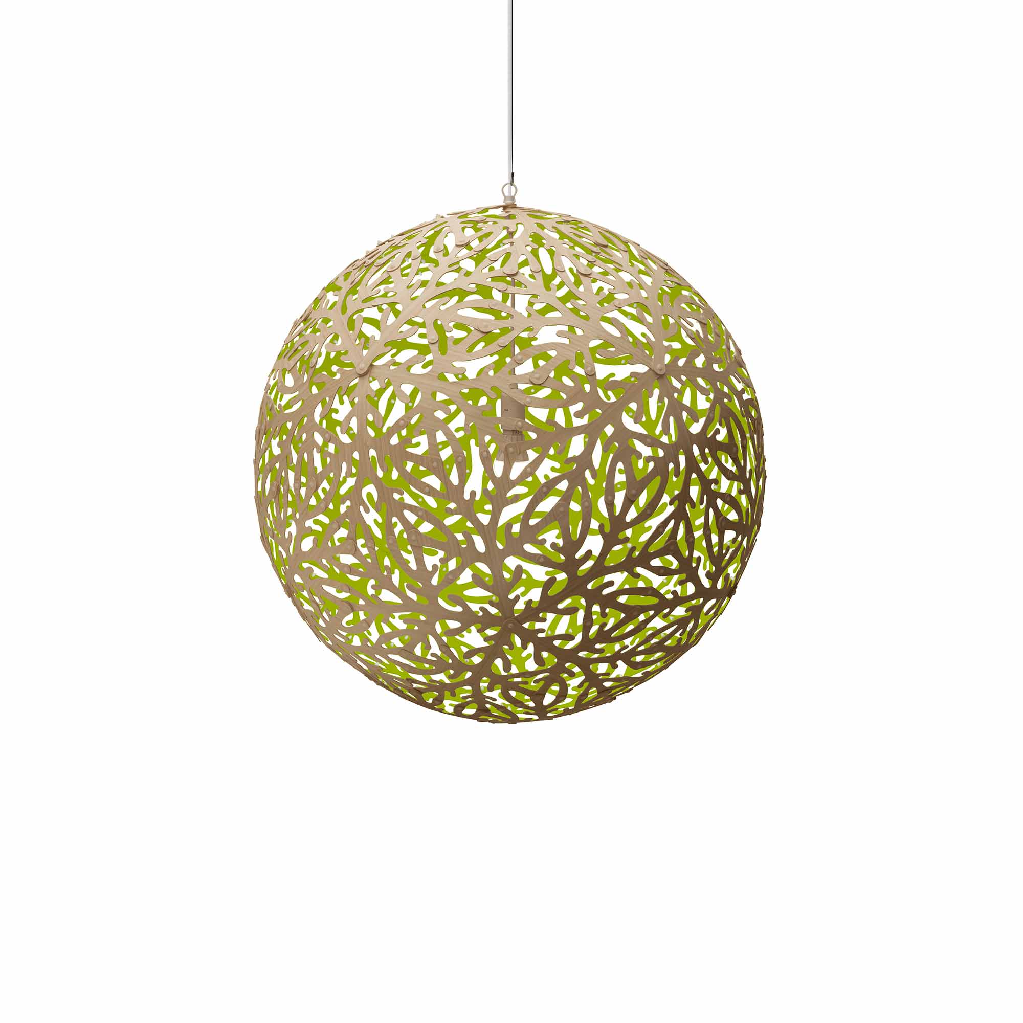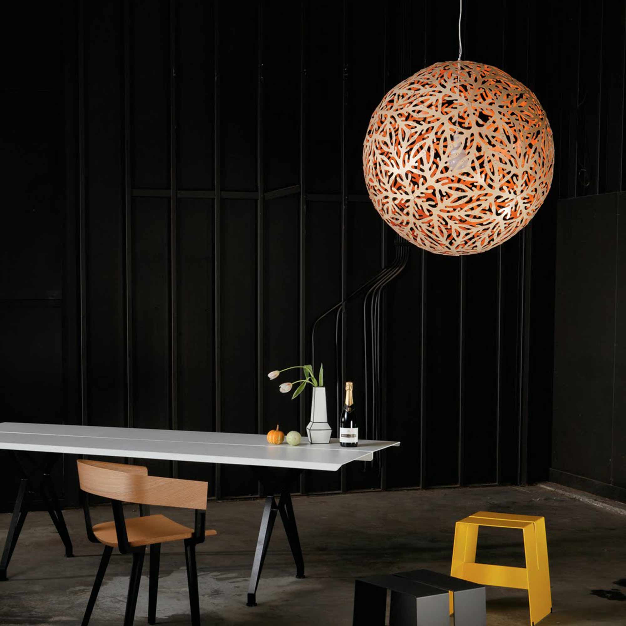 Highly decorative, the Sola Pendant Light from David Trubridge is constructed of intricate, intertwined fronds that spill light to create engaging, artistic shadow patterns across a foyer or dining room. Its orb silhouette introduces a sense of balance and symmetry to its complex, geometric structure.