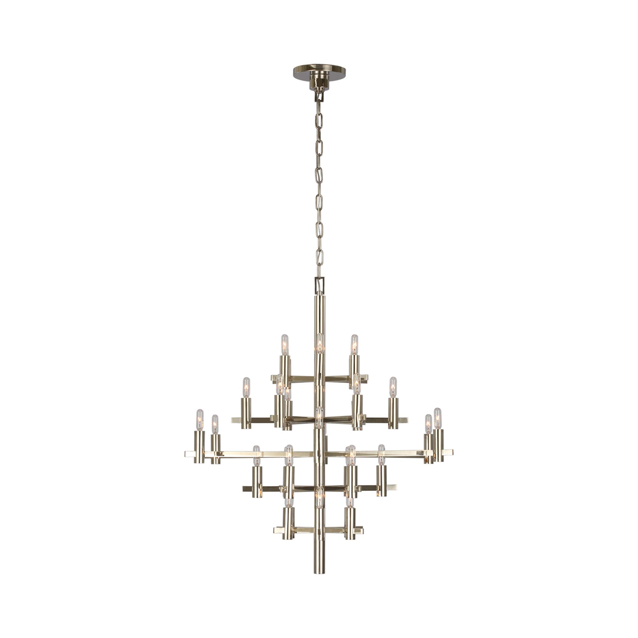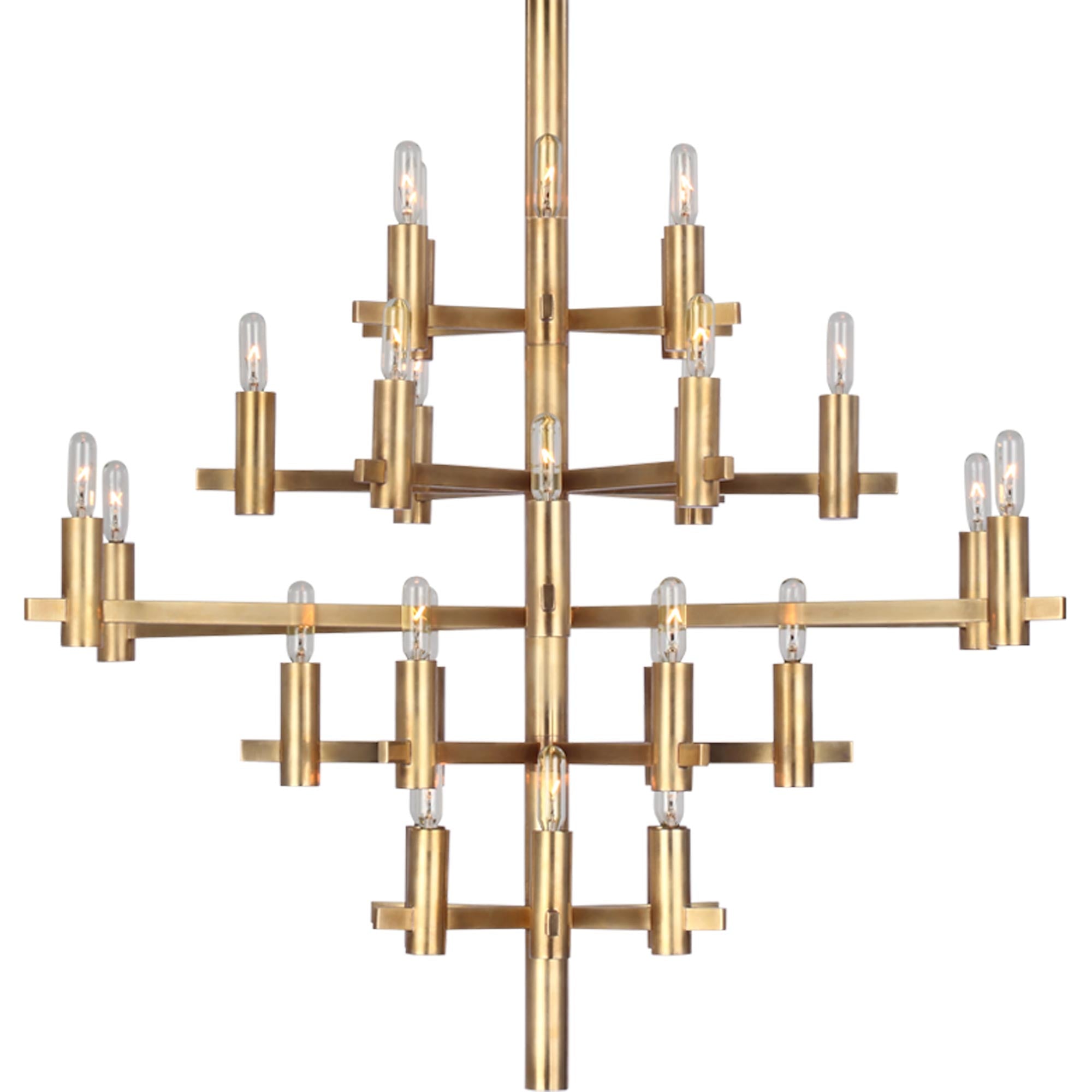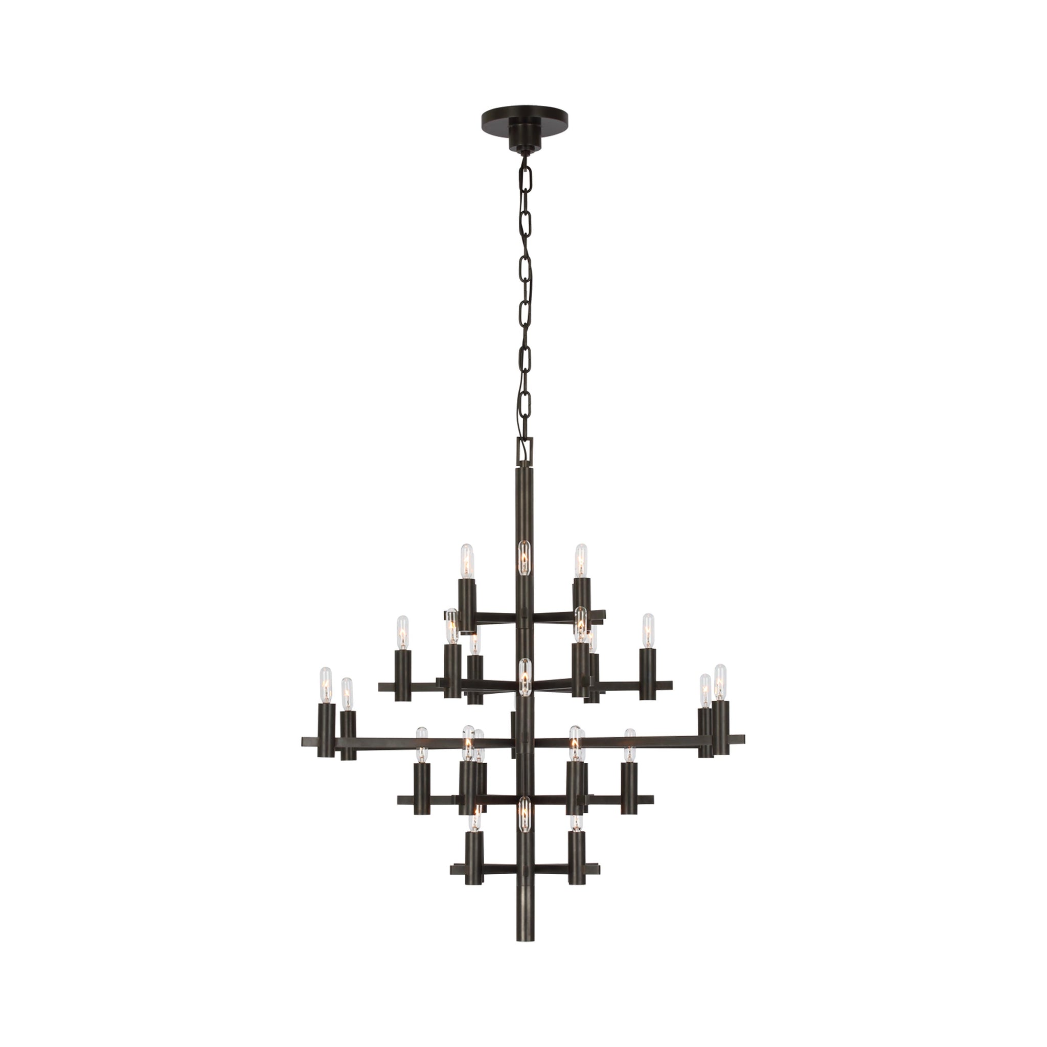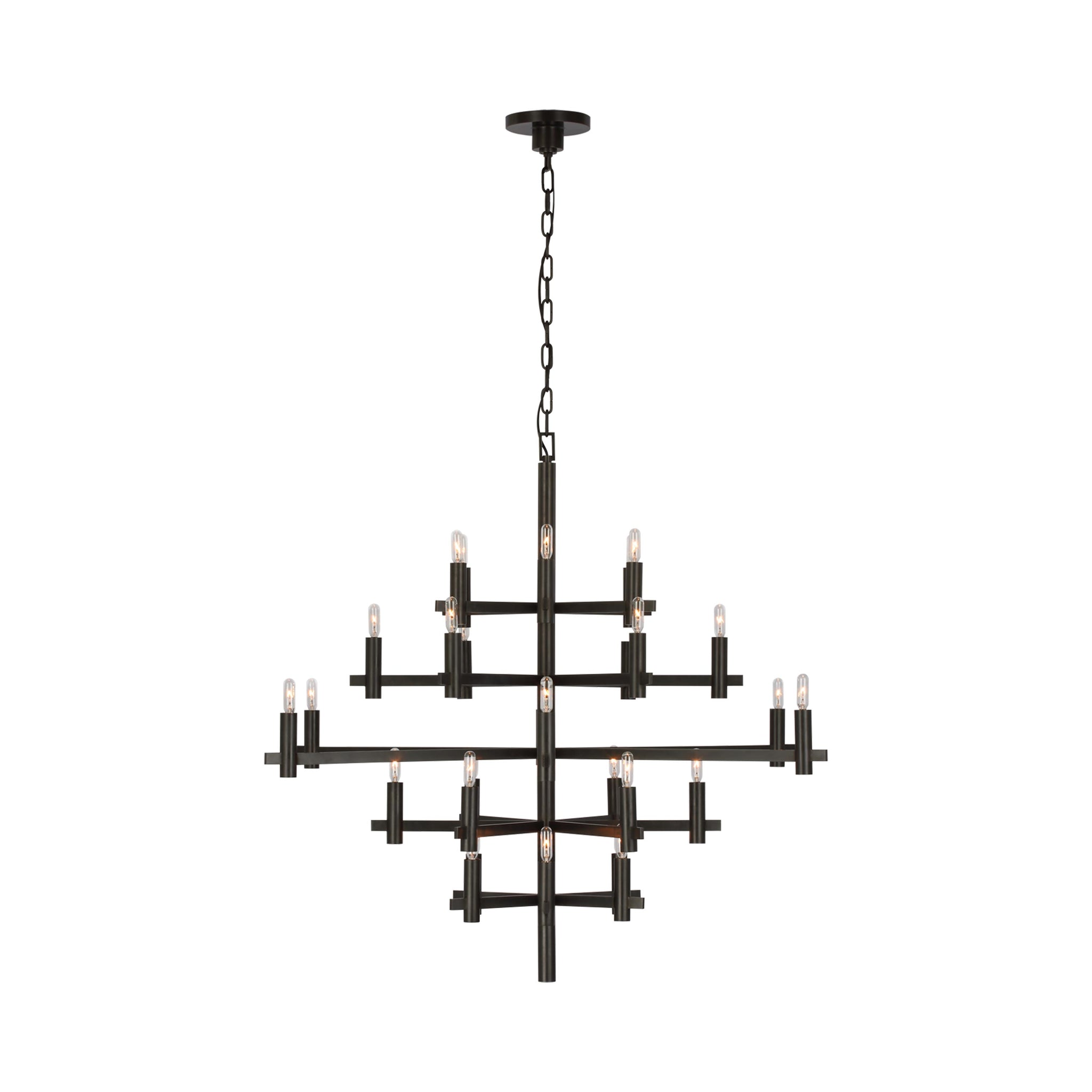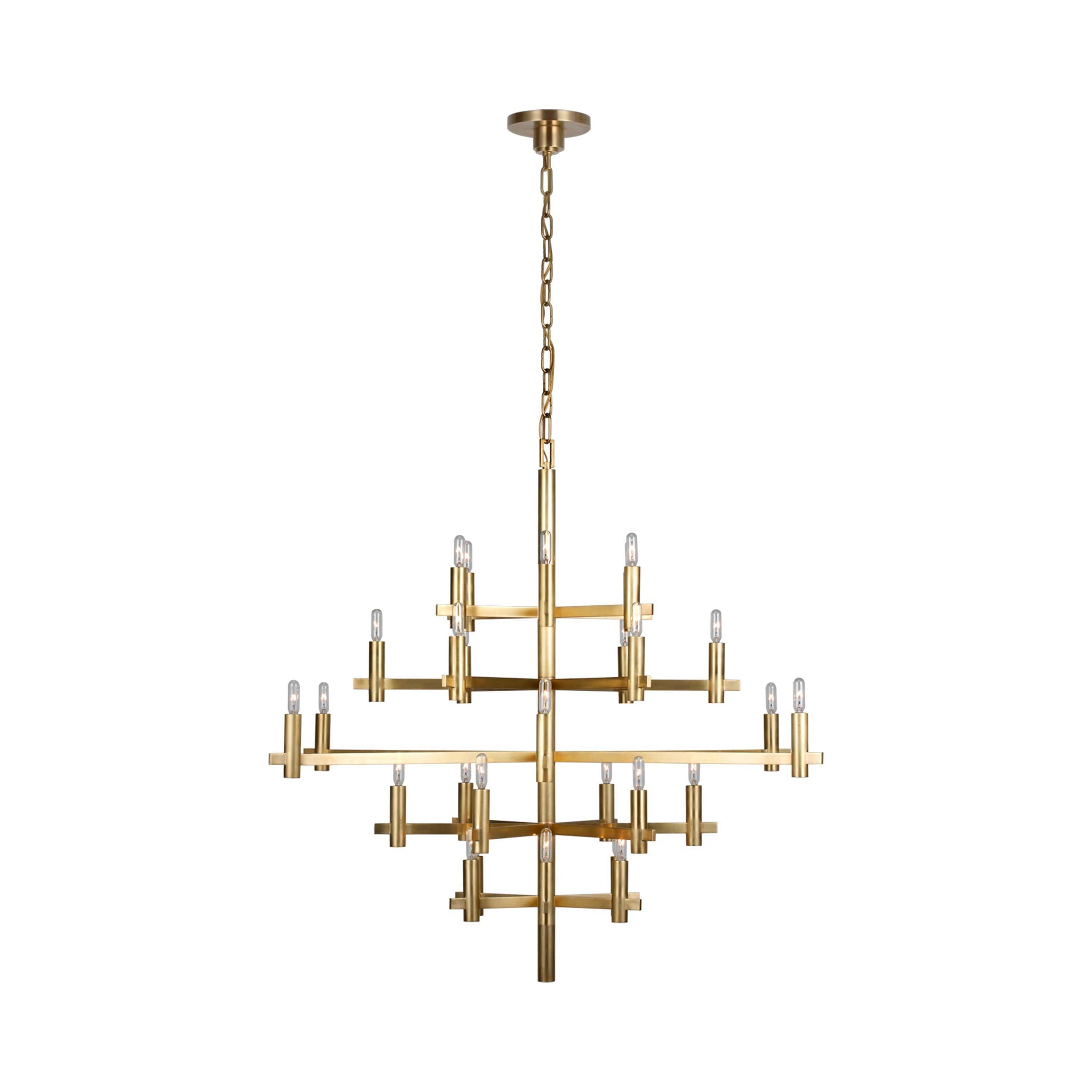 Striking contemporary silhouetting merges design motifs, transforming the Sonnet Chandelier from Visual Comfort Signature into a primary décor element in a tailored living space. Embrace a structured shape featuring rows of LED candelabra-style bulb sockets that deliver an unforgettable blend of old and new.