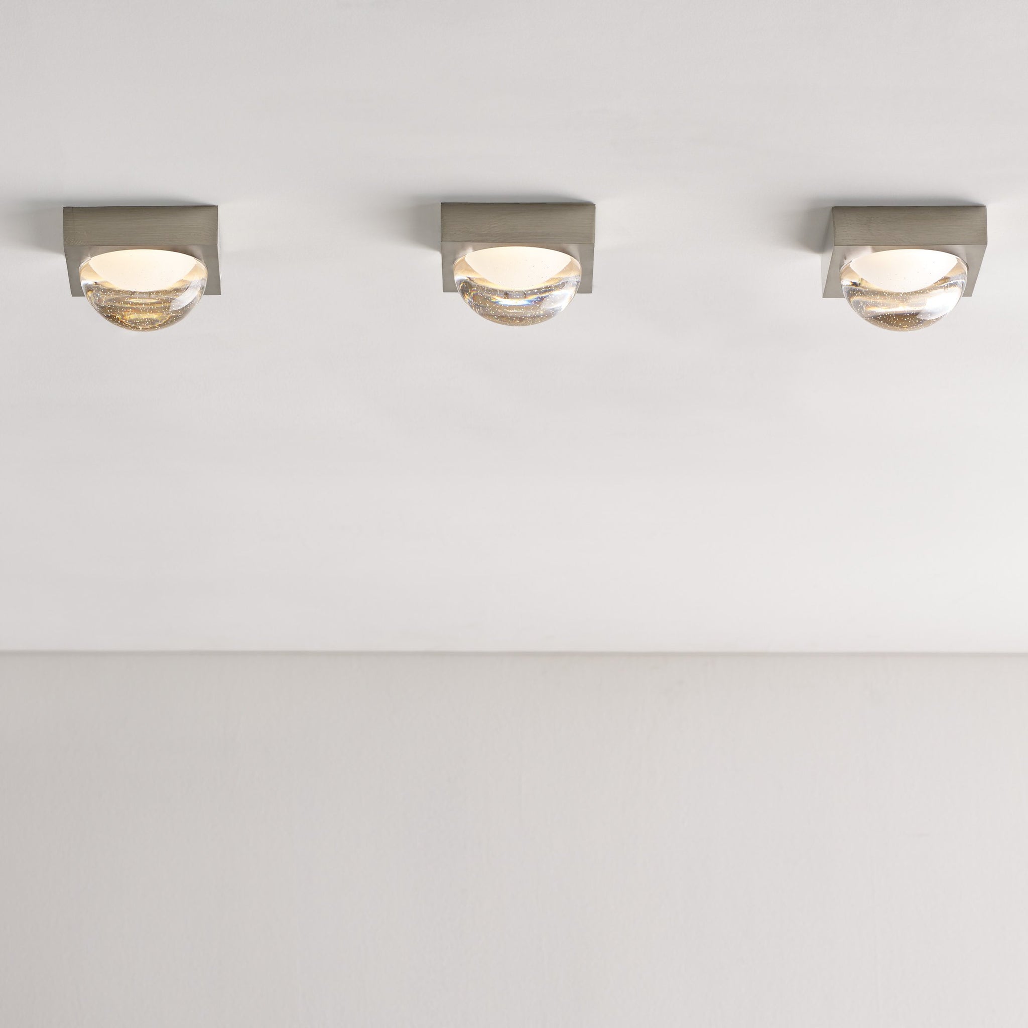 A square back-plate is in perfect contrast to the spherical glass shade in the wholly modern silhouette of the Sphere LED Flush Mount Ceiling Light from Visual Comfort Modern. Offered in the Visual Comfort Modern Satin Nickel finish, the Sphere Flush Mount is an elegant solution to creating light in your space. Install with multiples to further enhance your design. The proprietary warm color dimming LED module gradually changes color from 3000K to 2200K as it dims to mimic the soft glow of traditional halogen lamping.