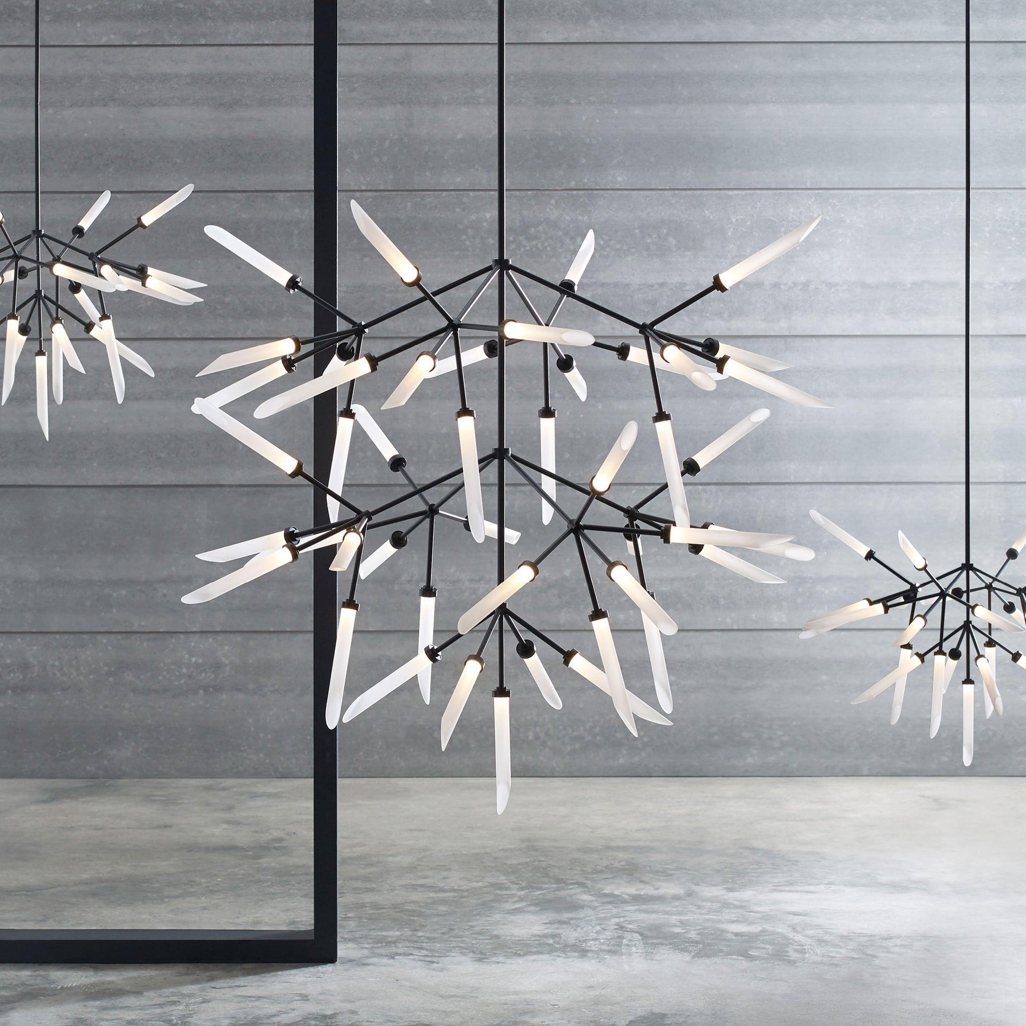 The Spur Grande LED Chandelier from Visual Comfort Modern is a modern interpretation of the classic multi-arm chandelier, nine arms each feature a cluster of five glass spurs dramatically extending in opposing directions. Whether you select the warm aged brass finish or the sleek satin nickel finish, each chandelier features forty five individual frosted glass spurs which accent the LED light sources for an unmistakable high-end look. With its impactful scale and plentiful, fully dimmable LED light output, the Spur Grande chandelier is sure to make a dramatic modern statement as dining room lighting, living room lighting or foyer lighting. If you have something a bit smaller in mind, be sure to check out the medium scale Spur chandelier also available from Visual Comfort Modern.