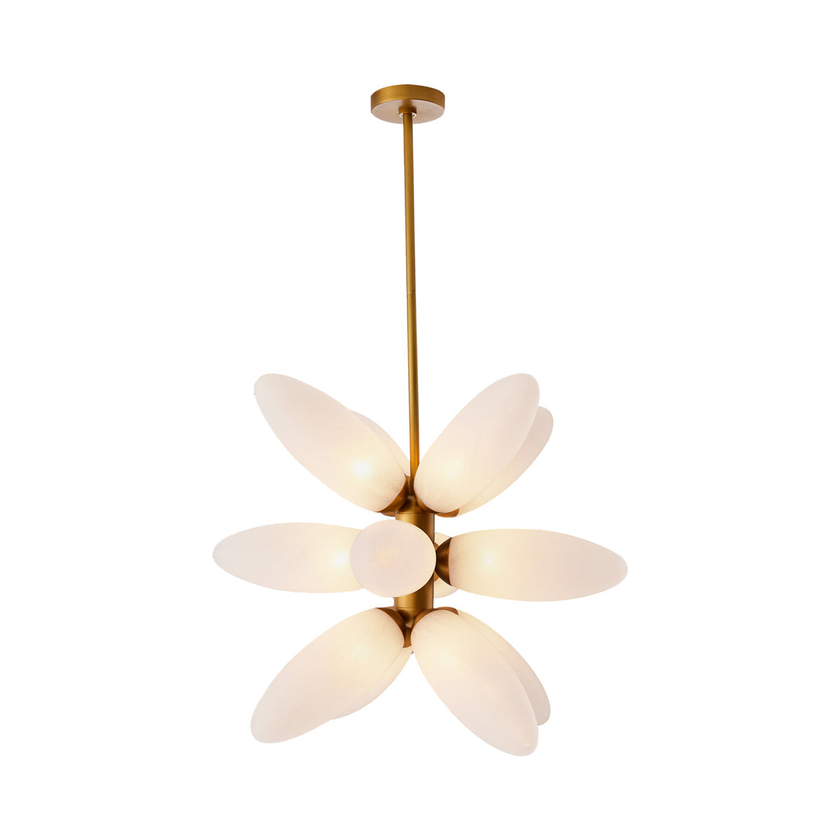 With the fragility of eggs in a bird’s nest, the Starling Chandelier from Arteriors reflects careful, delicate artistry, as well as promise of new life for a modern or transitional space. This fixture offers an alternate motif of a futuristic Sputnik fare, with carefully placed elongated ellipsoid shades made of matte white swirl glass, clinging to a linear and pipe-like antique brass steel frame.
