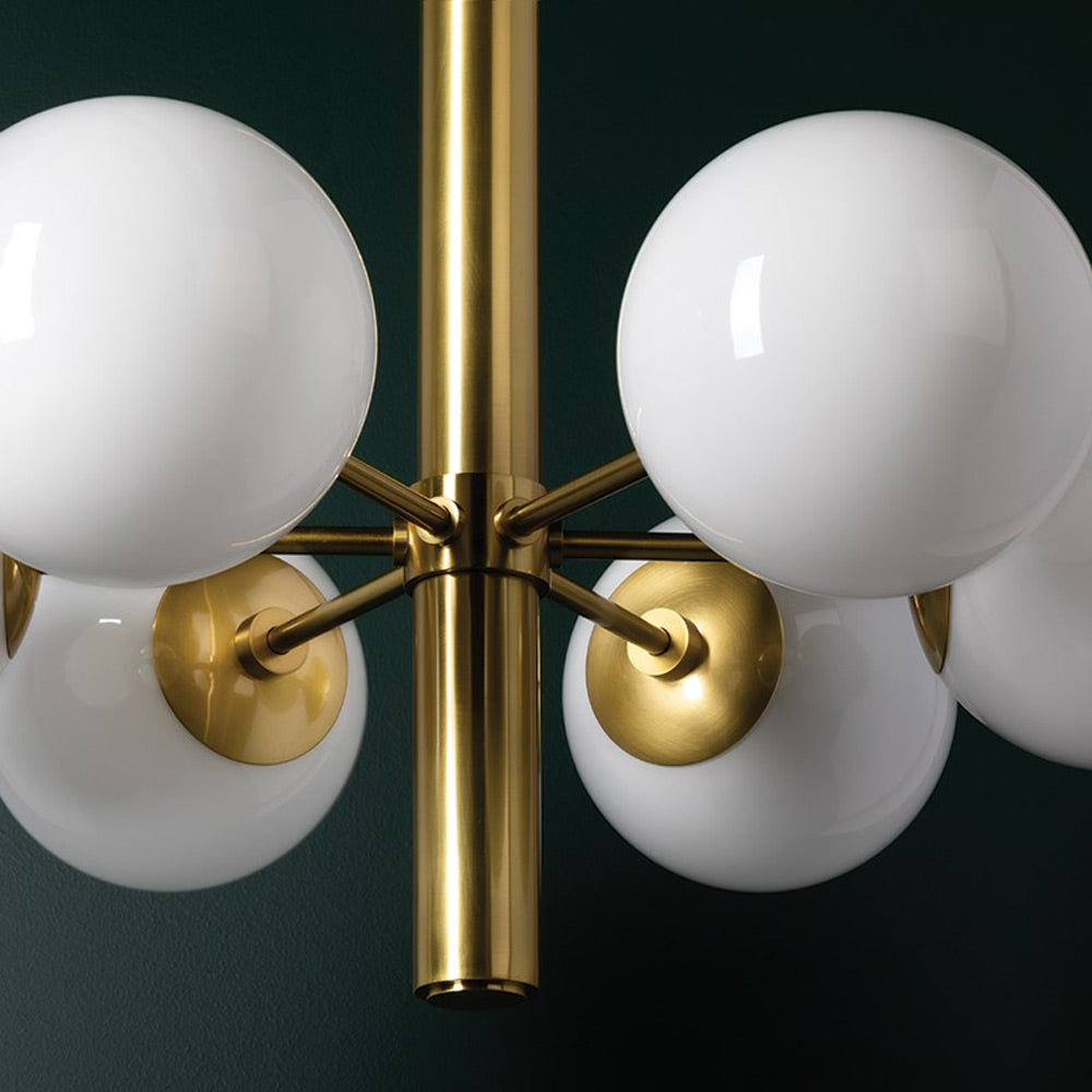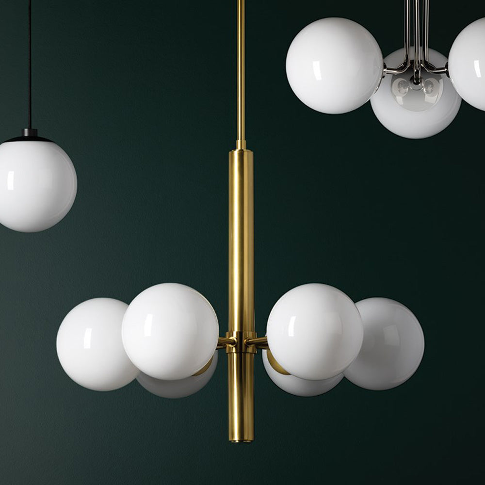 A veritable explosion of bubble silhouettes begins a festive look to the Stella Chandelier from Mitzi, a compelling fixture with dynamic design elements. Add light and lightness to a modern setting with a chandelier offering a slightly linear silhouette beginning with cool metal pipe-like framing and arm mounts. Opal glossy globe shades encircle its frame, offering a floating effect and visual glee.