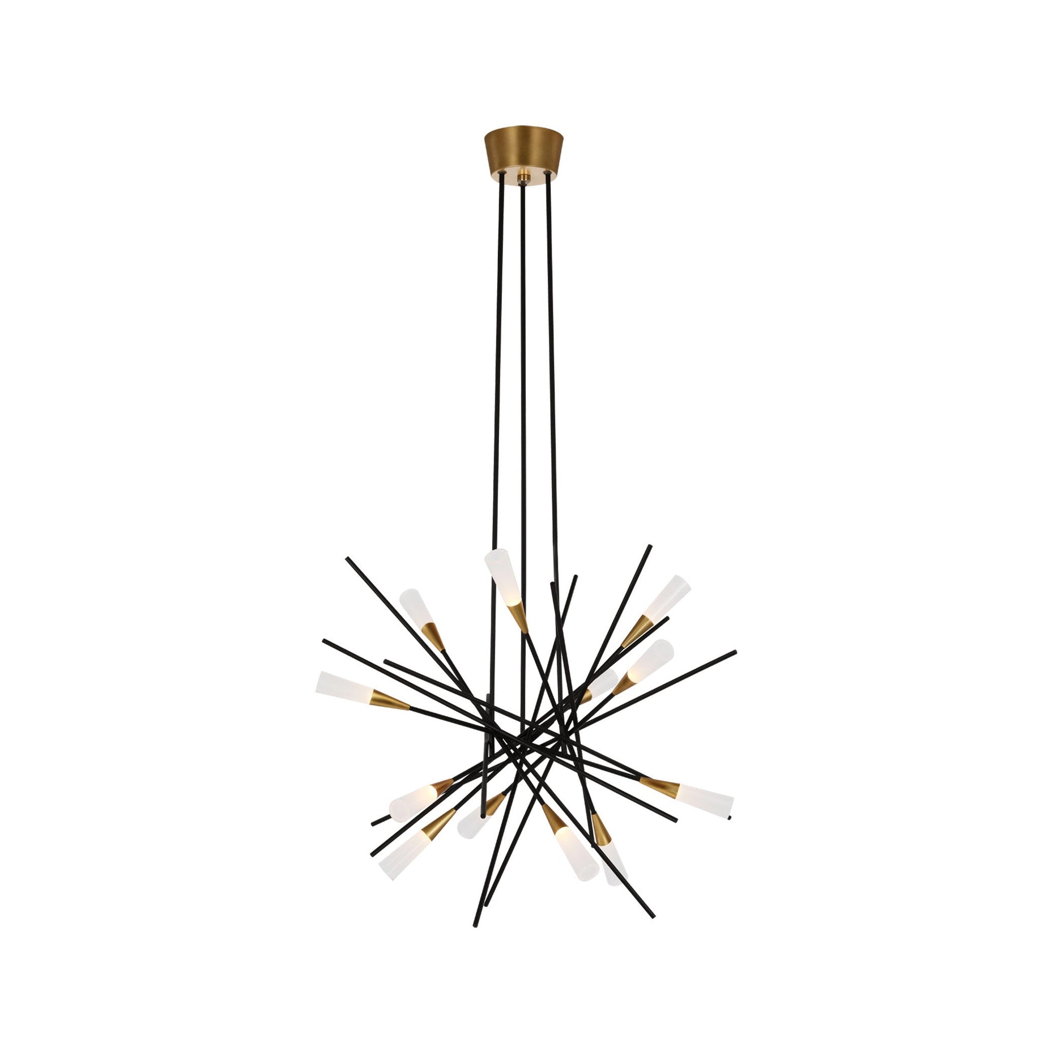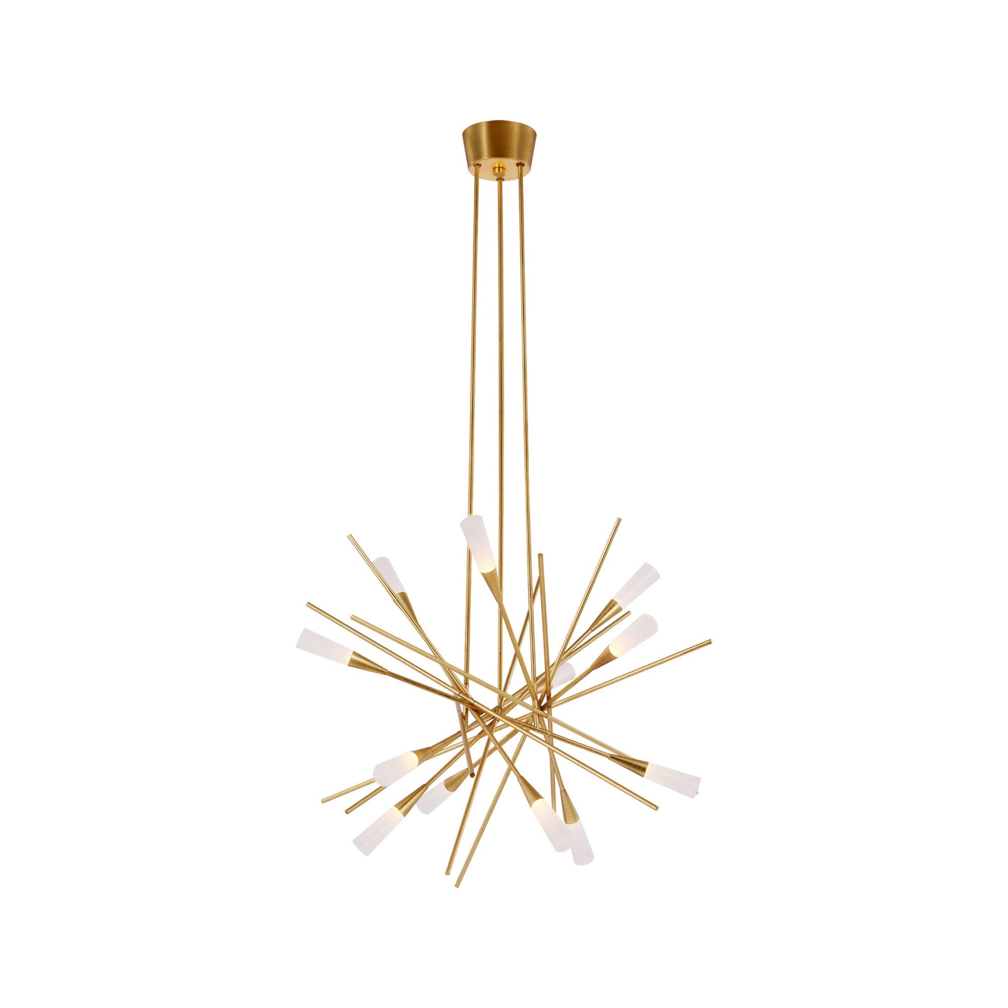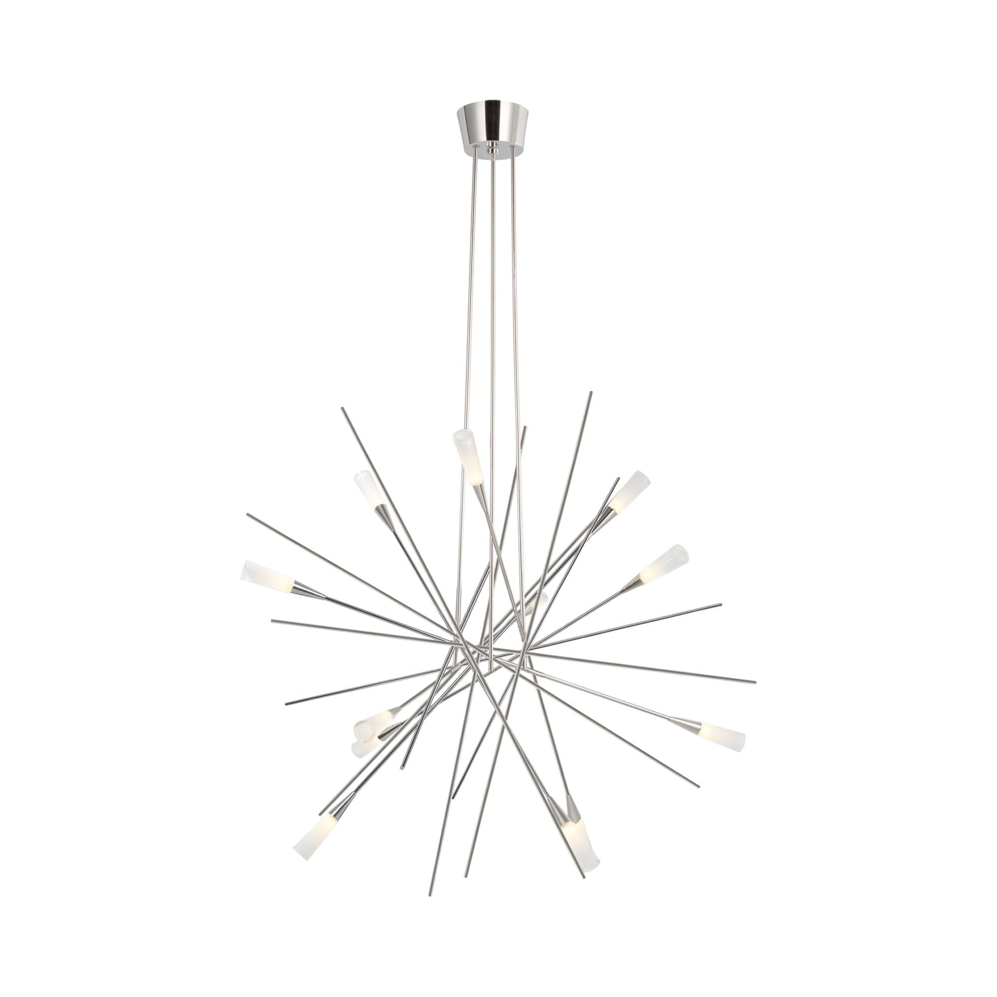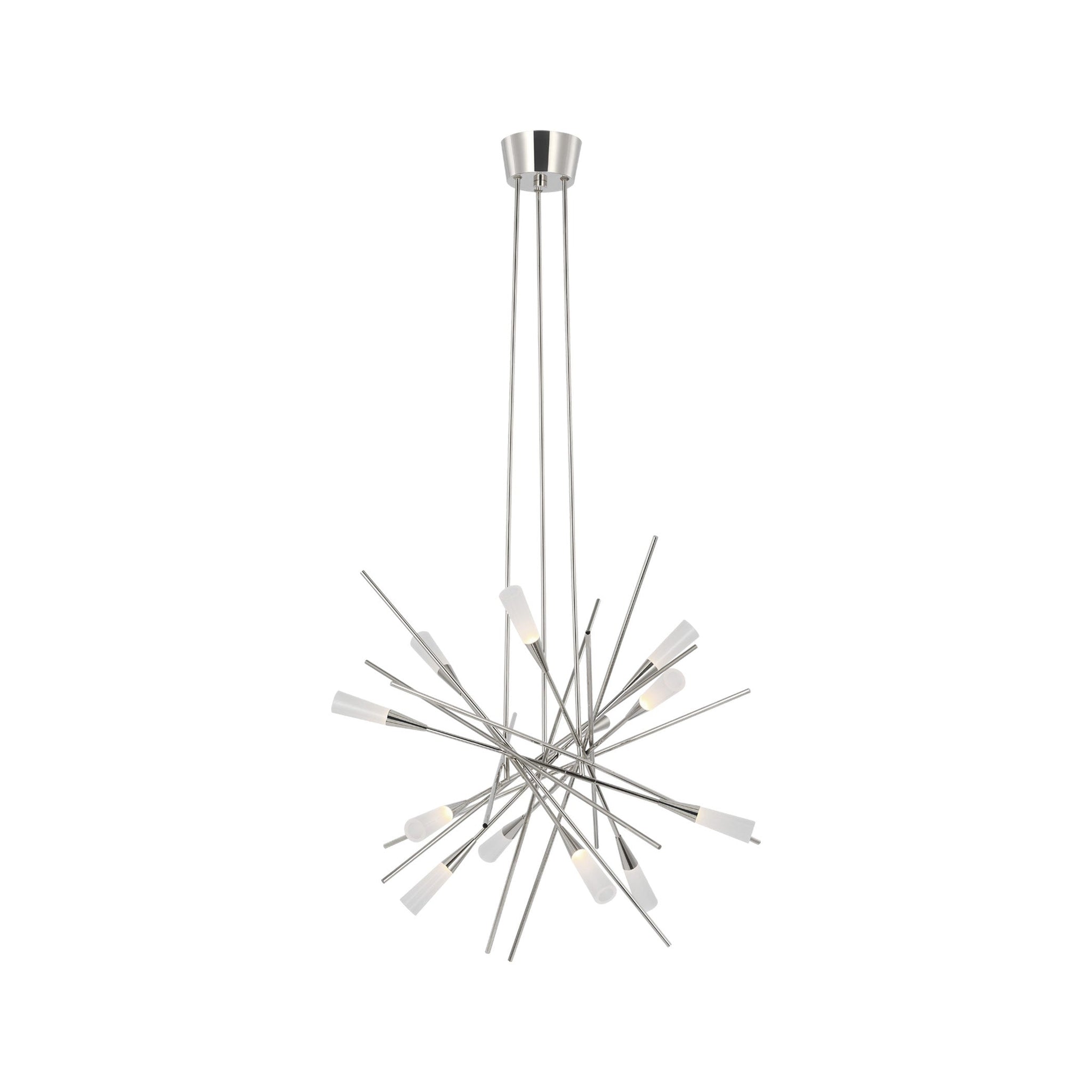The promise of futuristic inspired vibes modernizes the Stellar LED Chandelier from Visual Comfort Signature, a striking source of ambient lighting in a contemporary space. Slender metal rods arrange haphazardly, some culminating in petite conical shades that evenly distribute illumination effects.
