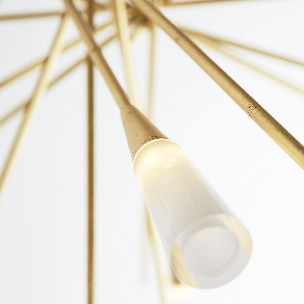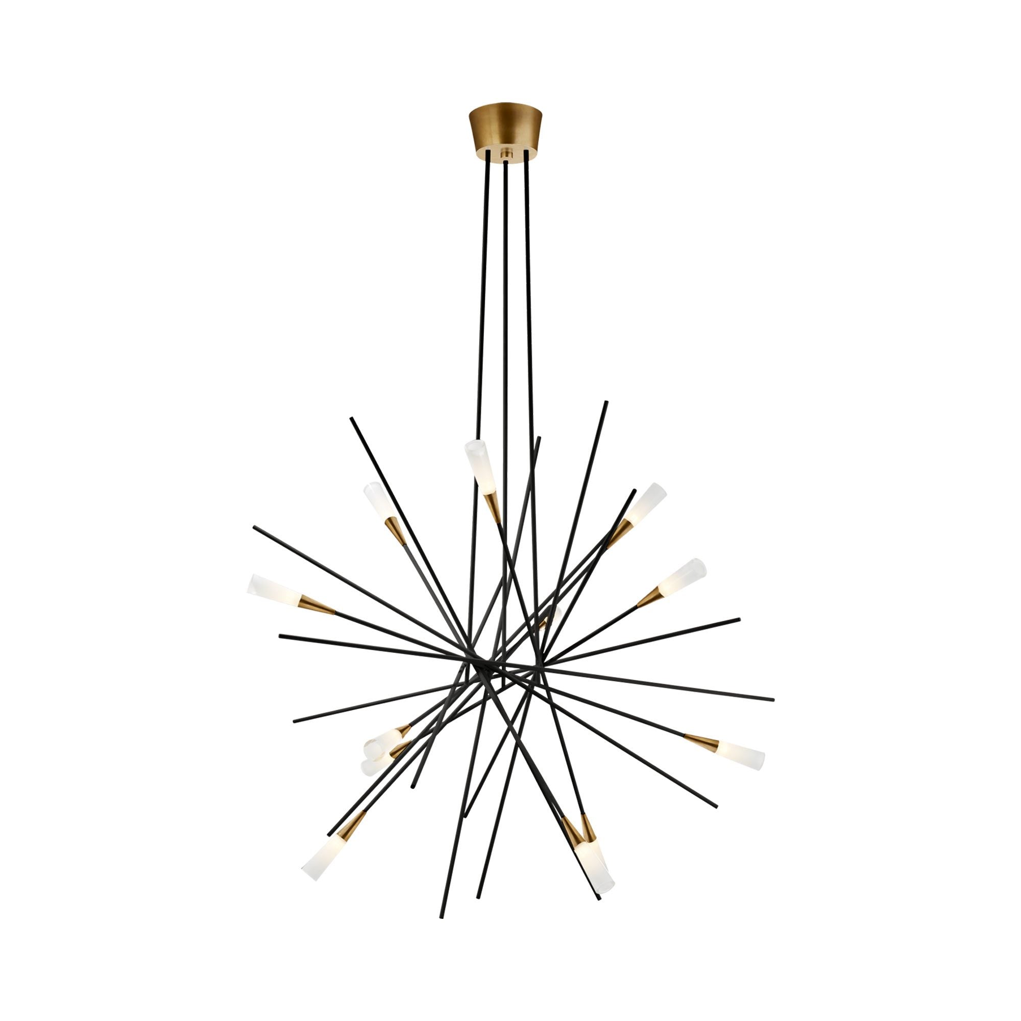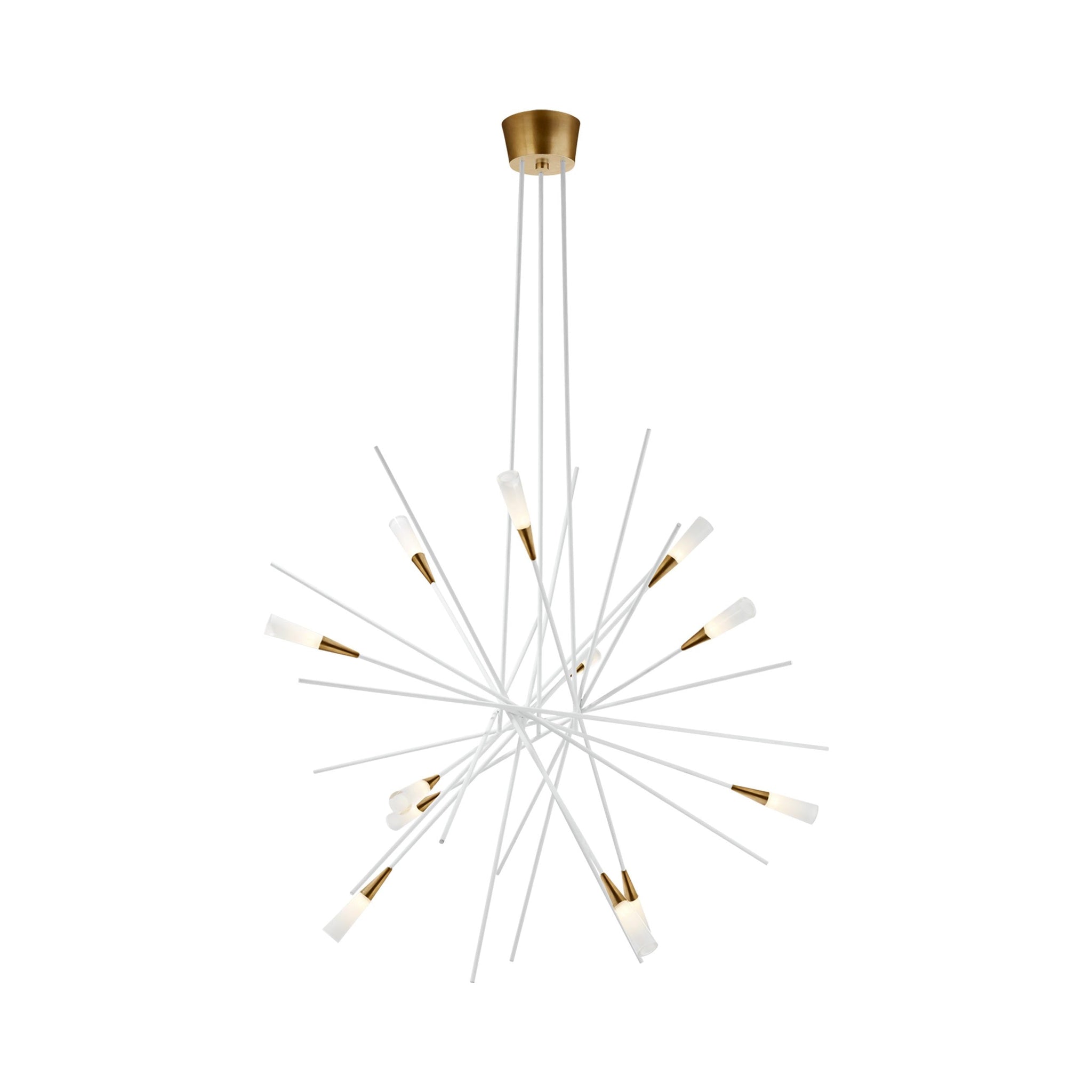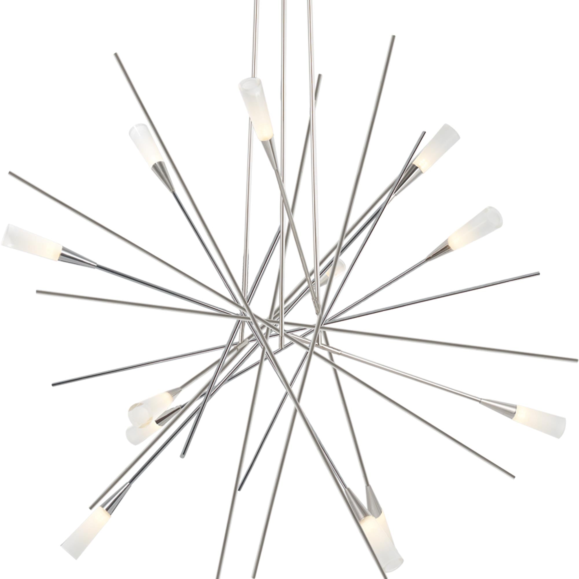 The promise of futuristic inspired vibes modernizes the Stellar LED Chandelier from Visual Comfort Signature, a striking source of ambient lighting in a contemporary space. Slender metal rods arrange haphazardly, some culminating in petite conical shades that evenly distribute illumination effects.