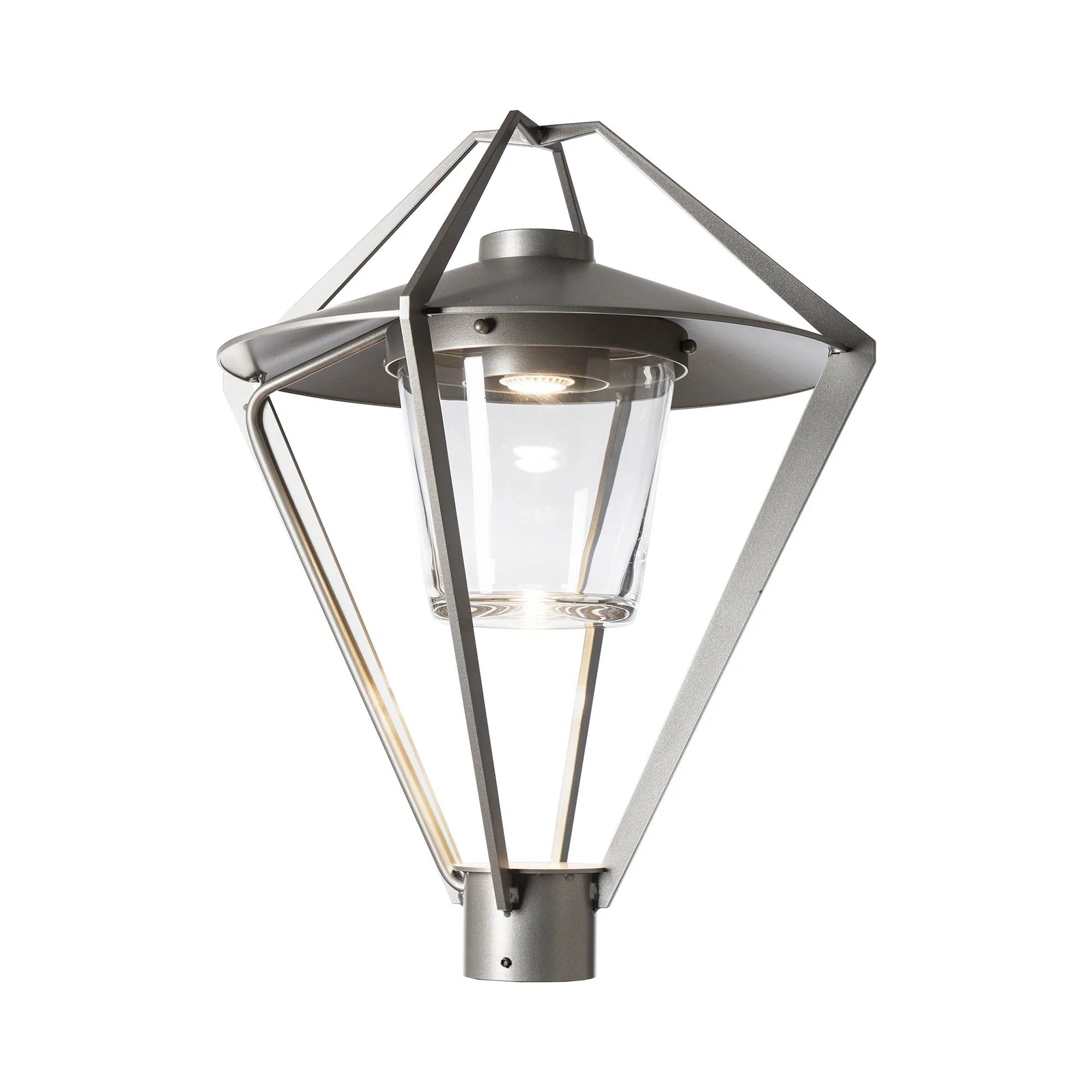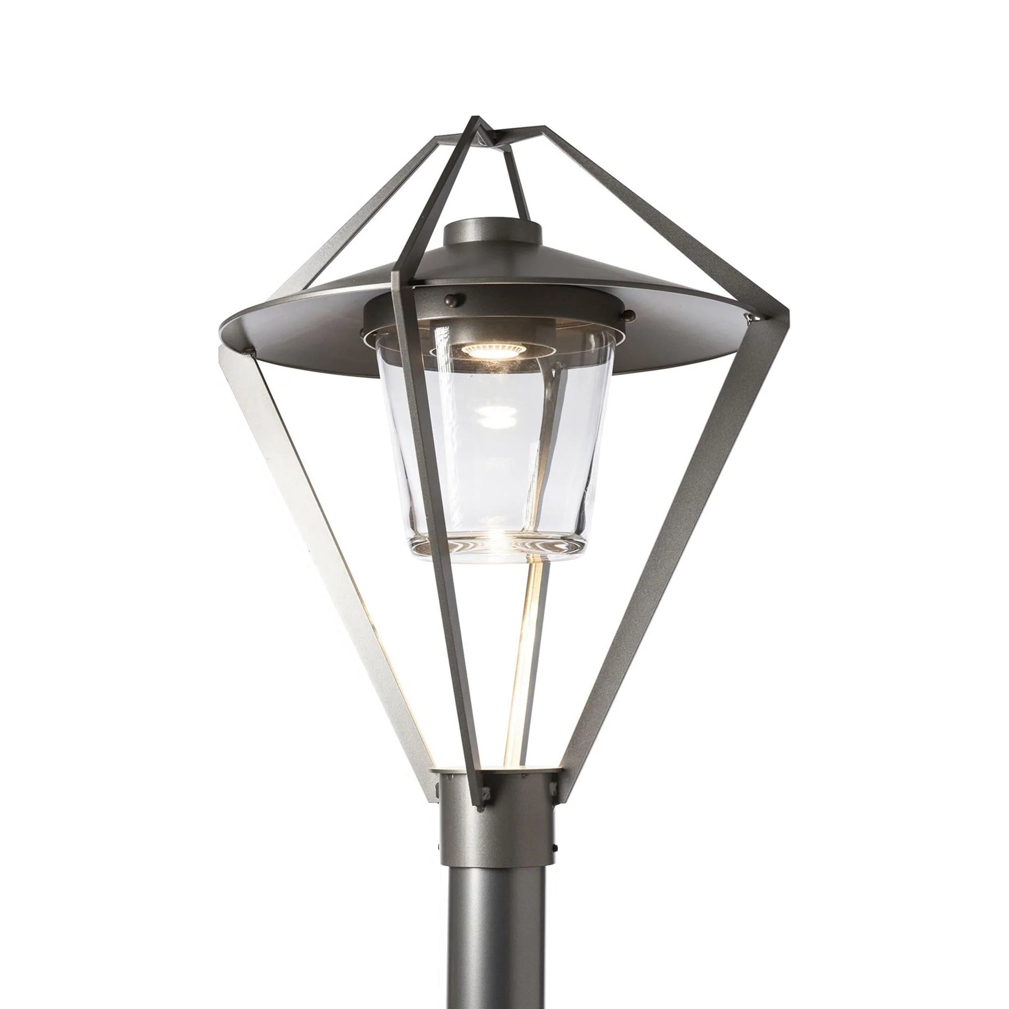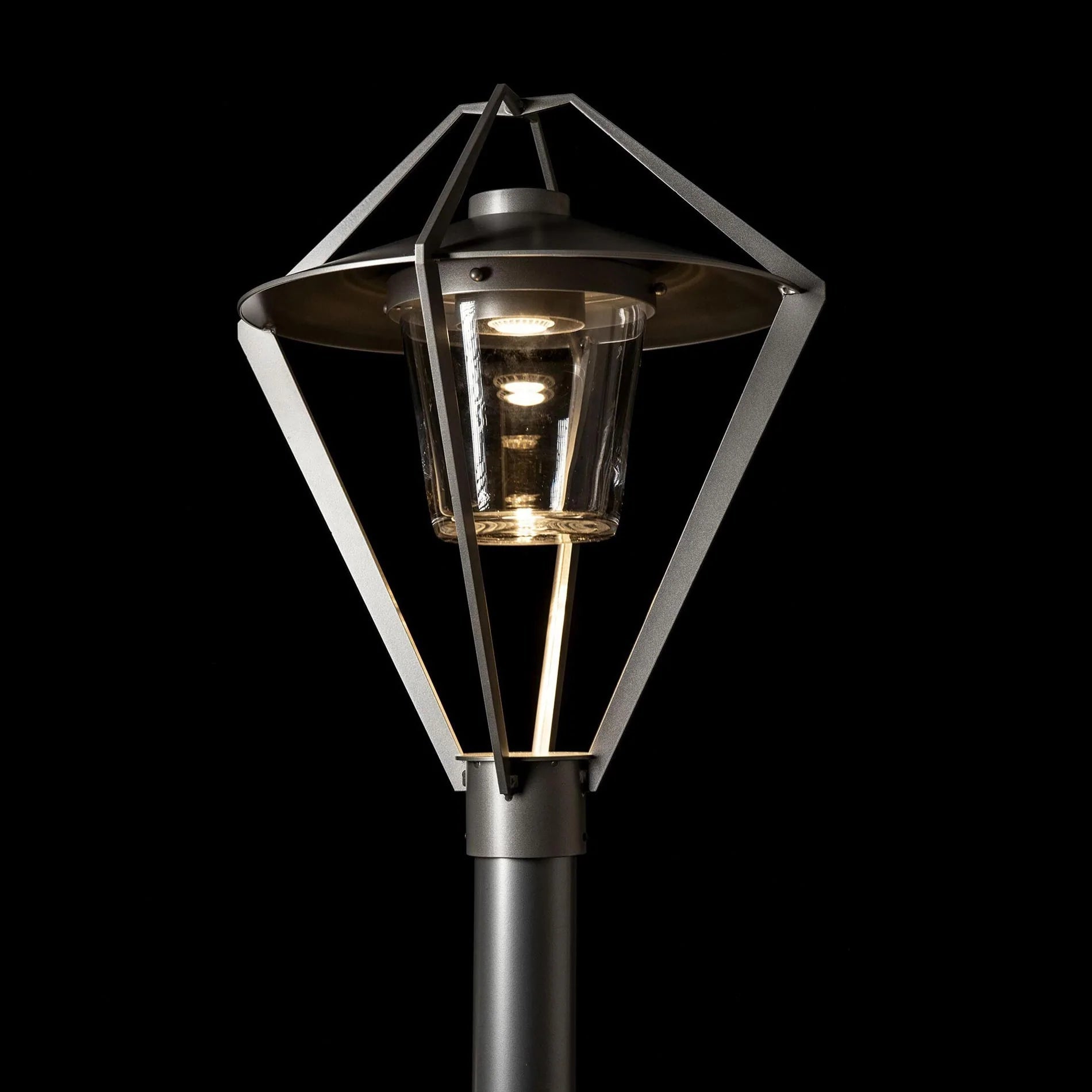 The Stellar Outdoor Post Light from Hubbardton Forge explores the dynamic design motif of geometry with an extra dose of sophistication. Call attention to customized yard spaces, driveways, and landscaped areas with this fixture delivering an openwork metal frame emulating lantern-style silhouetting. A thick clear glass tapered shade and metal hat top element embellish the storied artistry of an impactful outdoor fixture.
