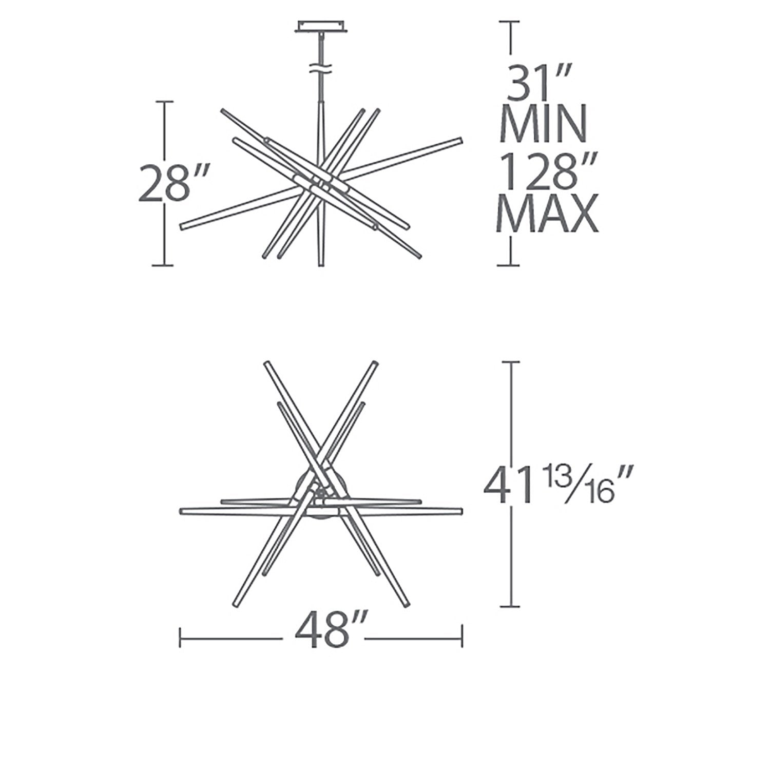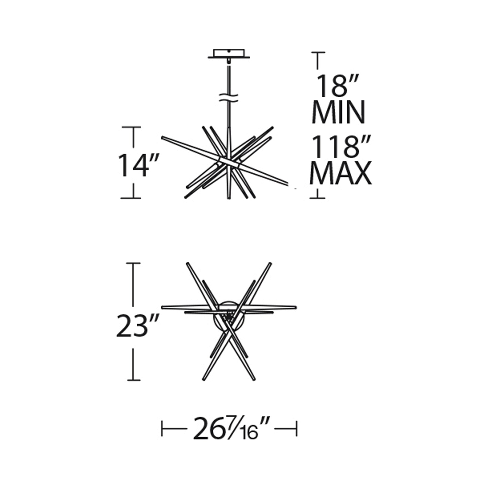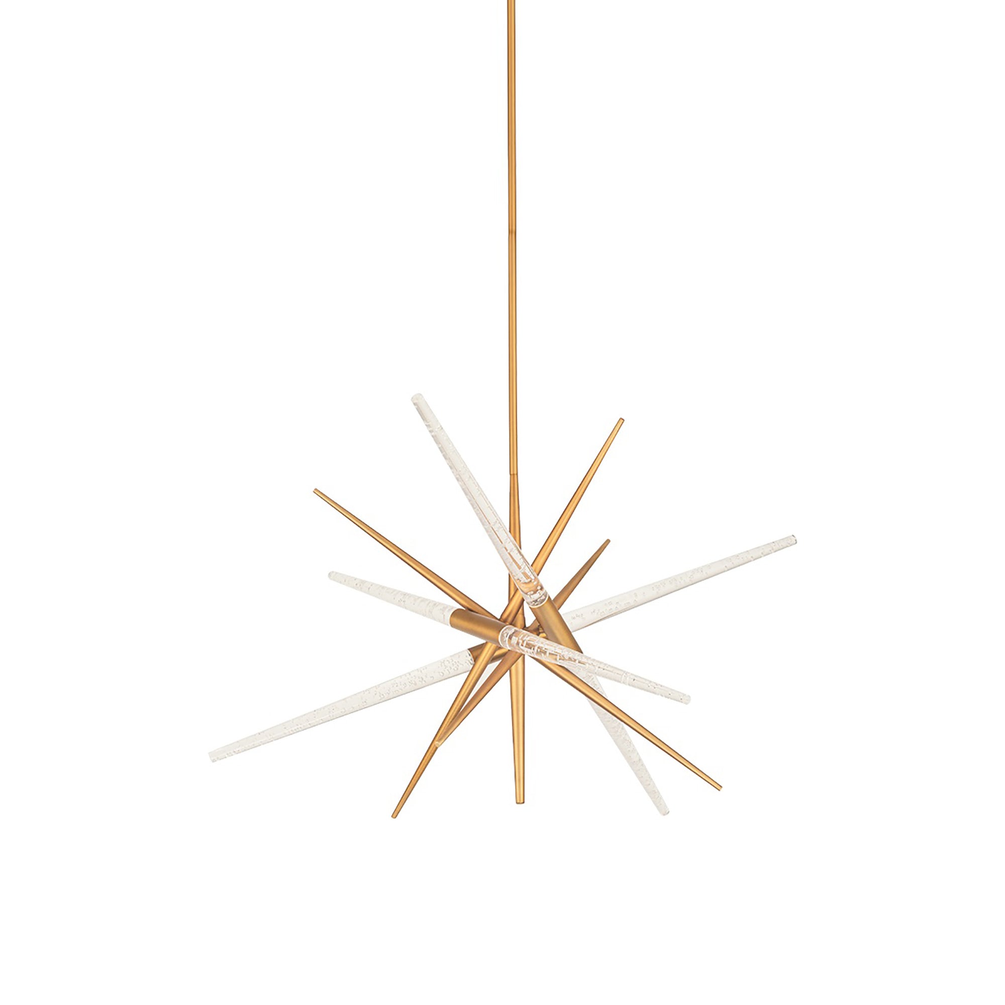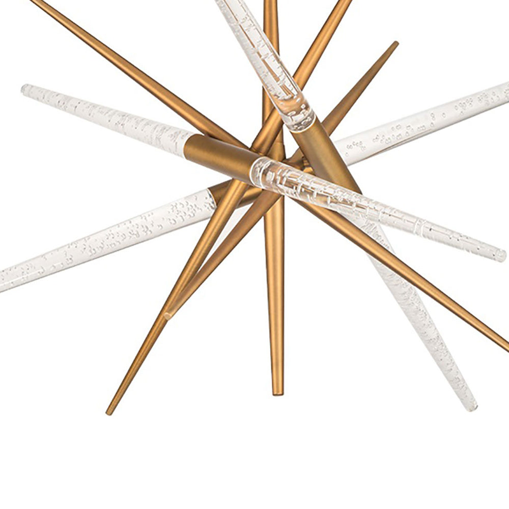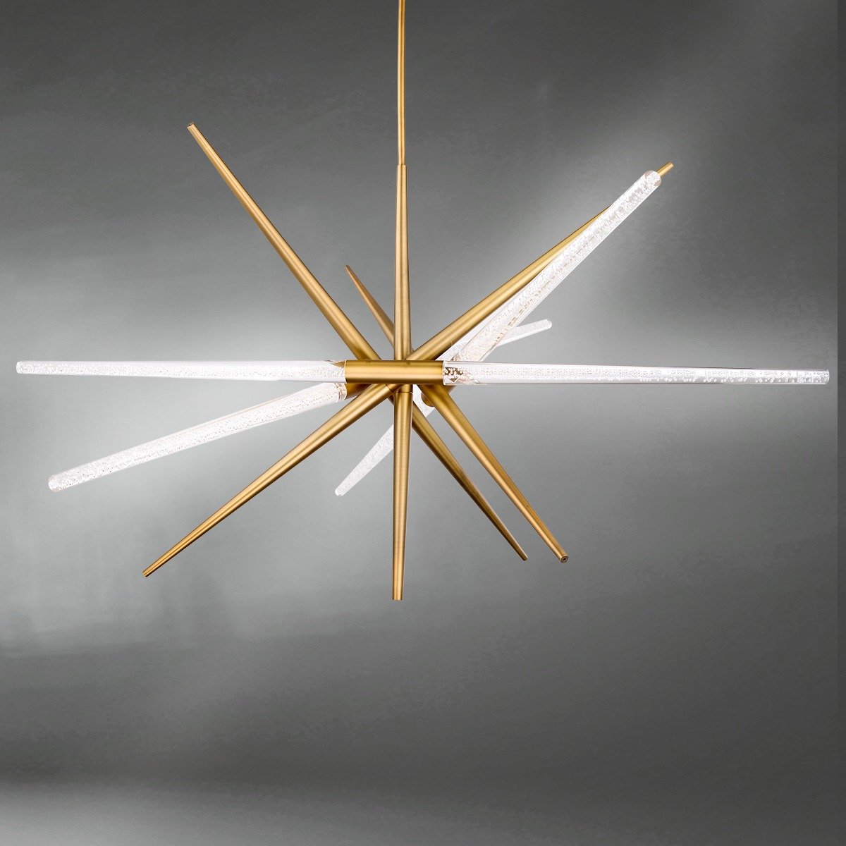 Wish upon a star with this signature wow piece that will leave you speechless and gazing for more. Modern aesthetics integrate six dazzling elements of light with state of the art LEDs that project shimmering rays of illumination on ceilings and walls. A breathtaking chandelier for lobbies, foyers and large spaces. Magical wands crafted of seeded acrylic embrace fashionable hardware in aged brass or polished nickel. Dims down beautifully to 10 percent. This chandelier complements a matching wall sconce for a complete decorative look. Two sizes available.
