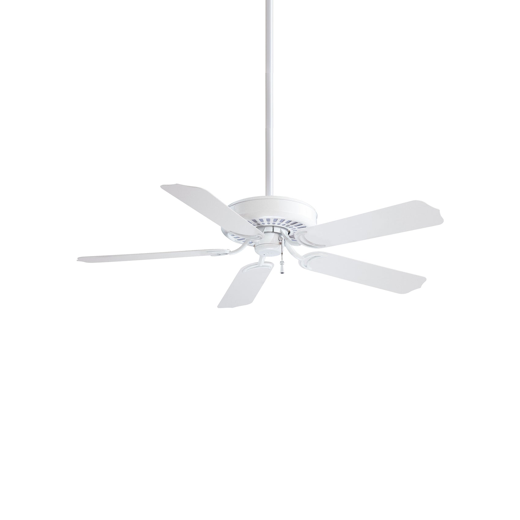 Sporting a vintage industrial vibe, the Sundance Ceiling Fan from Minka Aire adds a classic accent to traditional and modern farmhouse spaces, focusing on design simplicity and construction of strictly metal. A prominent down rod and shapely tips on five wide fan blades join a stylish motor with a pull-chain to operate on three different speeds.