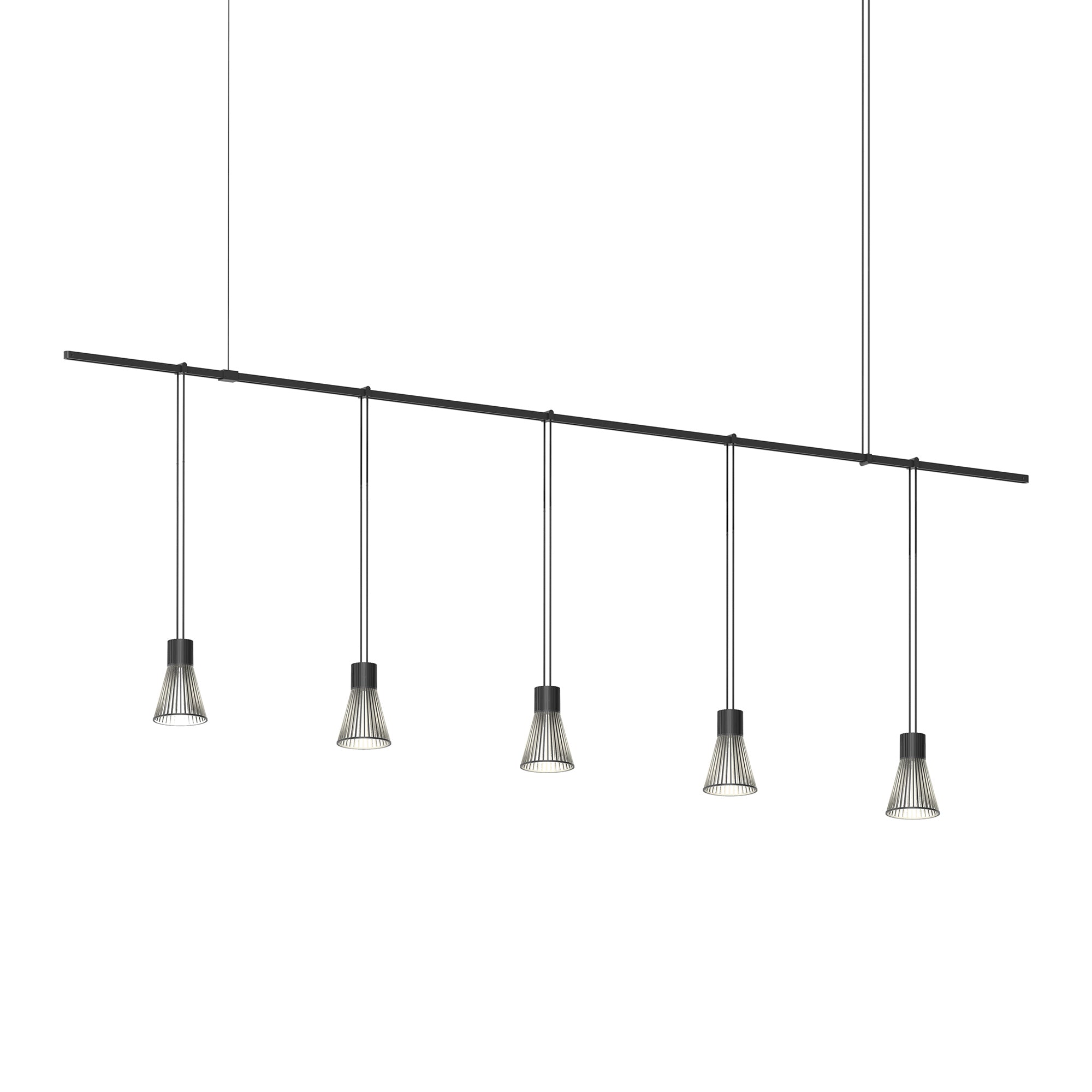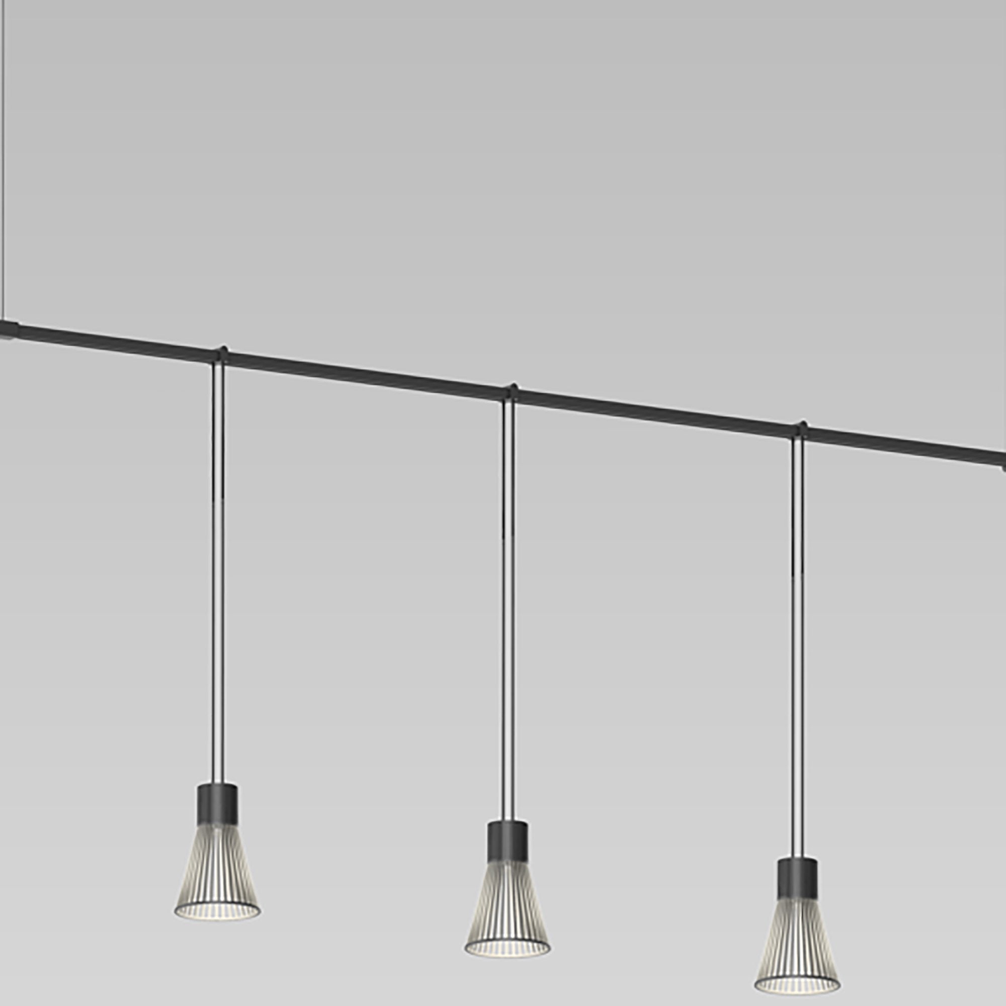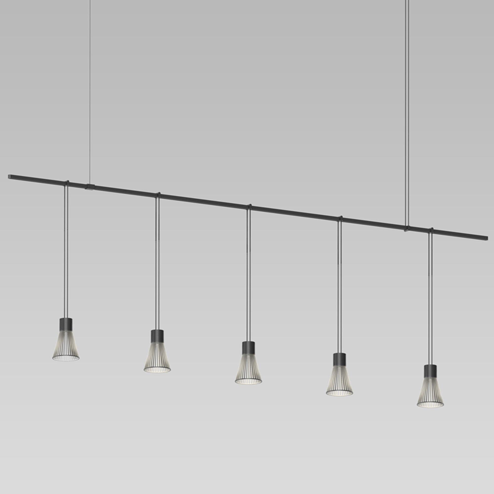 Repurposing a whimsical linear circus theme, the Suspenders® 1-Tier Linear LED Pendant Light from Sonneman Lighting reflects order and clean silhouetting with a die-cast aluminum frame and charming ribbed glass parasol shades.