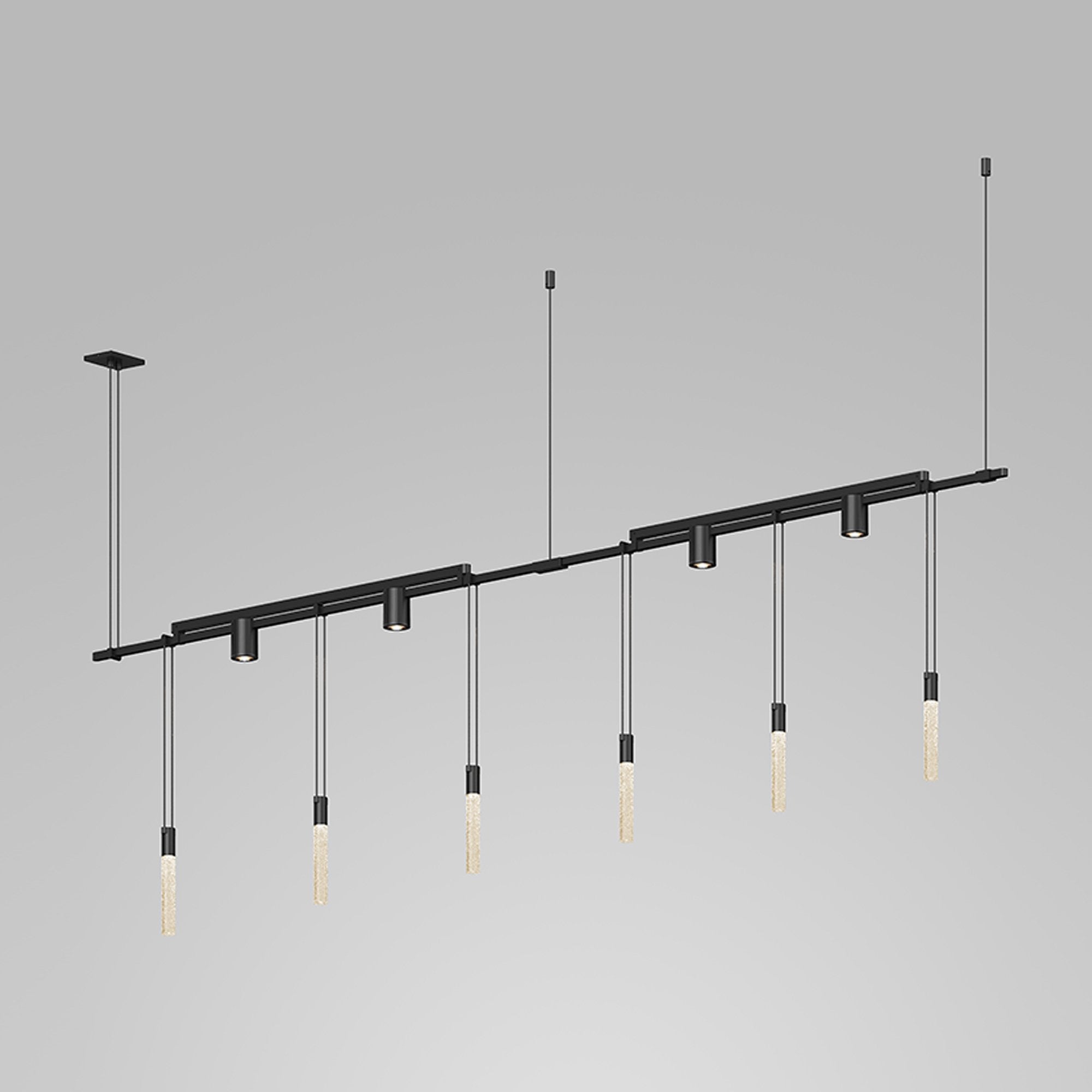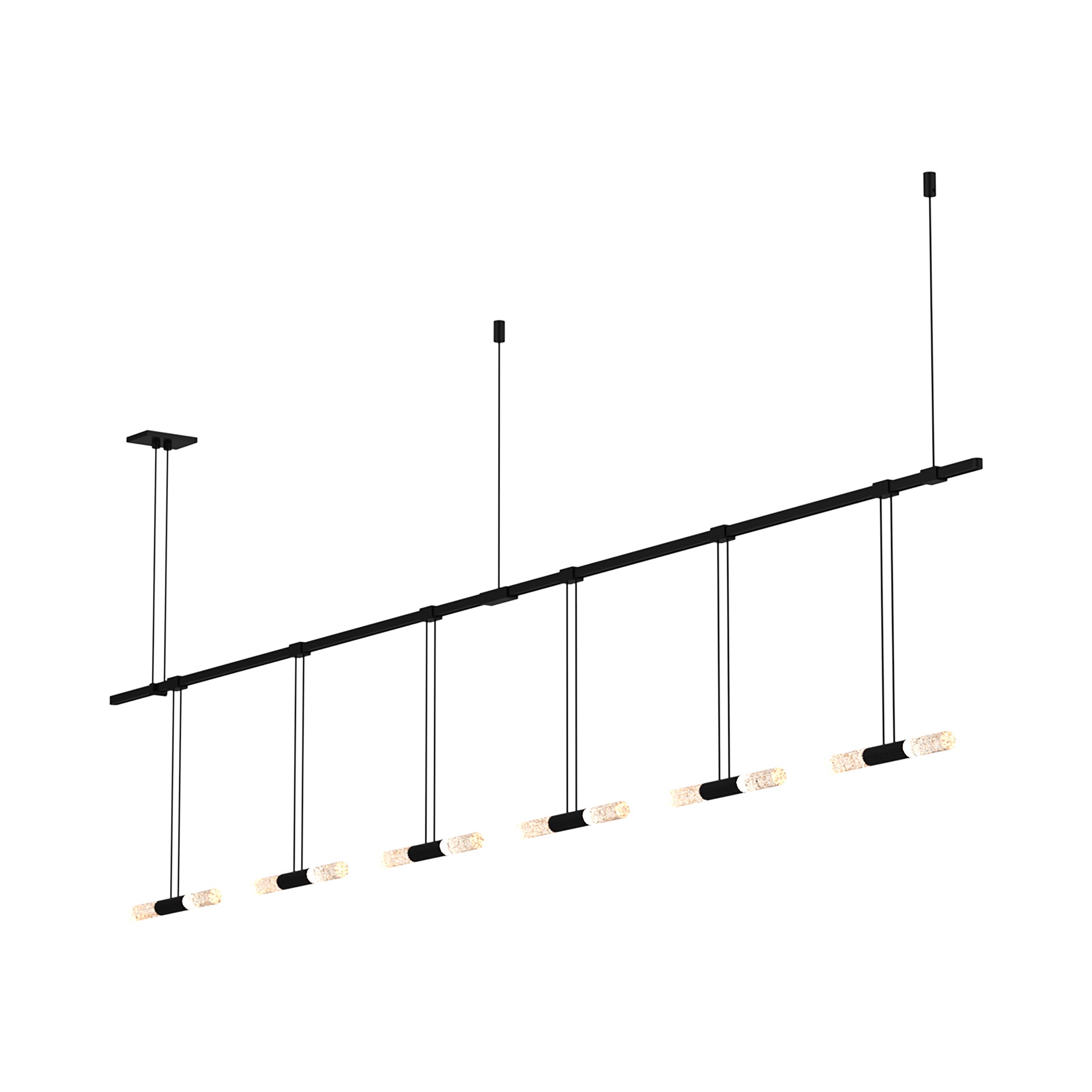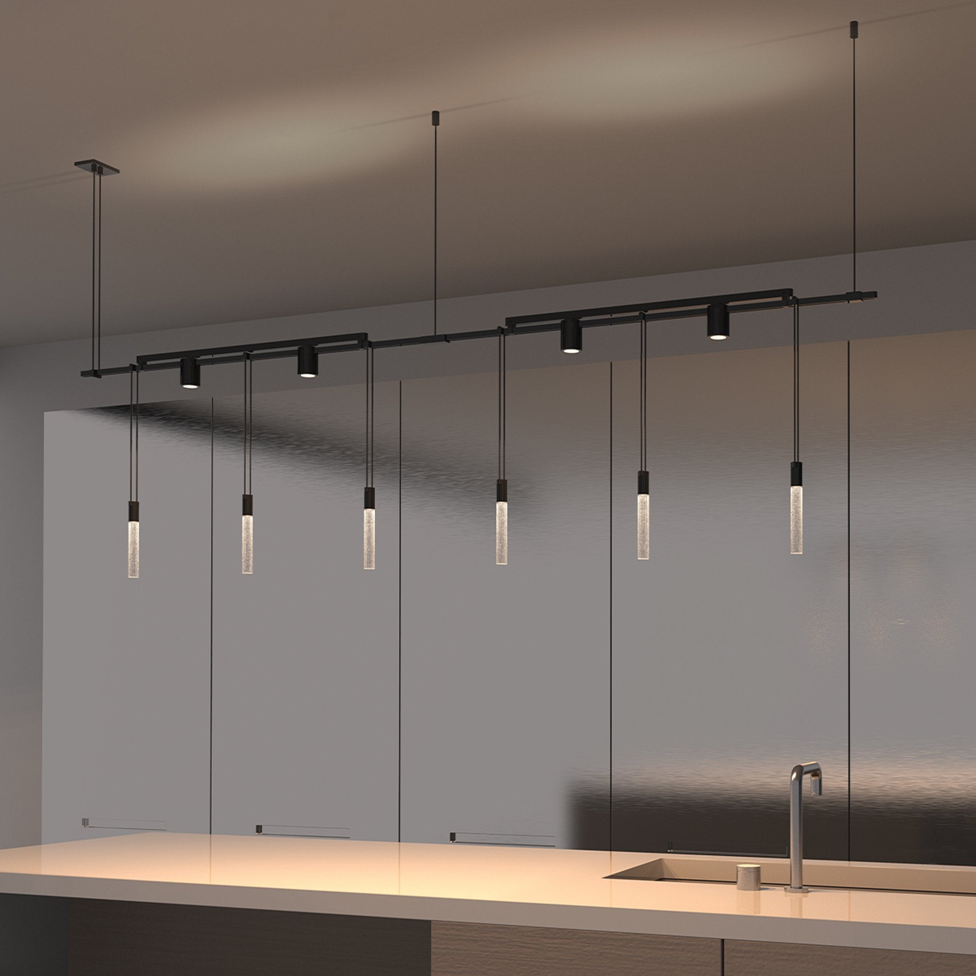 A striking contemporary aesthetic mixing geometric with artisanal offers a studio-inspired industrial feel to the Suspenders® In-Line Linear LED Pendant Light from Sonneman Lighting, embracing a linear silhouette with a dye-cast aluminum frame and diffusers featuring either ribbed seeded crystal or acrylic shades.