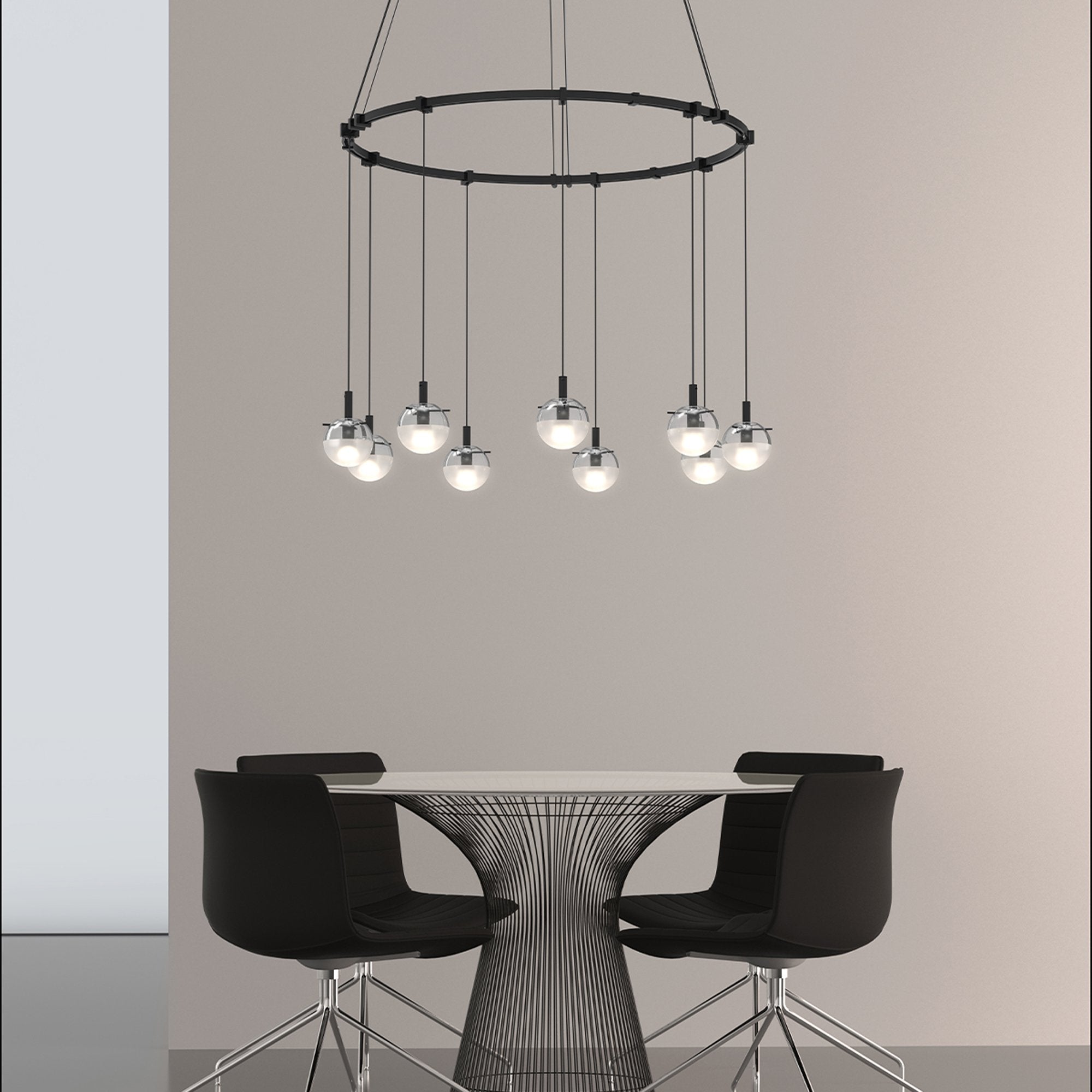 Chic transitional style reflects an industrial motif when the Suspenders® Ring LED Pendant Light from Sonneman Lighting offers a festive circular silhouette and strands of dangling lenses available in a selection of materials suitable for customizing a dining or living area.