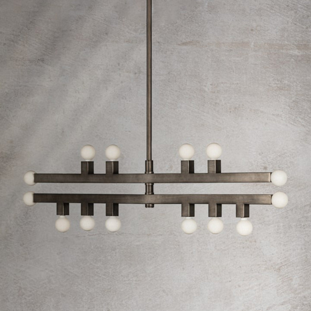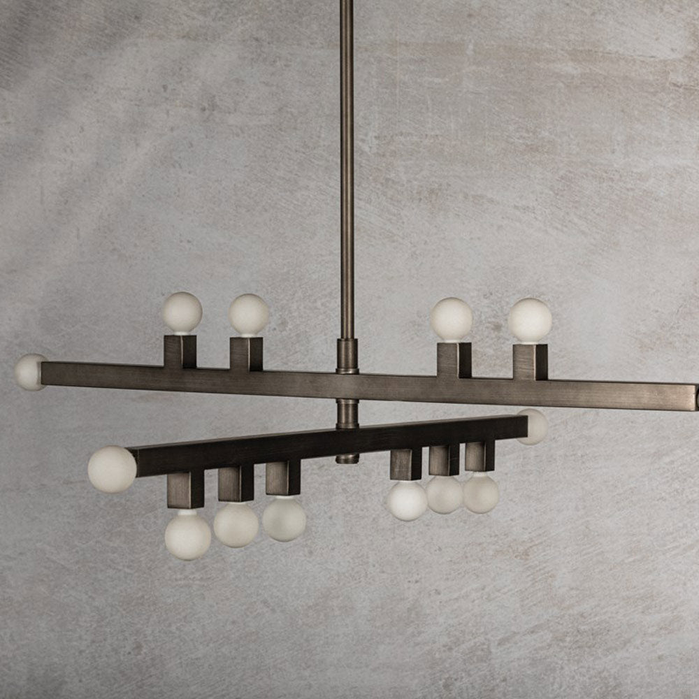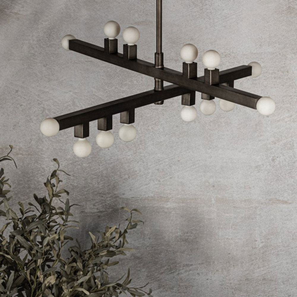 Asymmetry takes center stage in the compelling intersectionality of the Sutter Chandelier from Mitzi. Drawing inspirations from the paintings of Mondrian, its linear form juxtaposes parallel and intersecting design elements and dots them with petite globe lights that glow with warmth and sophistication over a dining table or kitchen island.