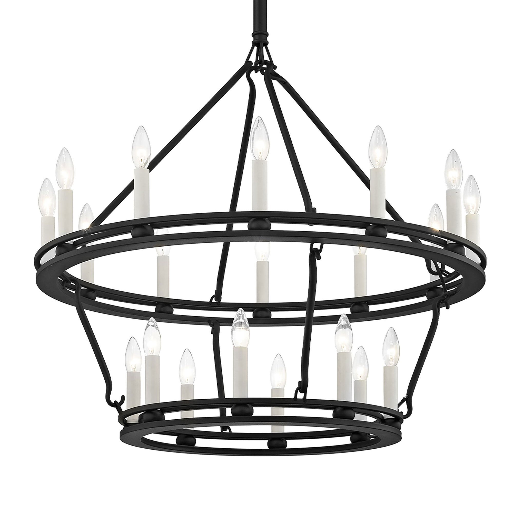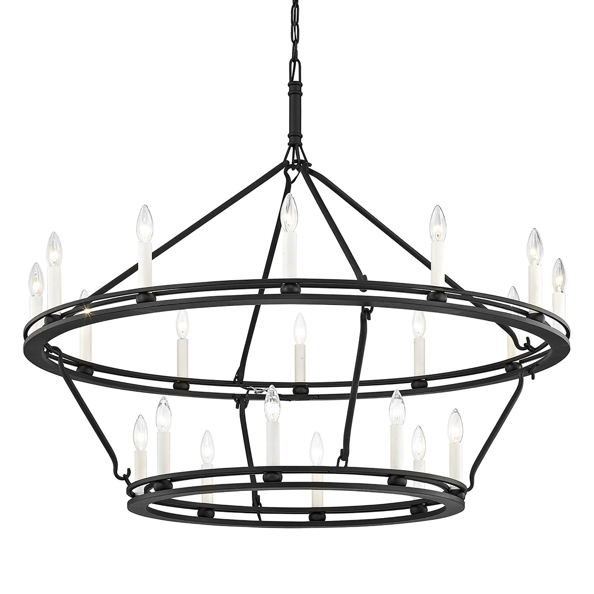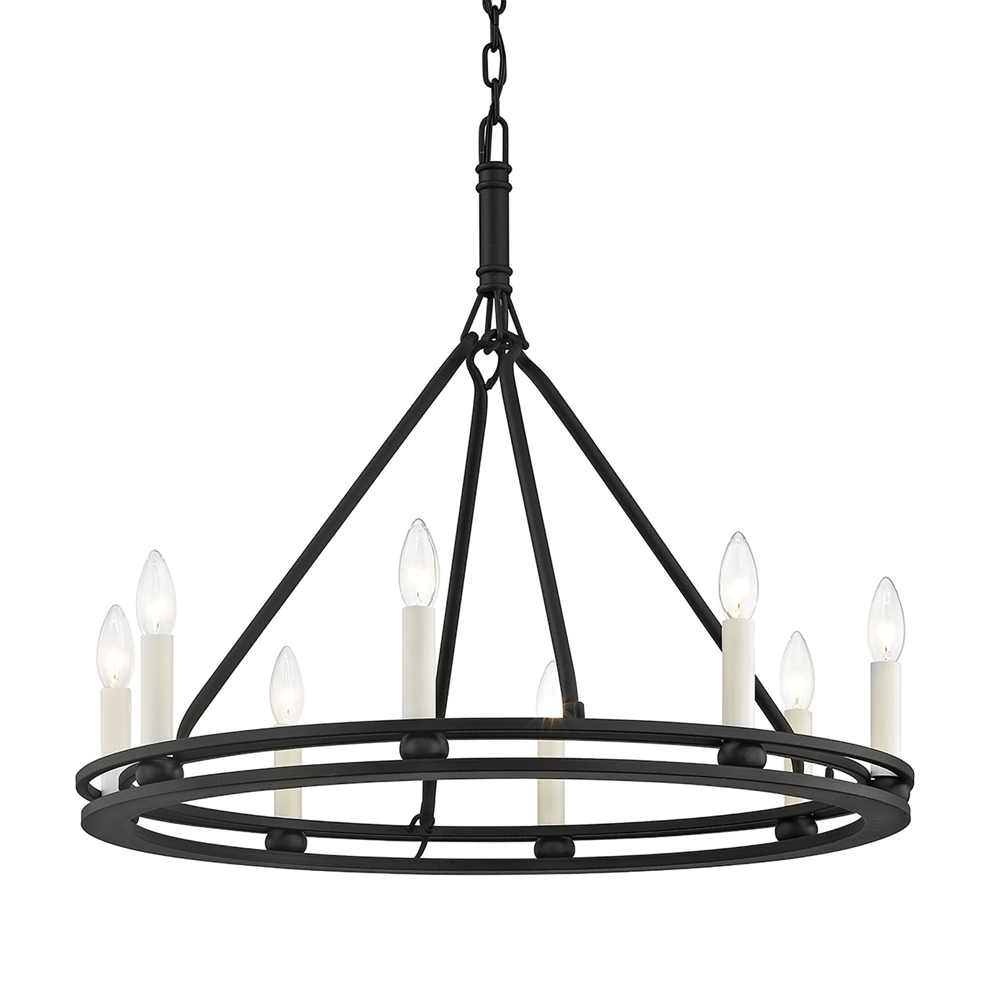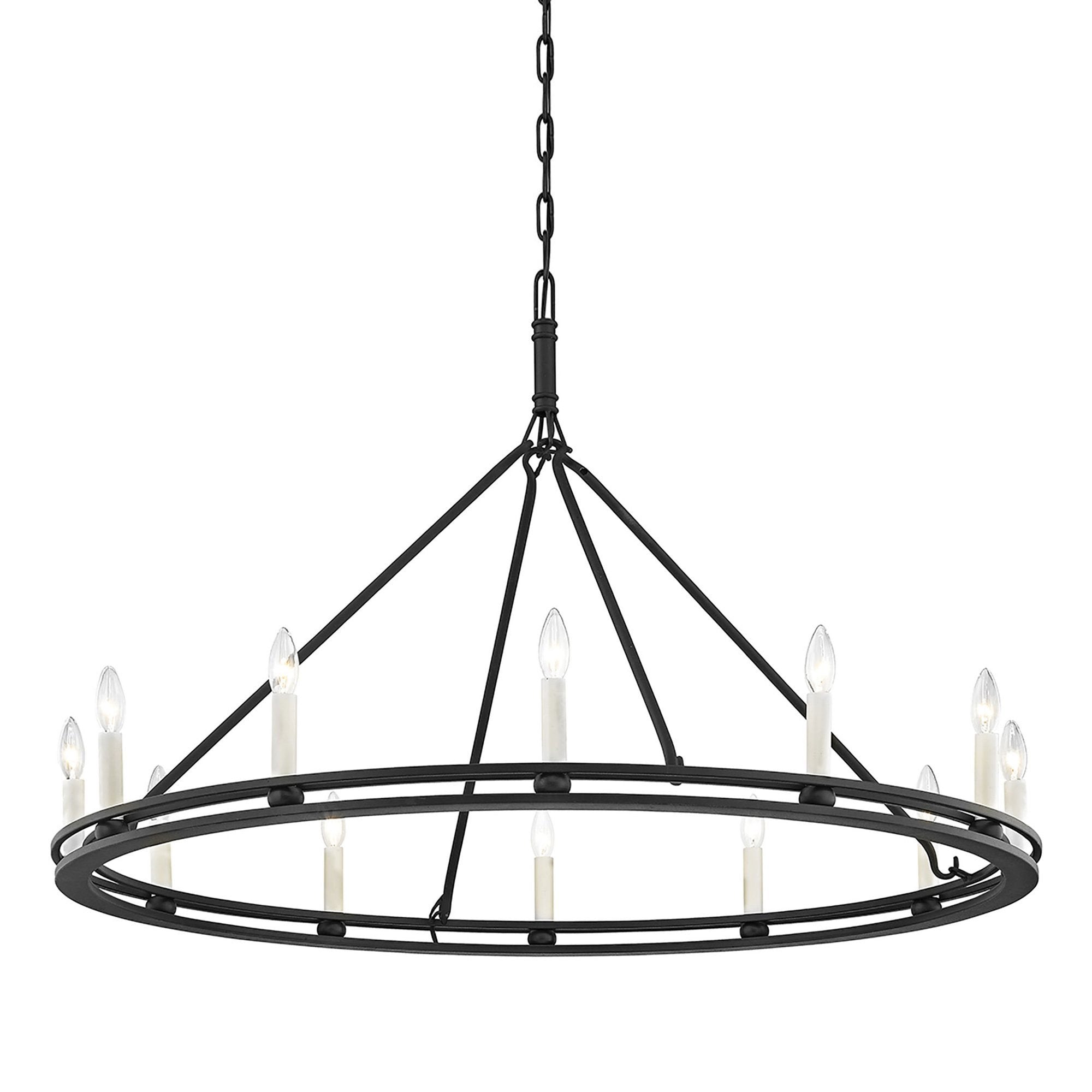 Light and airy, the Sutton Chandelier from Troy Lighting pairs a wagon wheel silhouette with unadorned candles for a simple, authentic look and feel.