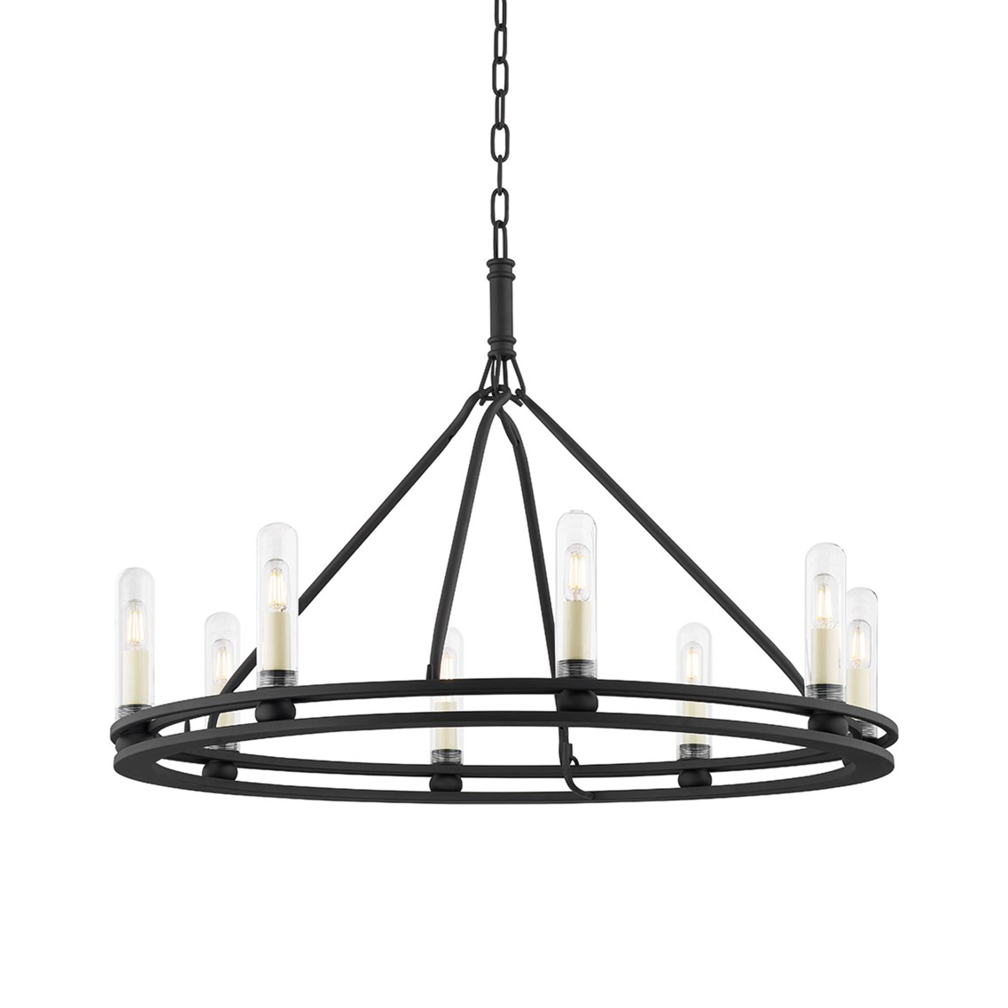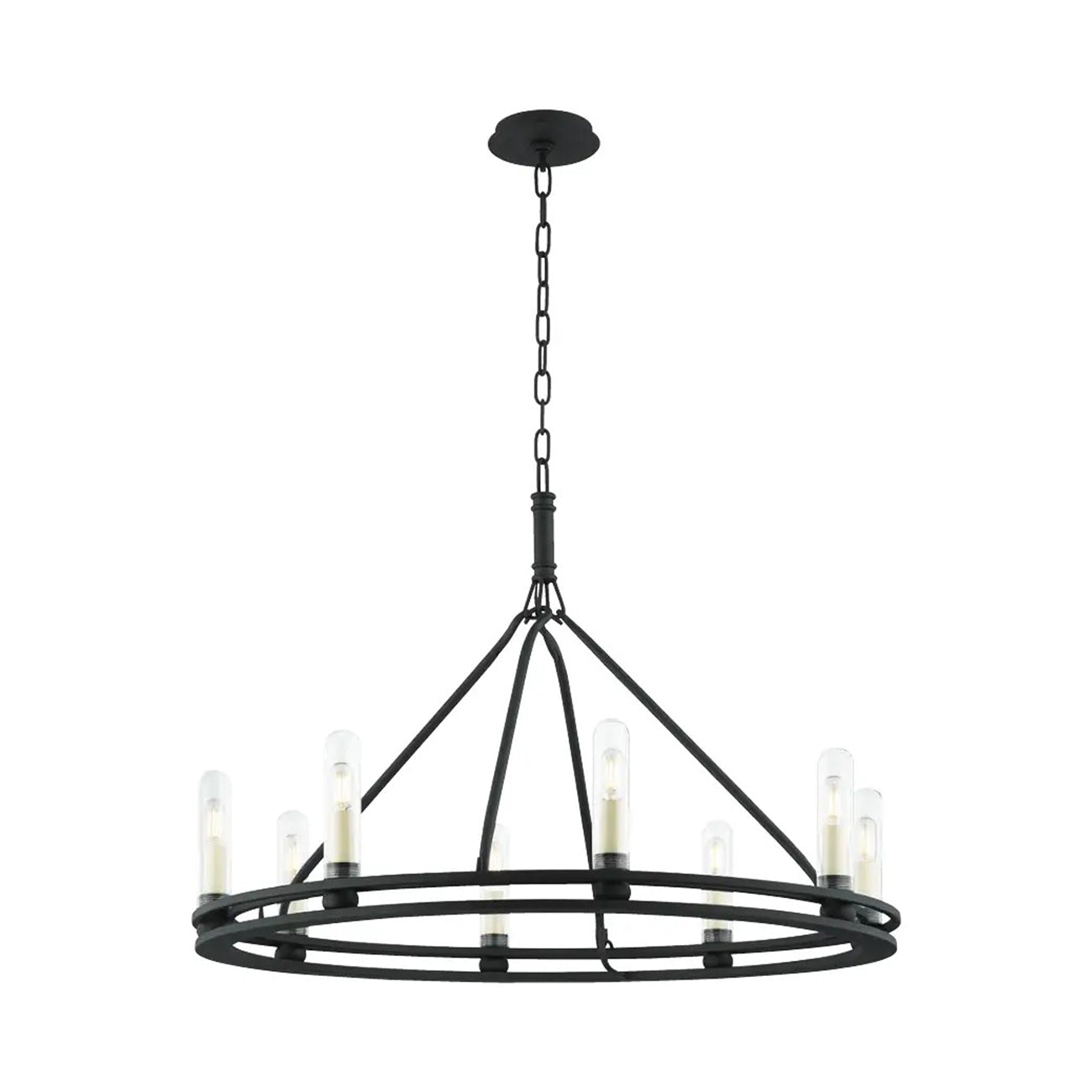 Recreate a Euro castle motif with an exterior fixture that sends an iconic dose of chic outdoors. A dual ring frame styled of textured black metal embellishes outlines of a light that illuminates a large patio ensemble or gazebo. The Sutton Outdoor Chandelier from Troy Lighting completes its rugged glam look with delicate candlestick holders.