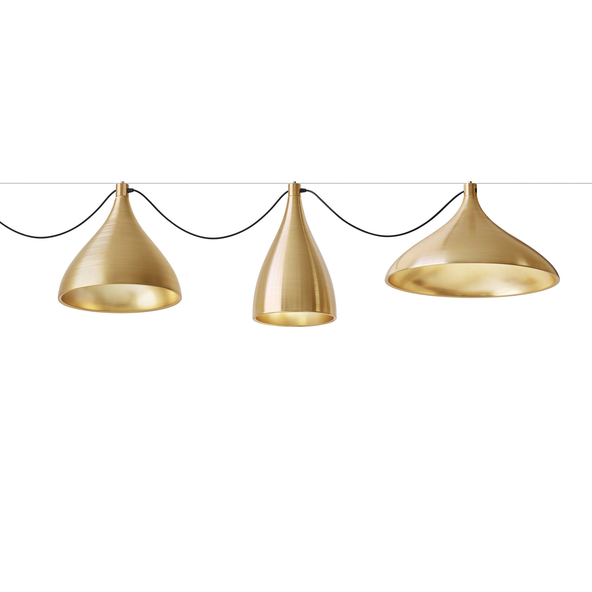 With purposeful mismatching, artisans producing the Swell LED String Mixed Pendant Light from Pablo create a visually delightful look perfect for a horizontal kitchen island or dining space. These lights offer various sizes and finishes of contoured aluminum shades that form cohesion within their differences. Industrial character offers an energetic boost to a soft, romantic silhouette in each light.