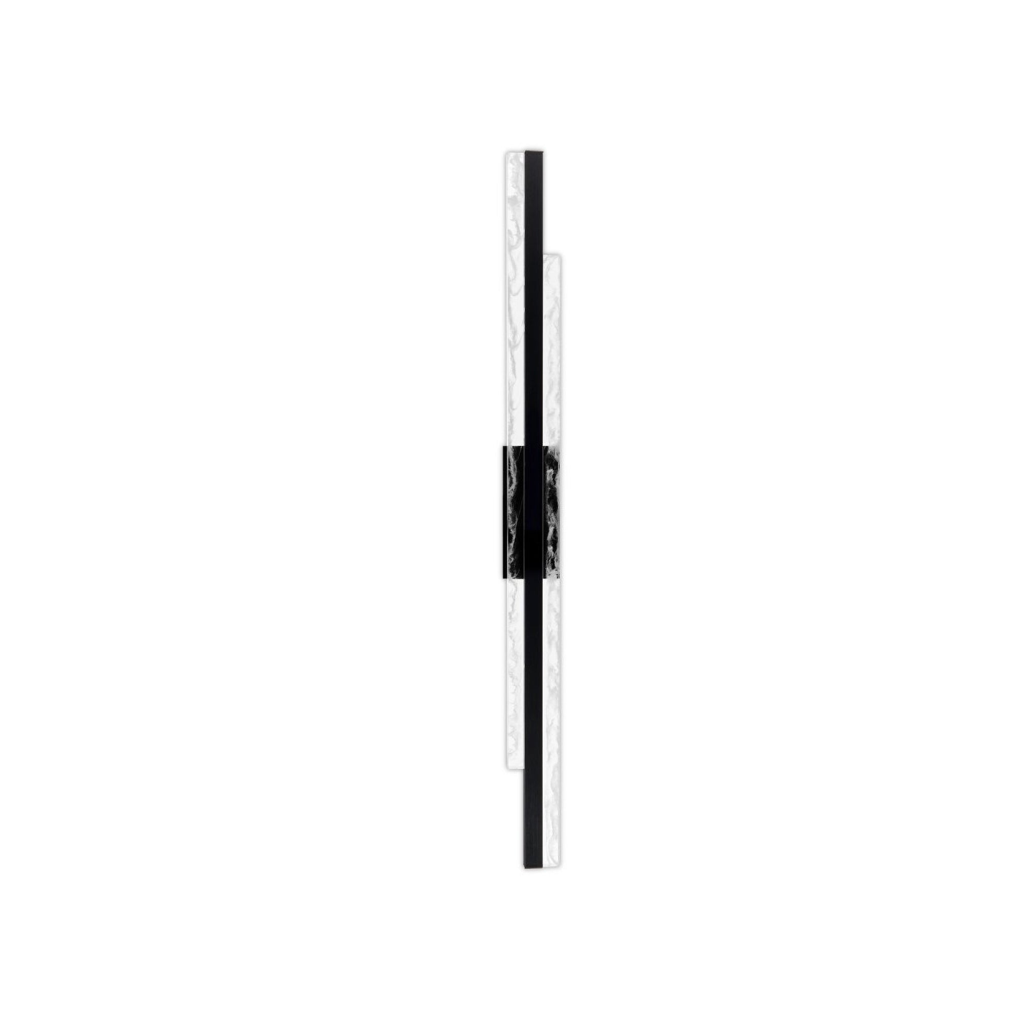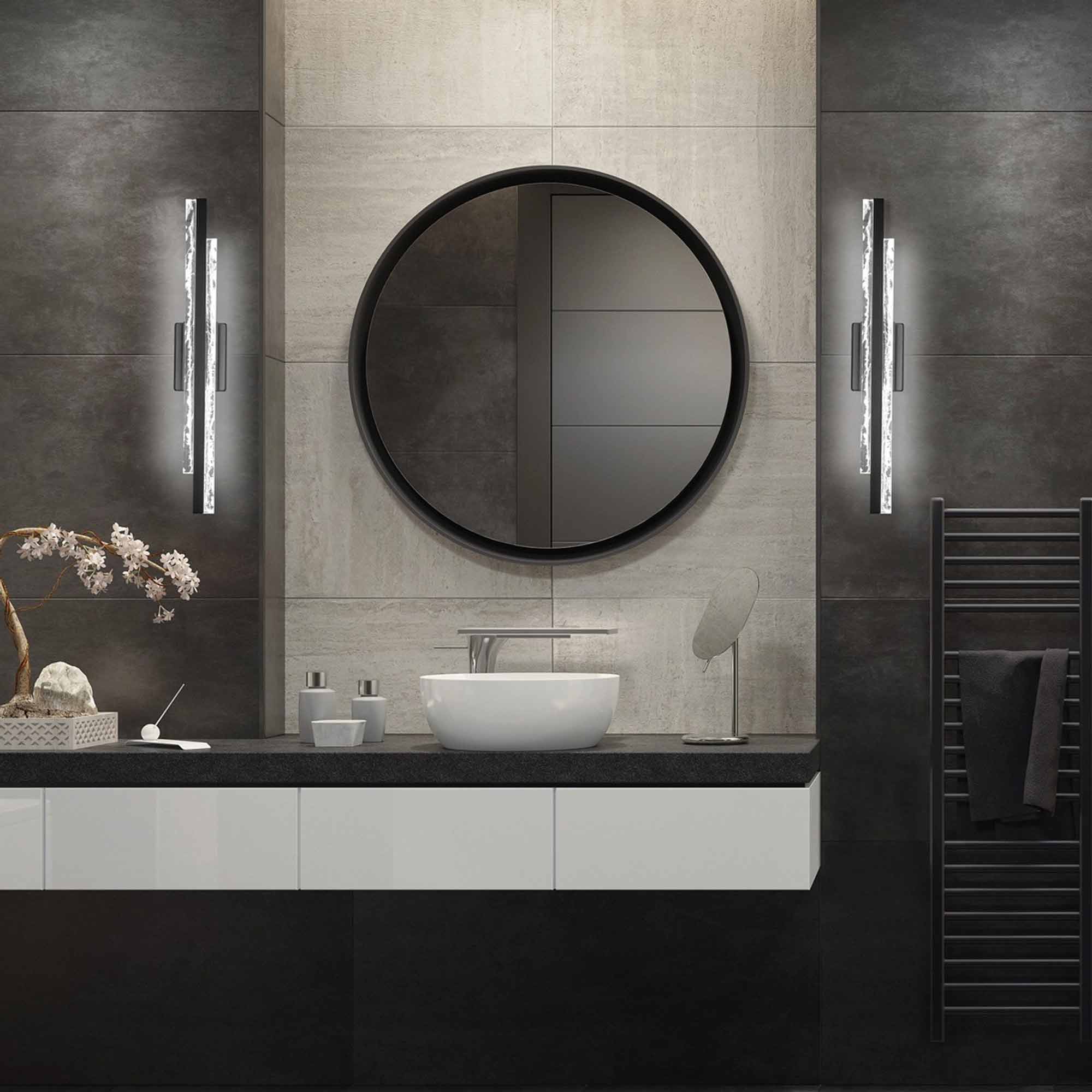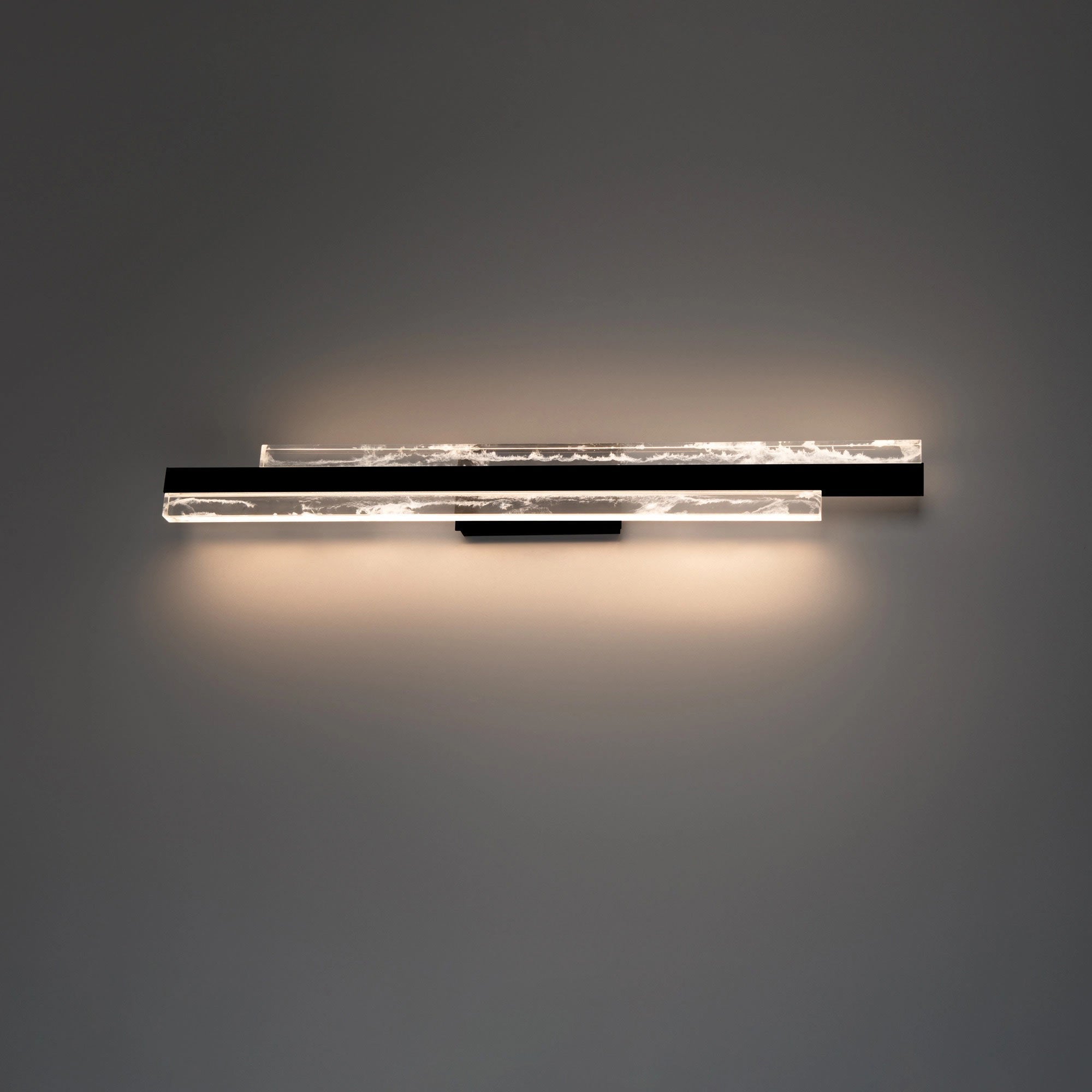Asymmetrical elegance in Lumosity. Double blocks of cloudy acrylic sandwich a metal bar. Artisan crafted for all orientations around your vanity in a fine bath.