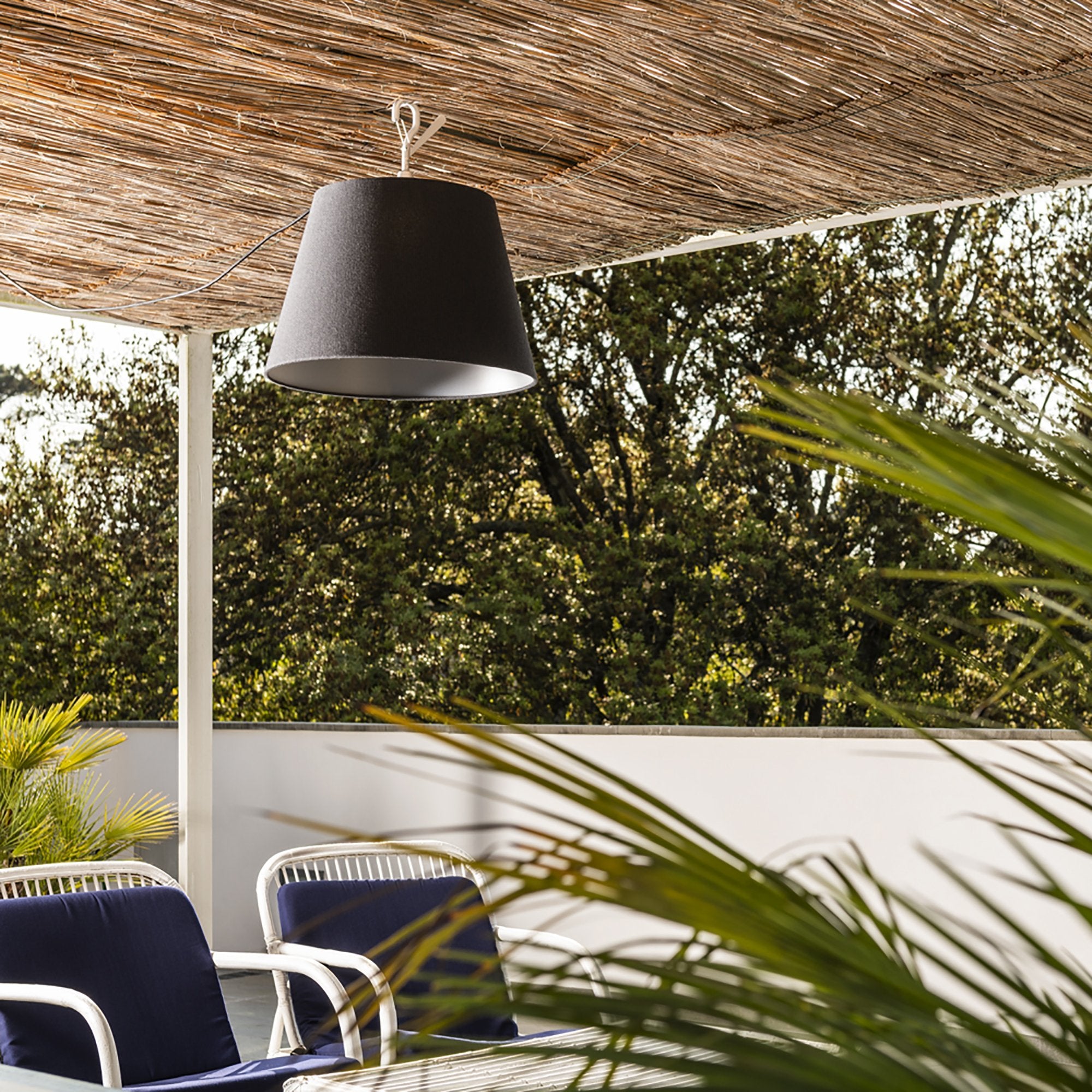 Simple and stylish in your inviting exterior living room, the Tolomeo Outdoor Hook LED Semi-Flush Mount Ceiling Light from Artemide is an energy efficient choice.
