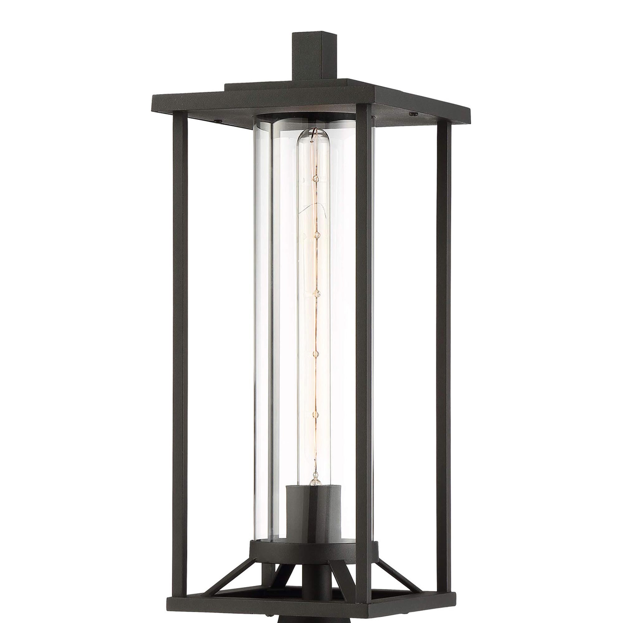 Sophisticated and contemporary, the Trescott Outdoor Post Light from The Great Outdoors leans on a minimalist vibe with an open metal frame dressed up with subtle accents. A bold black finish and clear glass construction of a slender, elongated bulb is in keeping with a stately design perfect for highlighting custom landscaping or walkways.